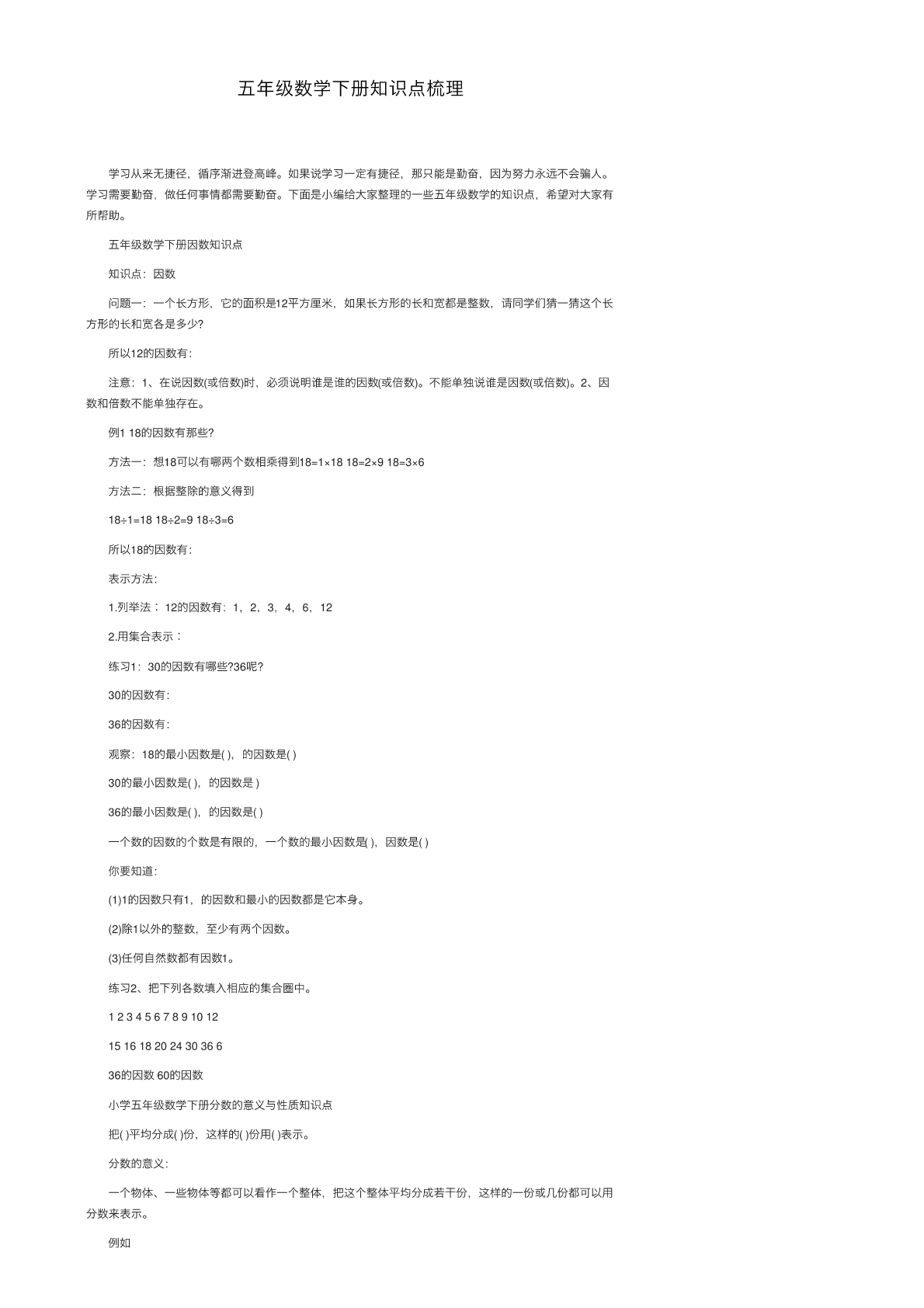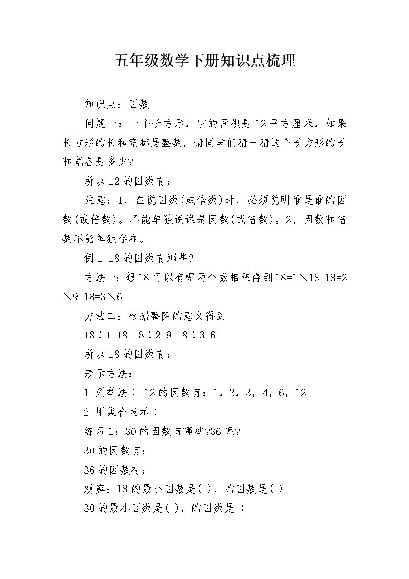 五年级数学下册知识点梳理知识点:因数问题一:一个长方形,它的面积是12平方厘米,如果长方形的长和宽都是整数,请同学们猜一猜这个长方形的长和宽各是多少?所以12的因数有:注意:1、在说因数(或倍数)时,必须说明谁是谁的因数(或倍数)。不能单独说谁是因数(或倍数)。2、因数和倍数不能单独存在。例118的因数有那些?方法一:想18可以有哪两个数相乘得到18=1×1818=2×918=3×6方法二:根据整除的意义得到18÷1=1818÷2=918÷3=6所以18的因数有:表示方法:1.列举法︰12的因数有:1,2