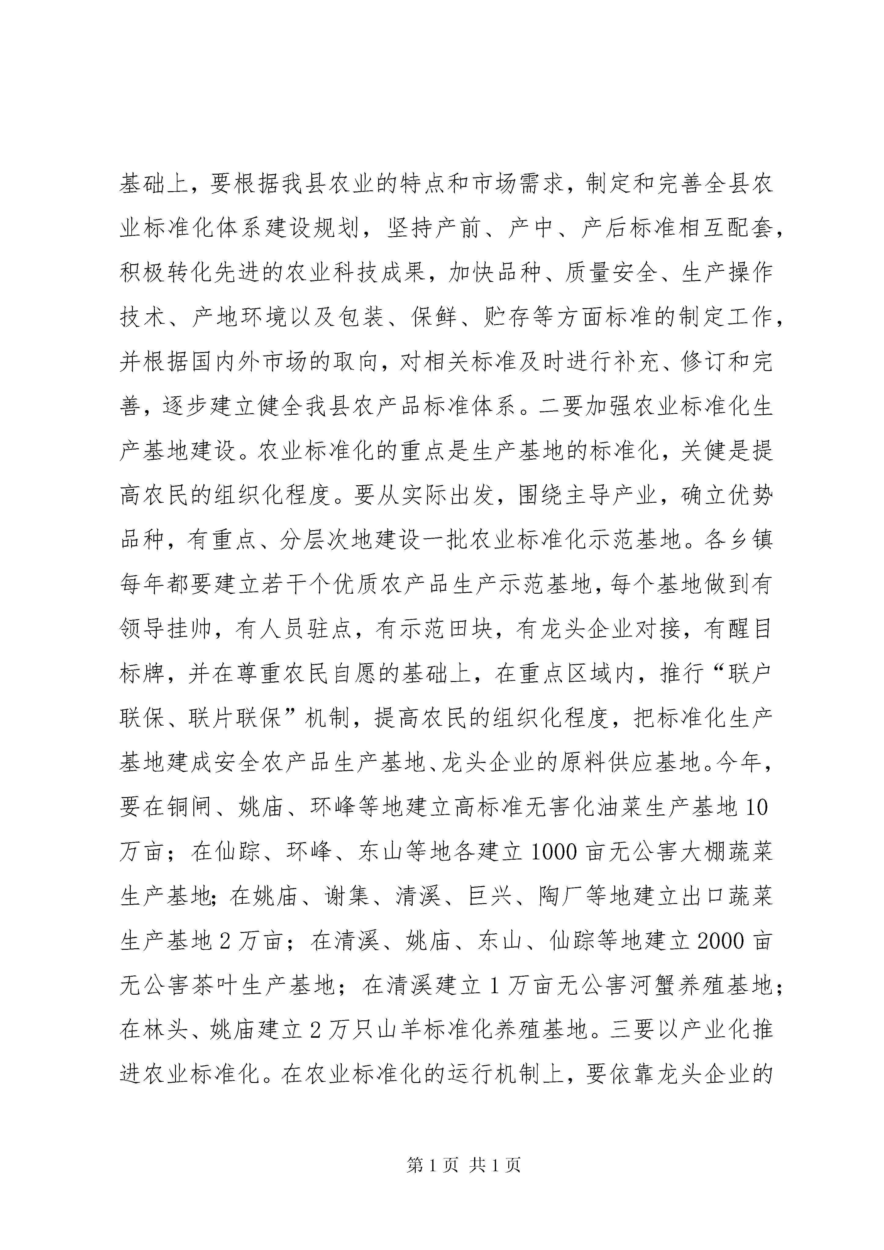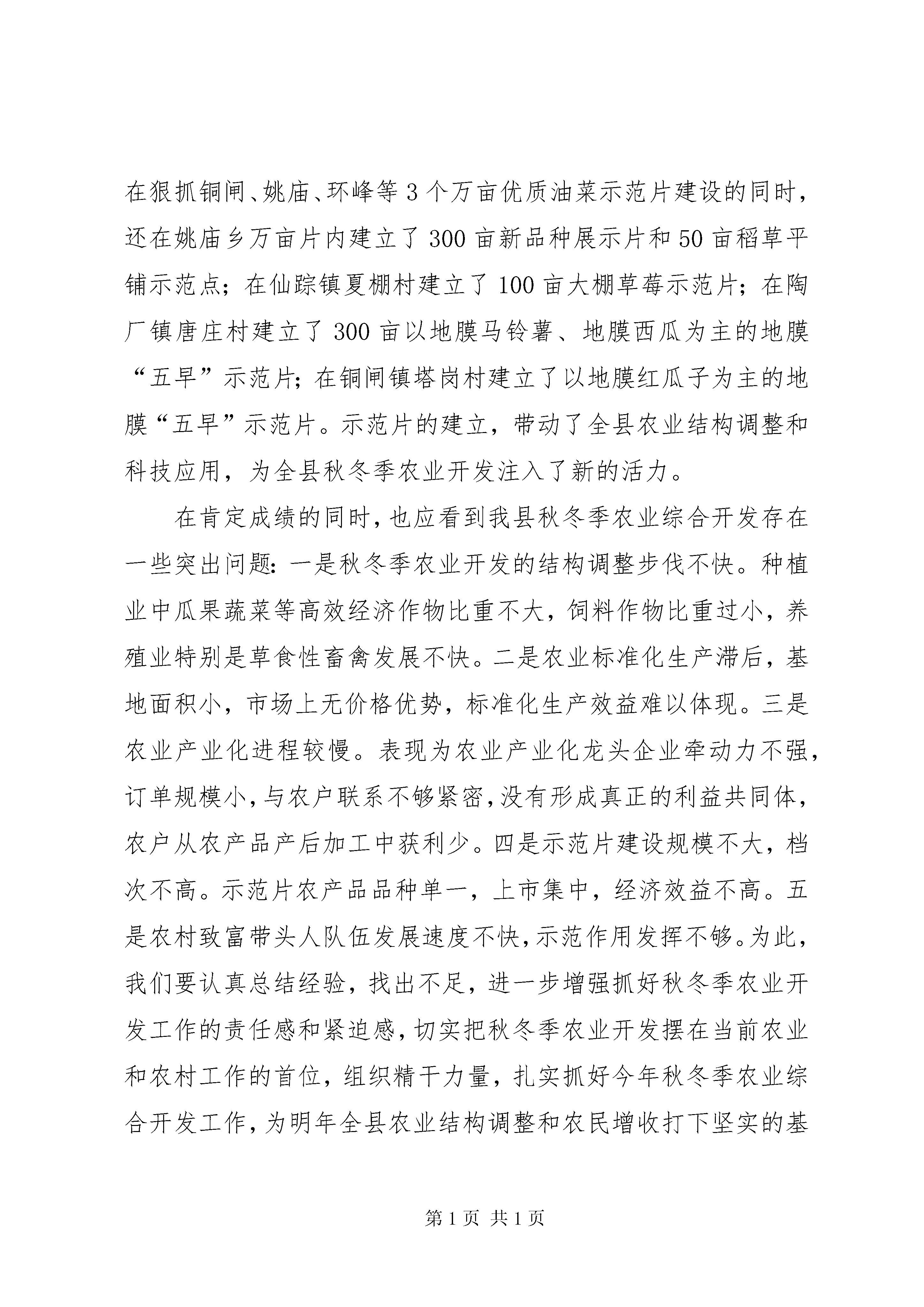 在全县秋冬季农业开发工作会议上的讲话同志们:这次会议是县委、县政府召开的一次非常重要的会议。会议的主要任务是,贯彻落实全市秋冬季农业开发暨农业标准化现场会精神,总结去年以来农业开发工作,分析当前农业开发面临的新情况、新问题,研究部署今年秋冬季农业开发工作。这次会议虽然时间不长,但规格很高,县几大班子负责人都到会,陈县长还要作重要讲话。下面,我先讲三点意见。一、肯定成绩,找准差距,充分认识抓好秋冬季农业开发工作的责任感和紧迫感2002年秋冬季,我们克服了春季连续阴雨寡照和农作物病害
