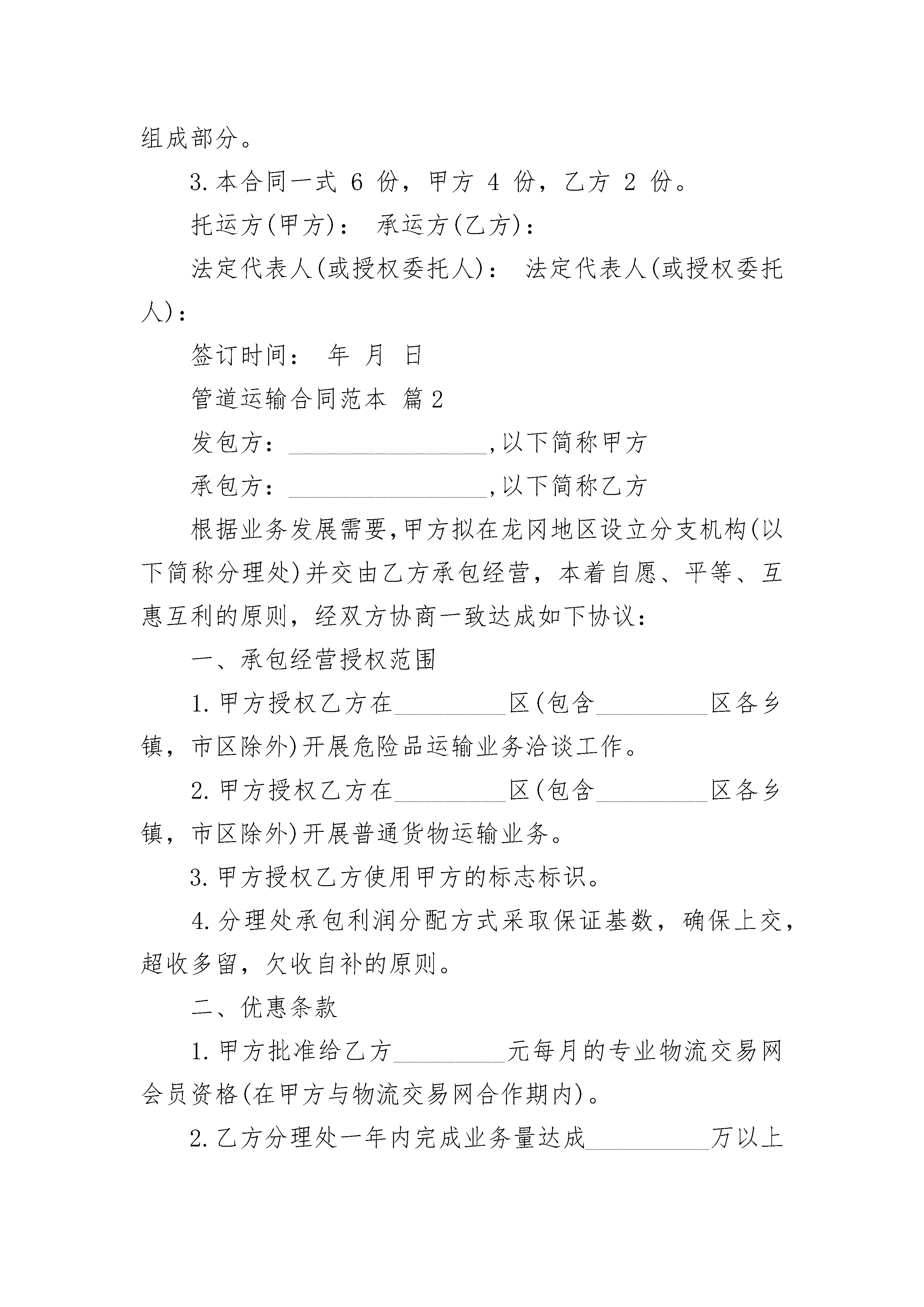 此资料由网络收集而来如有侵权请告知上传者立即删除。资料共分享我们负责传递知识。6管道运输合同范本2篇在运输合同中承运人的主要义务包括:按约定的时间将旅客运达目的地的义务;不得擅自变更运输路线的义务;保障旅客在运输途中的安全义务;提供必要生活服务的义务。今天范文网小编要与大家分享的是:2篇管道运输合同相关范本具体内容如下欢迎阅读和参考!管道运输合同范本篇一发包方:________________以下简称甲方承包方:________________以下简称乙方根据业务发展需要甲方拟在龙冈