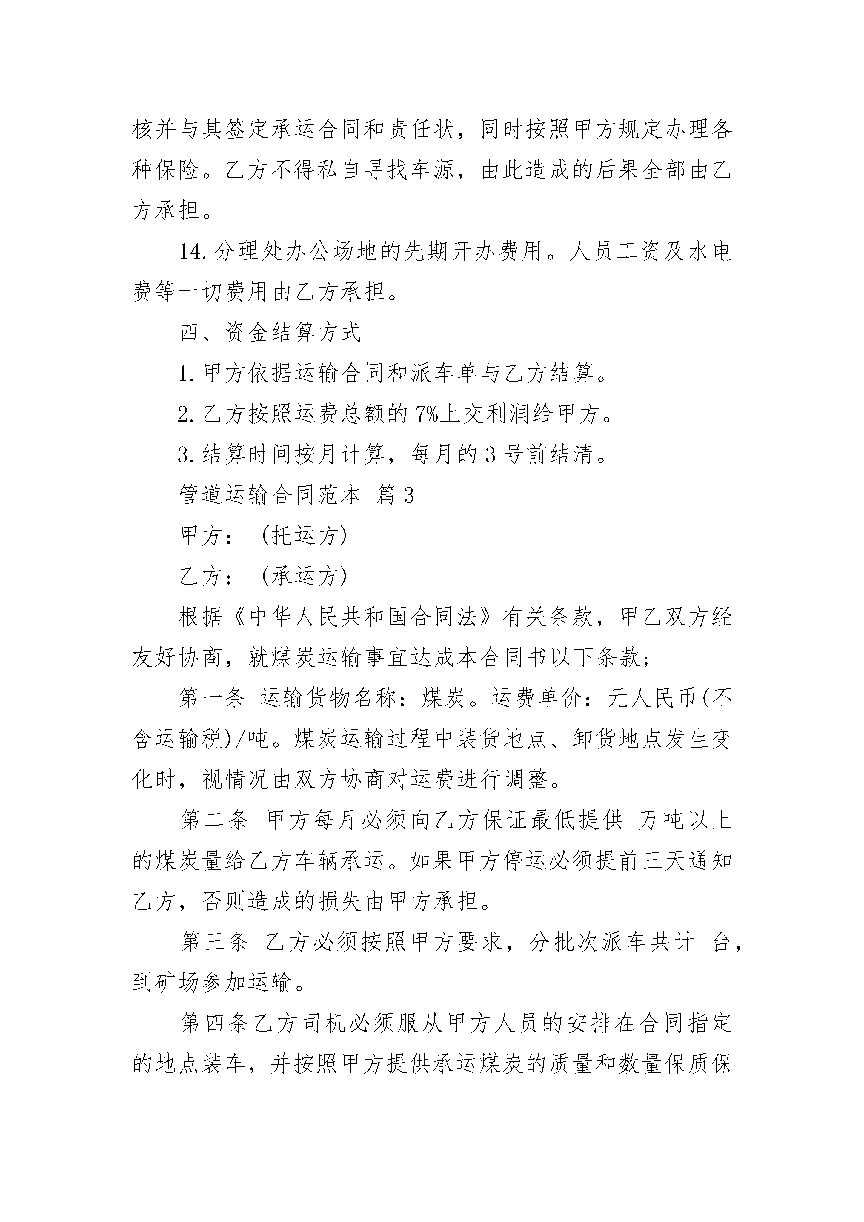 管道运输合同范本管道运输合同范本(精选3篇)管道运输合同范本篇1合同编号:托运方(甲方):××建设集团公司江西天然气管道工程项目部承运方(乙方):××物流运输有限公司根据《中华人民共和国合同法》、中国运输行业相关法律法规等规定,本着自愿、平等、诚实信用的原则,甲乙双方就公路货物运输事宜,协商一致,签订本合同。第一条本合同项下货物名称、规格、货物起运地点、到达地点:φ508×7.1~8.0钢管、弯管、弯头由业主指定防腐厂(暂定××)拉运至江西天然气管网一期工程线路及站场工程第××标段堆管场(甲方指定地点