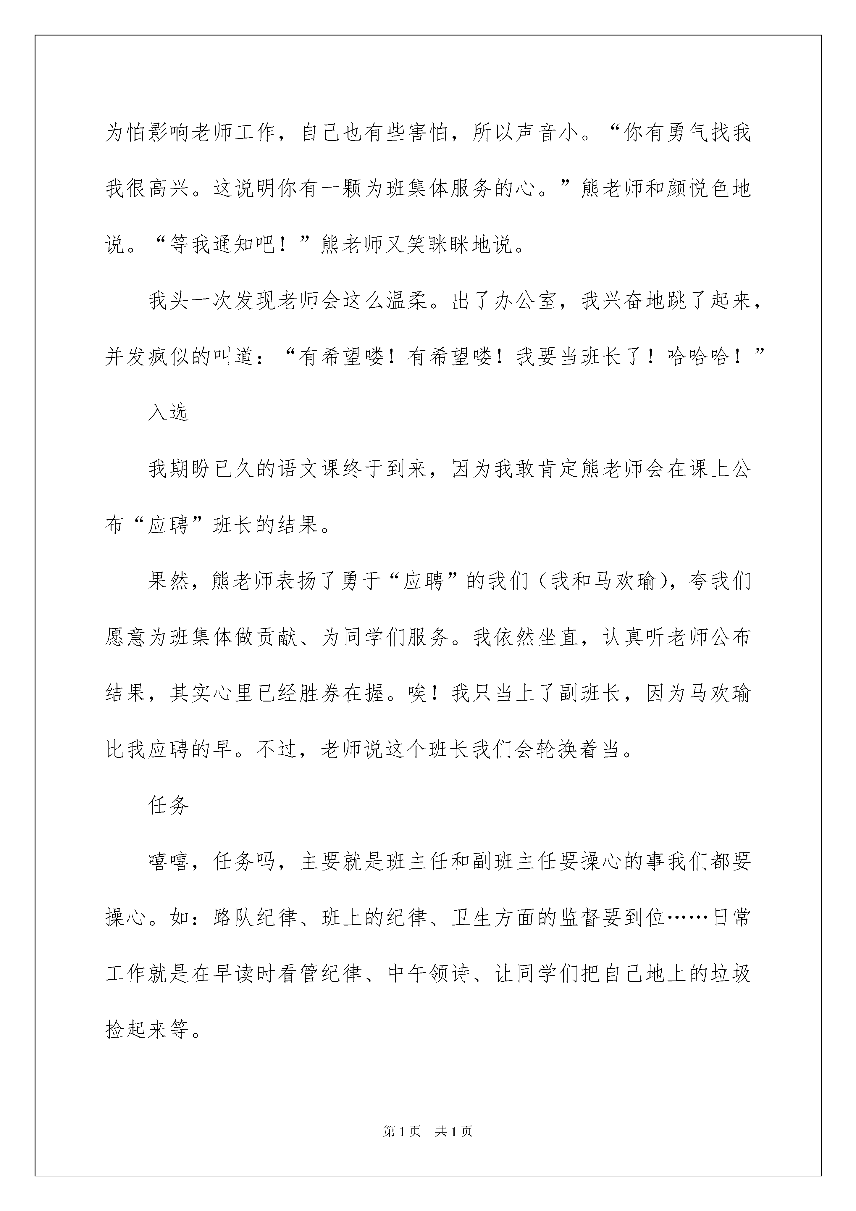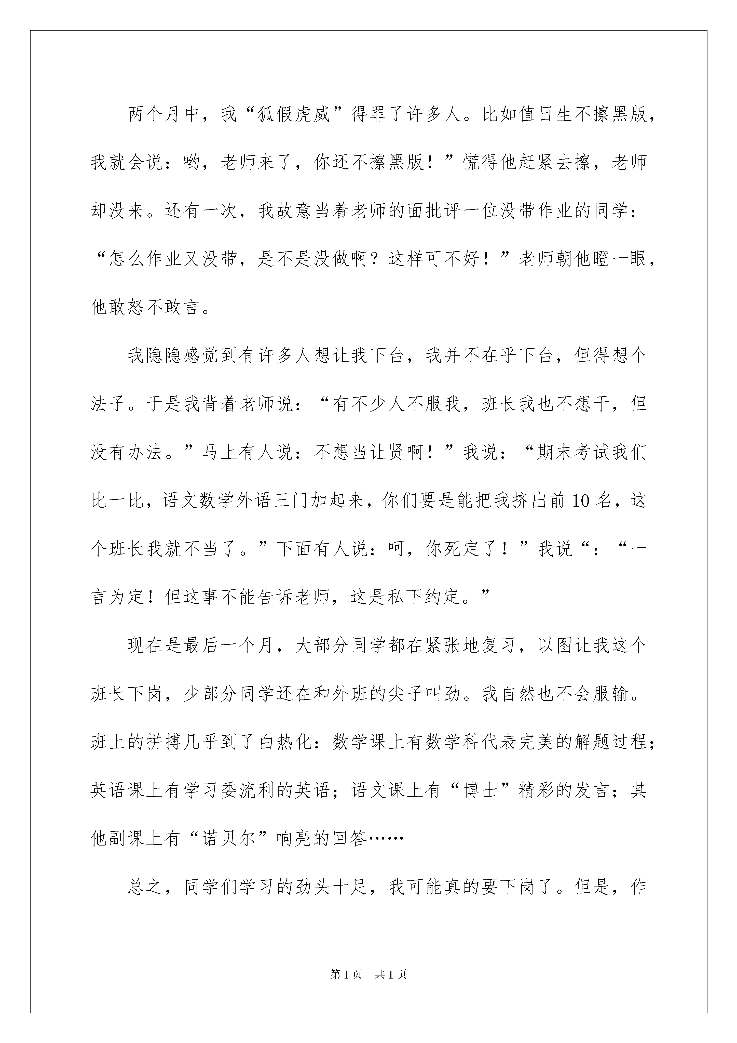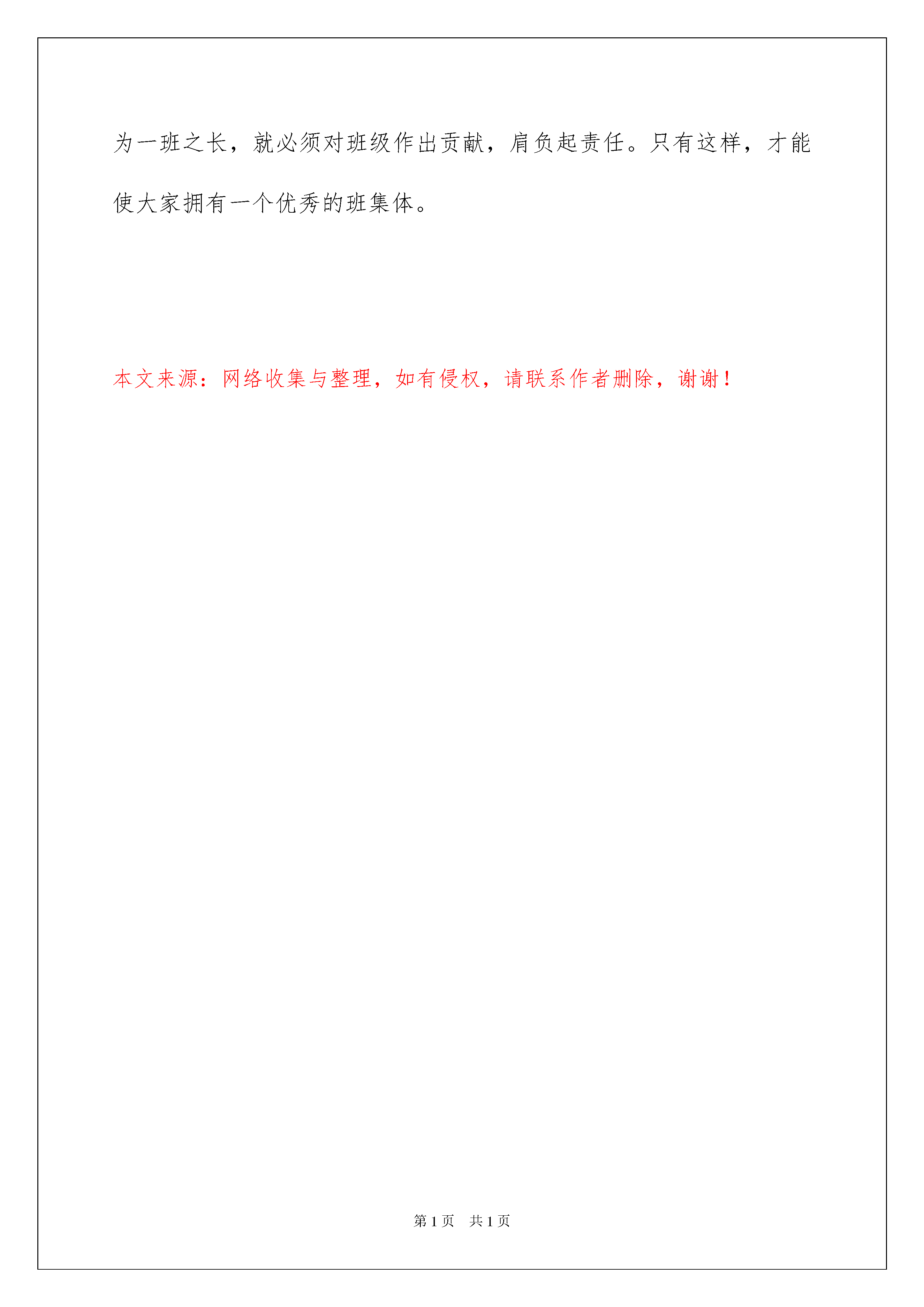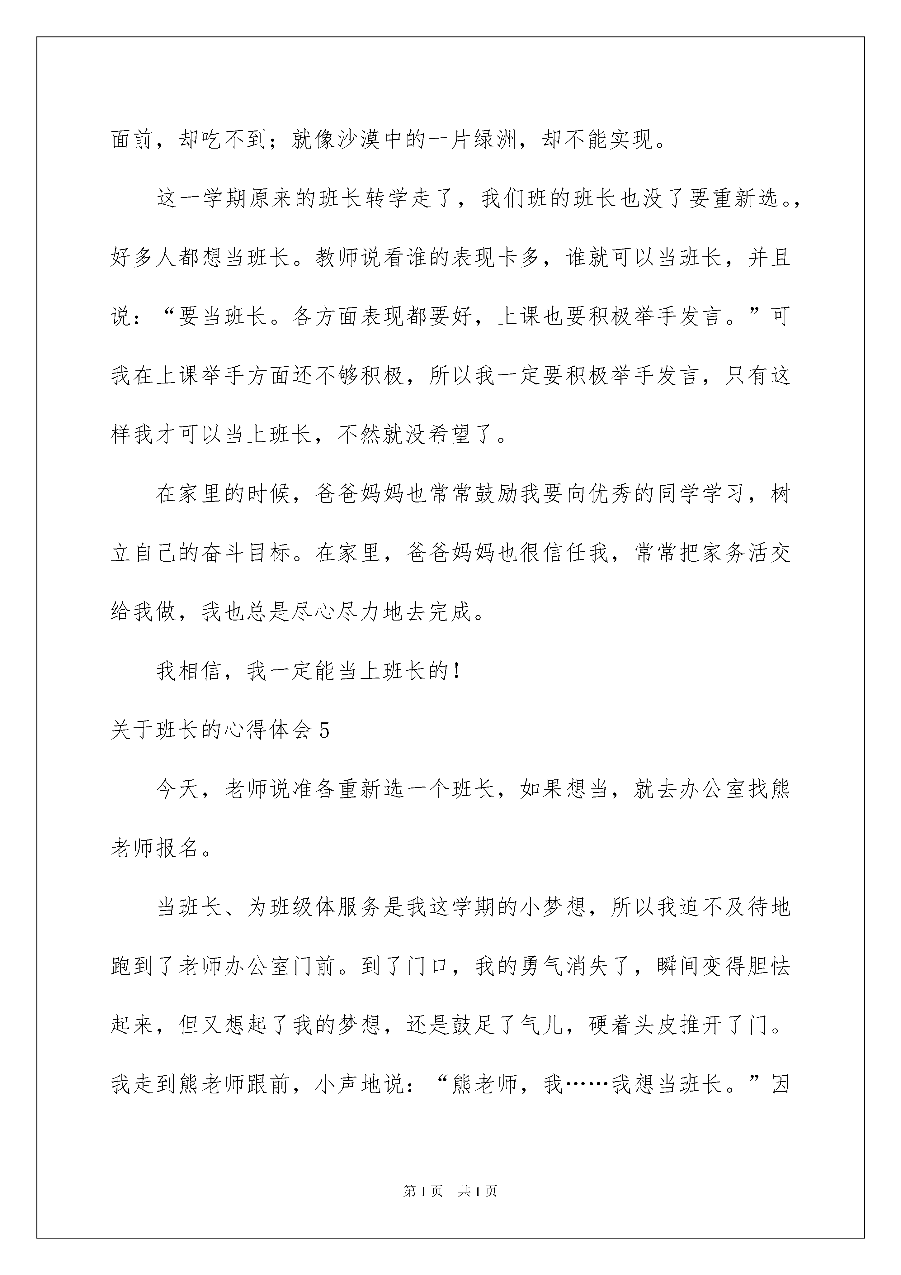 2022关于班长的心得体会班长的心得体会当我们受到启发,对生活有了新的感悟时,不妨将其写成一篇心得体会,让自己铭记于心,通过写心得体会,可使我们今后少走弯路。怎样写好心得体会呢?下面是我为大家整理的关于班长的心得体会,供大家参考借鉴,希望可以帮助到有需要的朋友。关于班长的心得体会1我爱春风和朝霞,也爱小草和鲜花,但更爱落叶,它们像彩色的风筝,常常让我