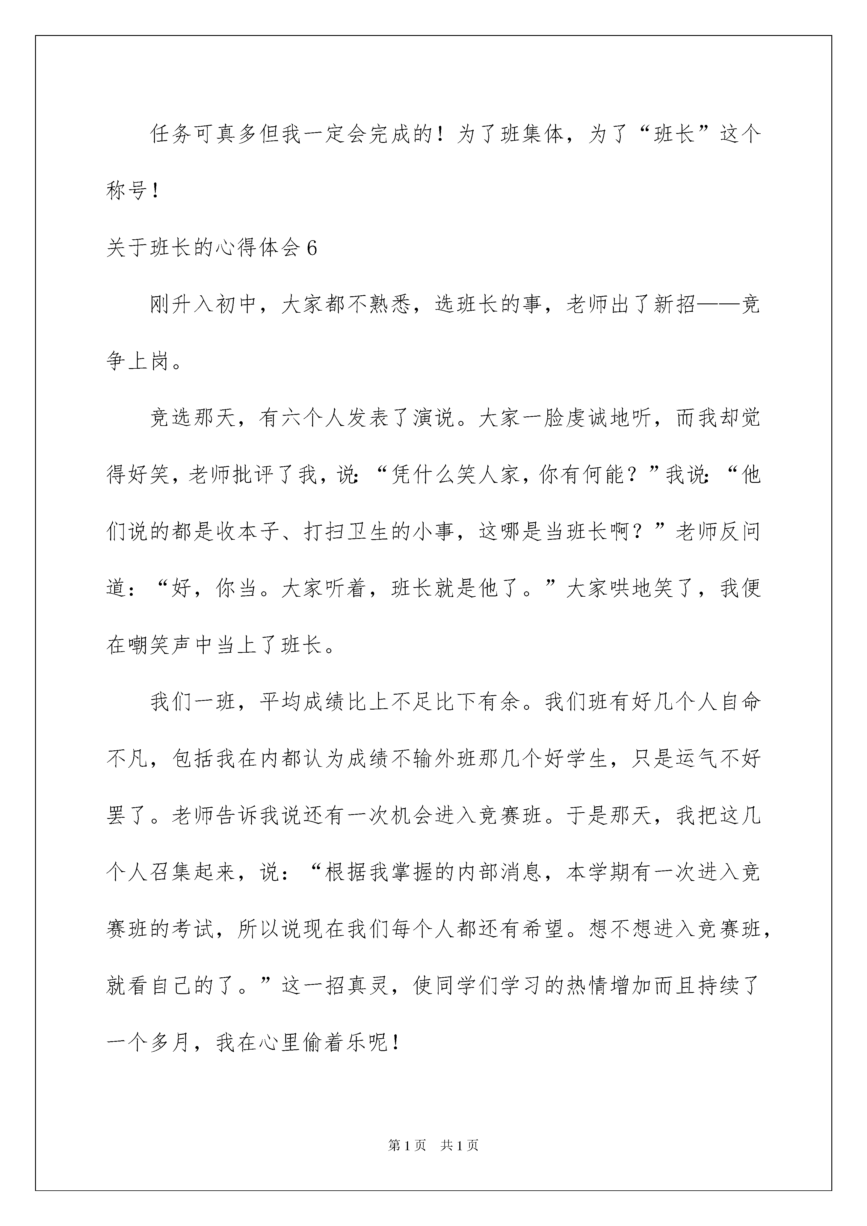 2022关于班长的心得体会班长的心得体会当我们受到启发对生活有了新的感悟时不妨将其写成一篇心得体会让自己铭记于心通过写心得体会可使我们今后少走弯路。怎样写好心得体会呢?下面是我为大家整理的关于班长的心得体会供大家参考借鉴希望可