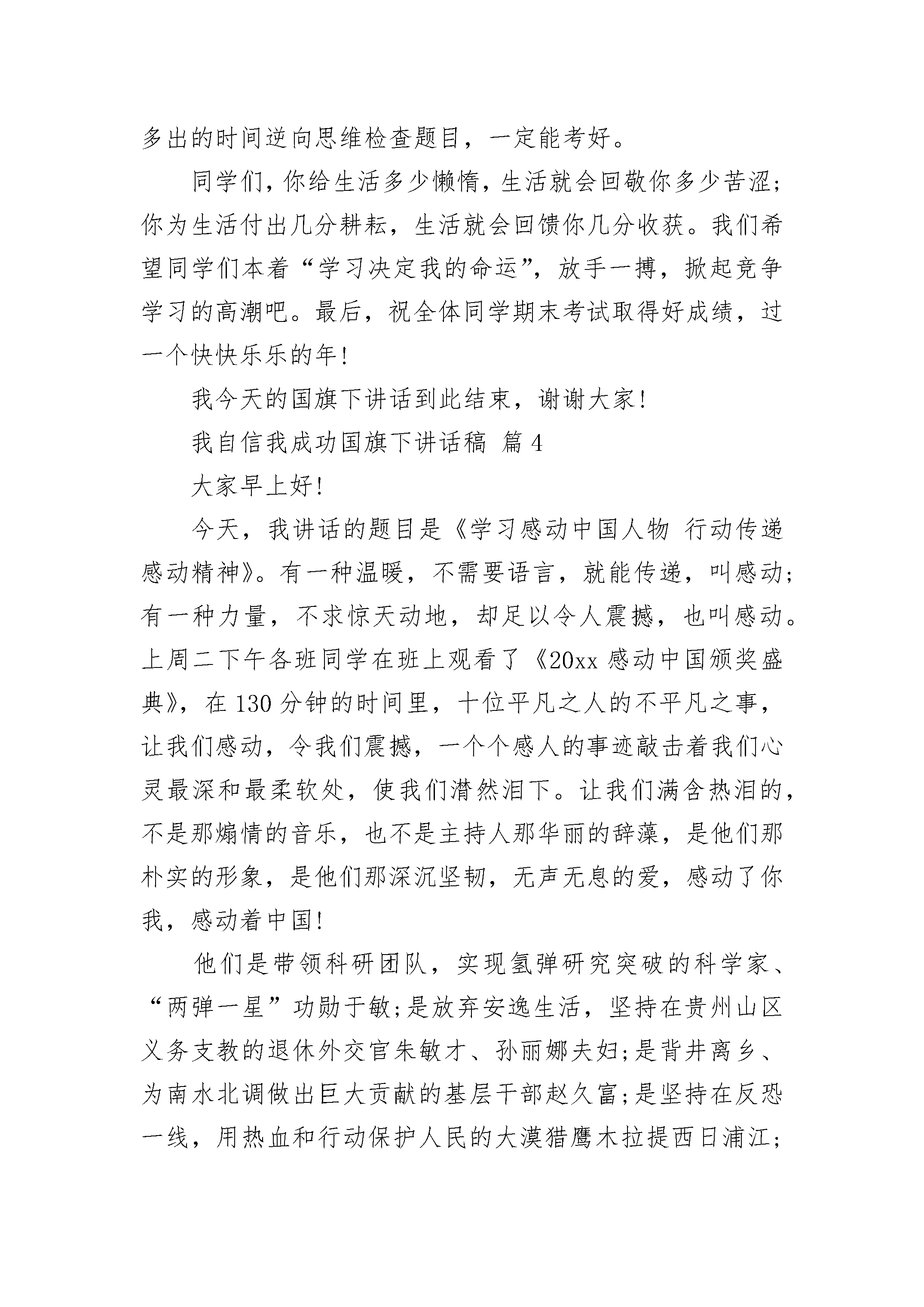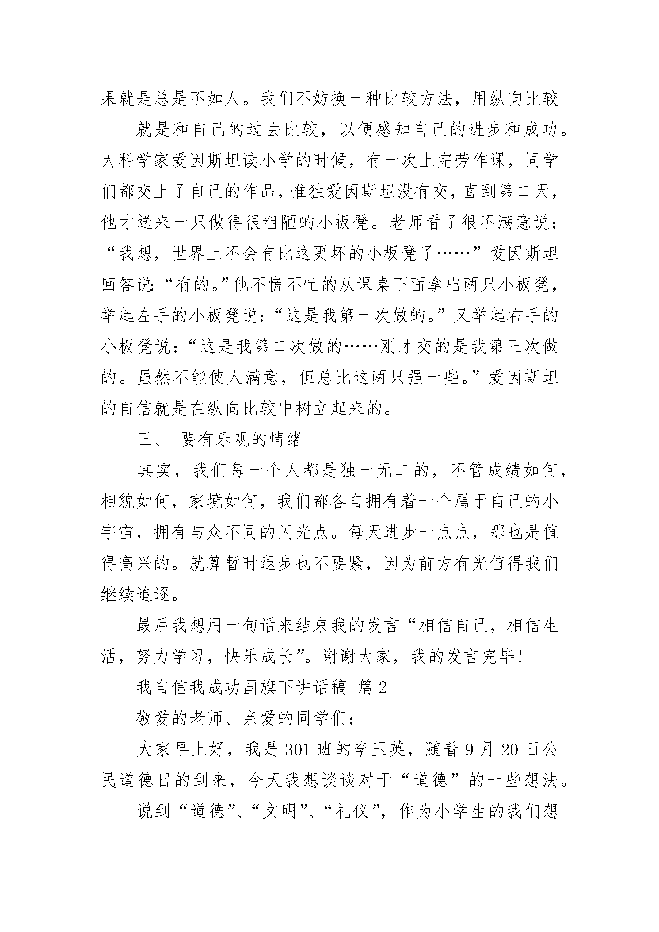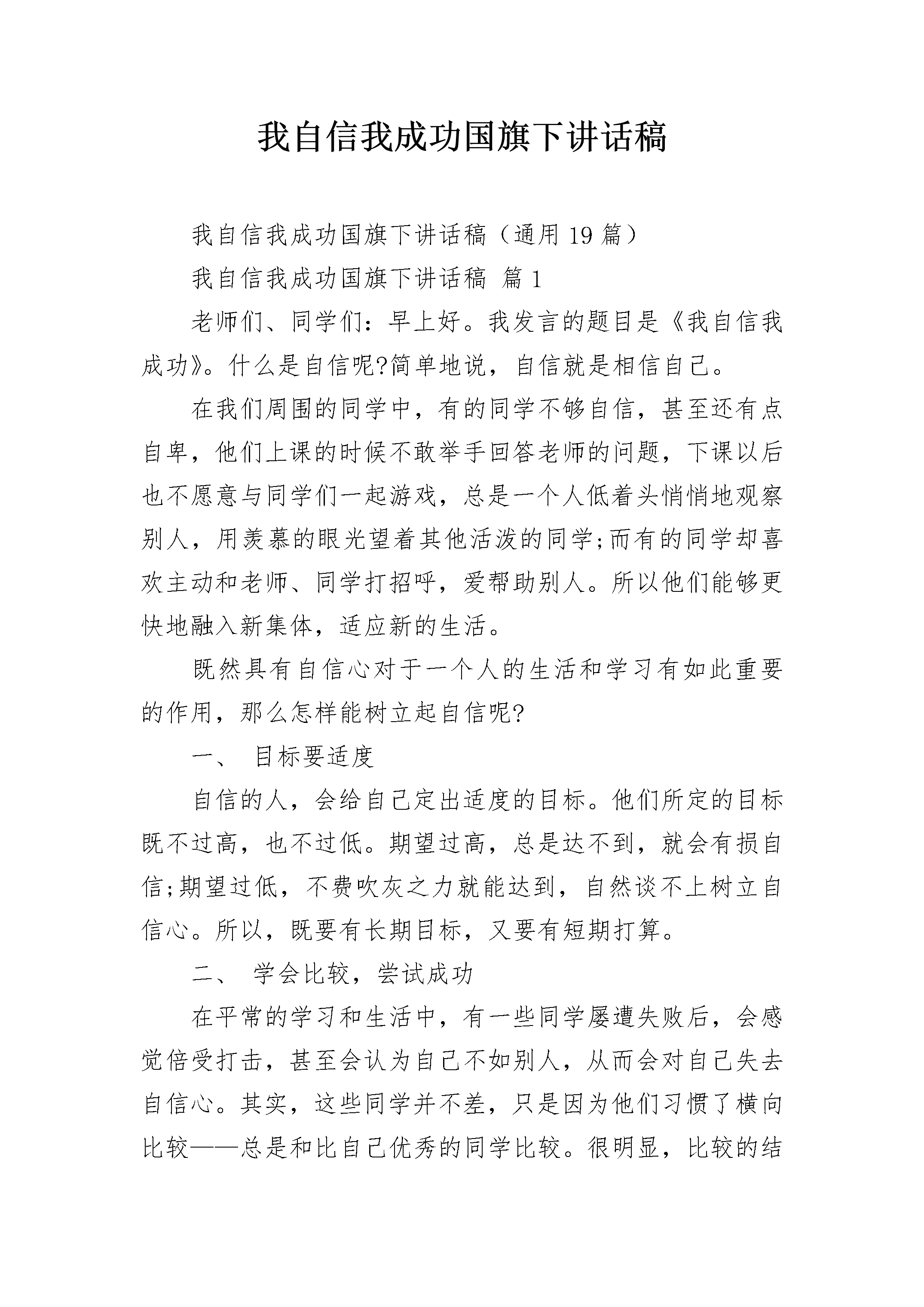 我自信我成功国旗下讲话稿我自信我成功国旗下讲话稿【篇一】尊敬的老师,亲爱的同学们:早上好!今天,我国旗下讲话的题目是——《我自信,我成功》。自信是什么?古往今来,多少名人为它做出了诠释。古代哲学家苏格拉底曾说过:“一个人能否有成就,只看他是否具有自尊心和自信心这两个条件。”诗圣杜甫告诉我们,自信是“会当凌绝顶,一览众山小”的气魄;诗仙李白告诉我们,自信是“天生我材必有用”的豪情;伟大领袖毛主席告诉我们“自信人生二百年,会当击水三千里”的壮志。著名天文学家哥白尼,第一个对影响人类达千年之久的地心说提出怀疑和