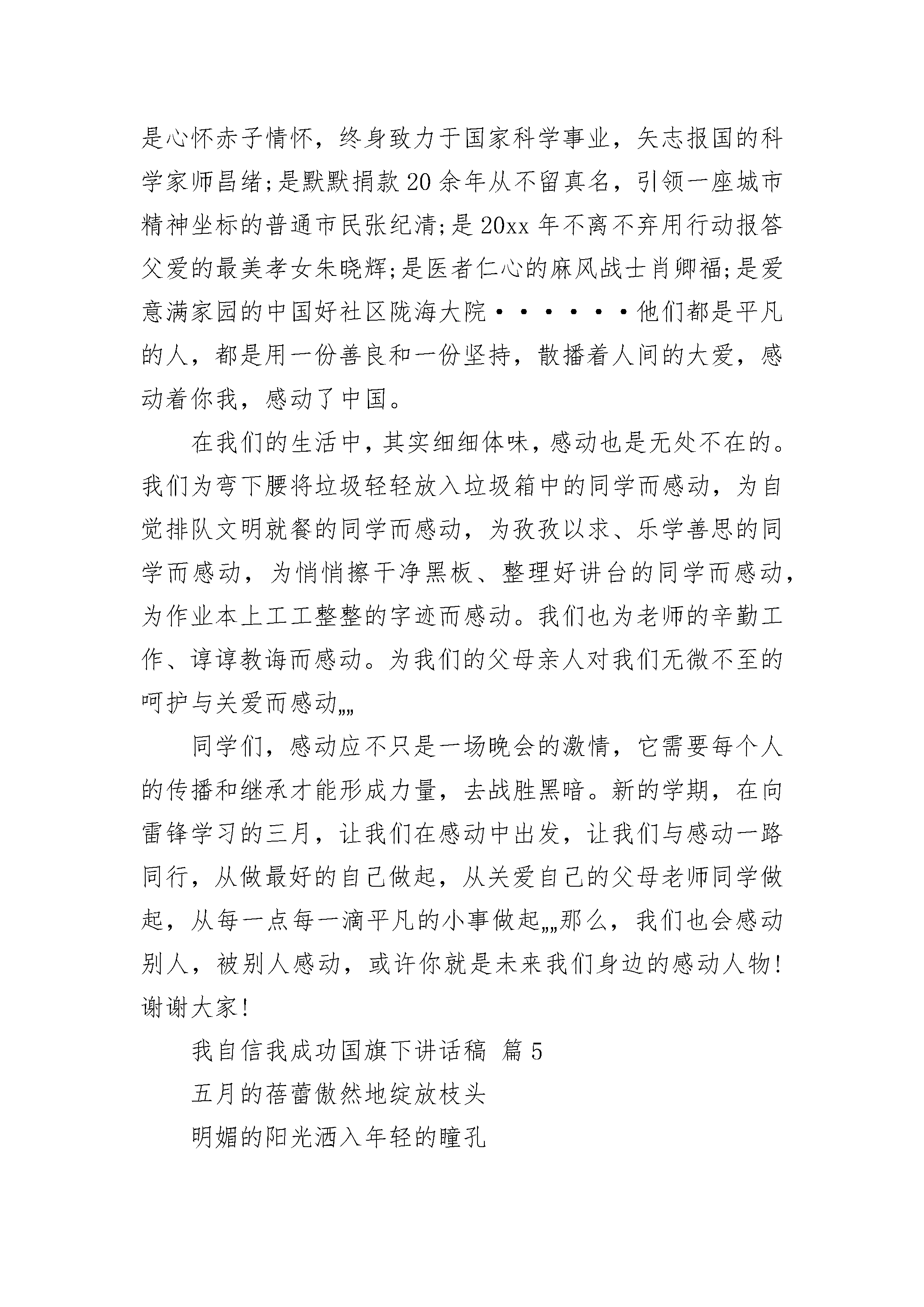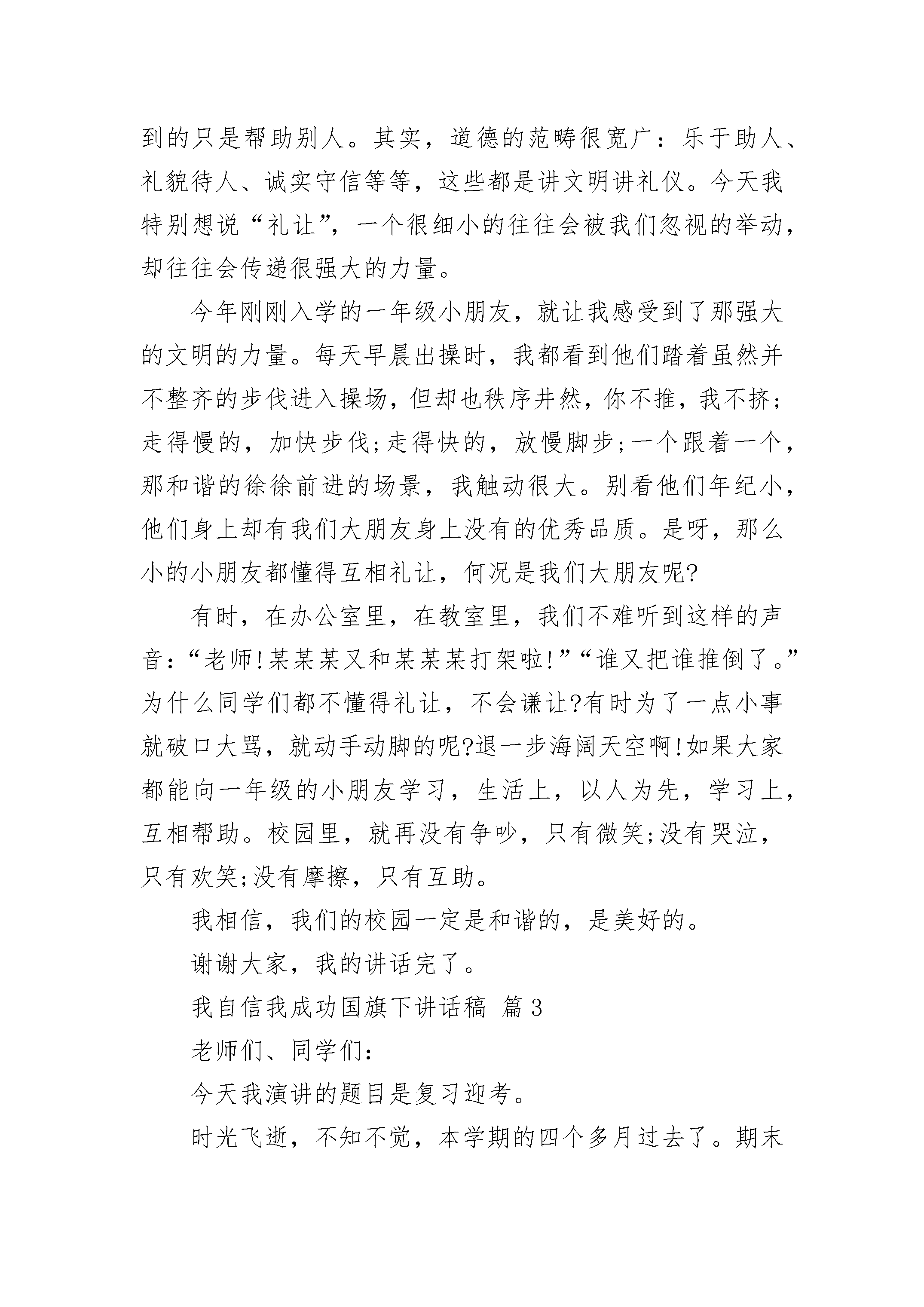 我自信我成功国旗下讲话稿实用3篇尊敬的老师,亲爱的同学们:早上好!今天,我国旗下讲话的题目是——《我自信,我成功》。自信是什么?古往今来,多少名人为它做出了诠释。古代哲学家苏格拉底曾说过:“一个人能否有成就,只看他是否具有自尊心和自信心这两个条件。”诗圣杜甫告诉我们,自信是“会当凌绝顶,一览众山小”的气魄;诗仙李白告诉我们,自信是“天生我材必有用”的豪情,他告诉我们“自信人生二百年,会当击水三千里”的壮志。著名天文学家哥白尼,第一个对影响人类达千年之久的地心说提出怀疑和否认,虽然遭到千万人的反对及压迫,但