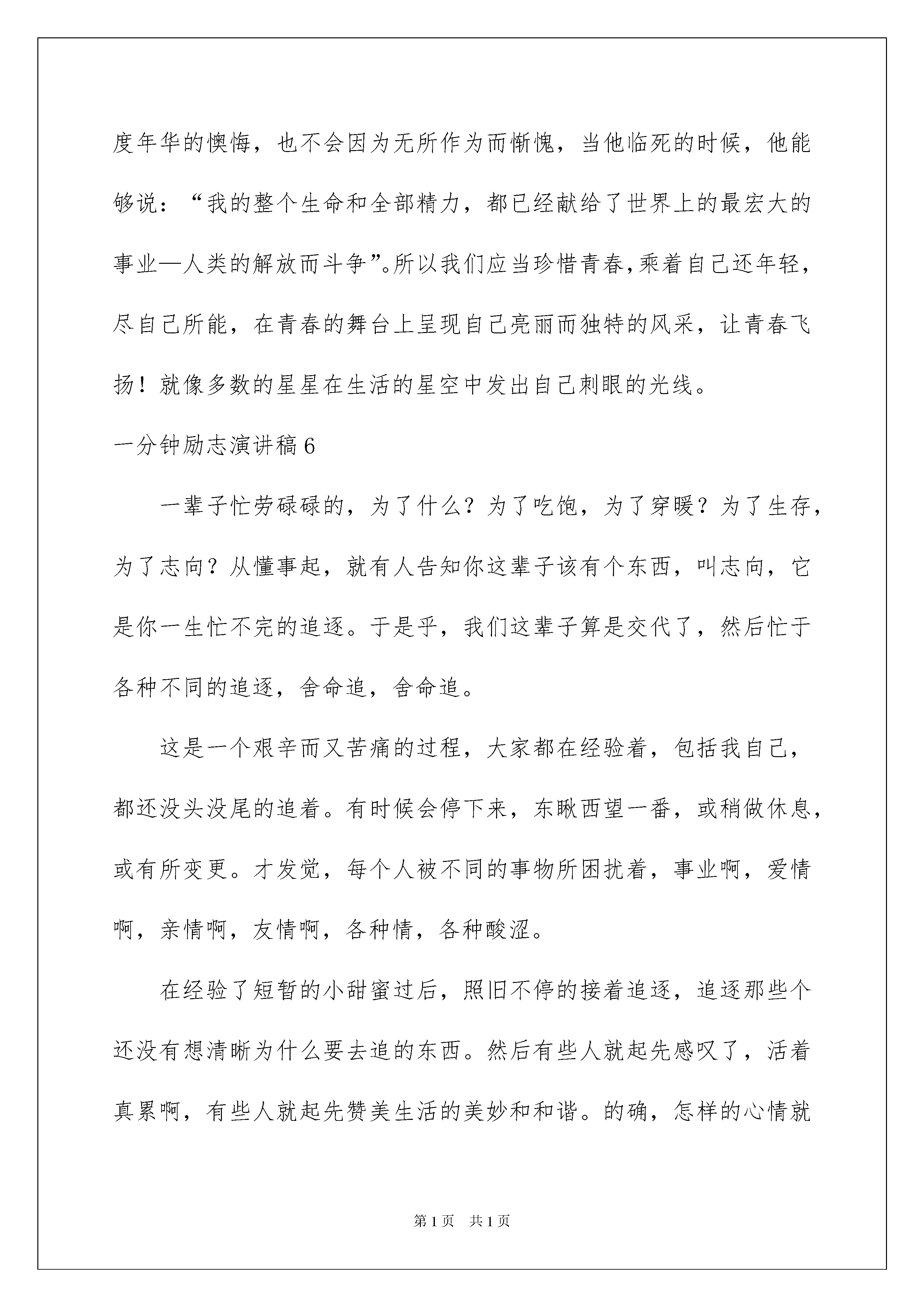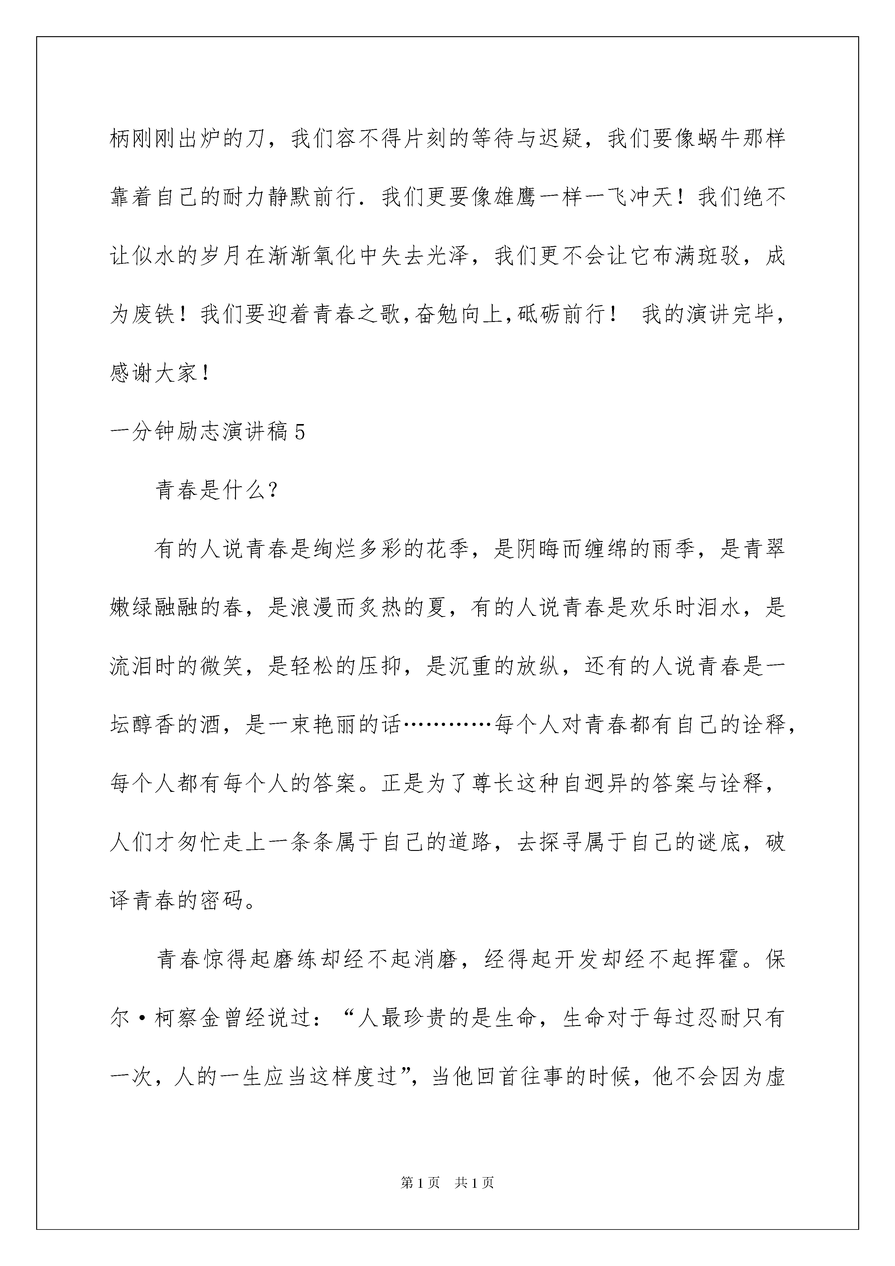 2022一分钟励志演讲稿一分钟励志演讲稿演讲稿可以帮助发言者更好的表达。在学习、工作生活中,须要运用演讲稿的事情愈发增多,那么一般演讲稿是怎么写的呢?下面是我细心整理的一分钟励志演讲稿,欢迎大家共享。一分钟励志演讲稿1学会设计人生盲目地“个人努力”,是中国学生的通病。很多国外面试官往往会问“你能描绘一下三年(或五年)后你的事业前景吗?”我在加拿大毕业