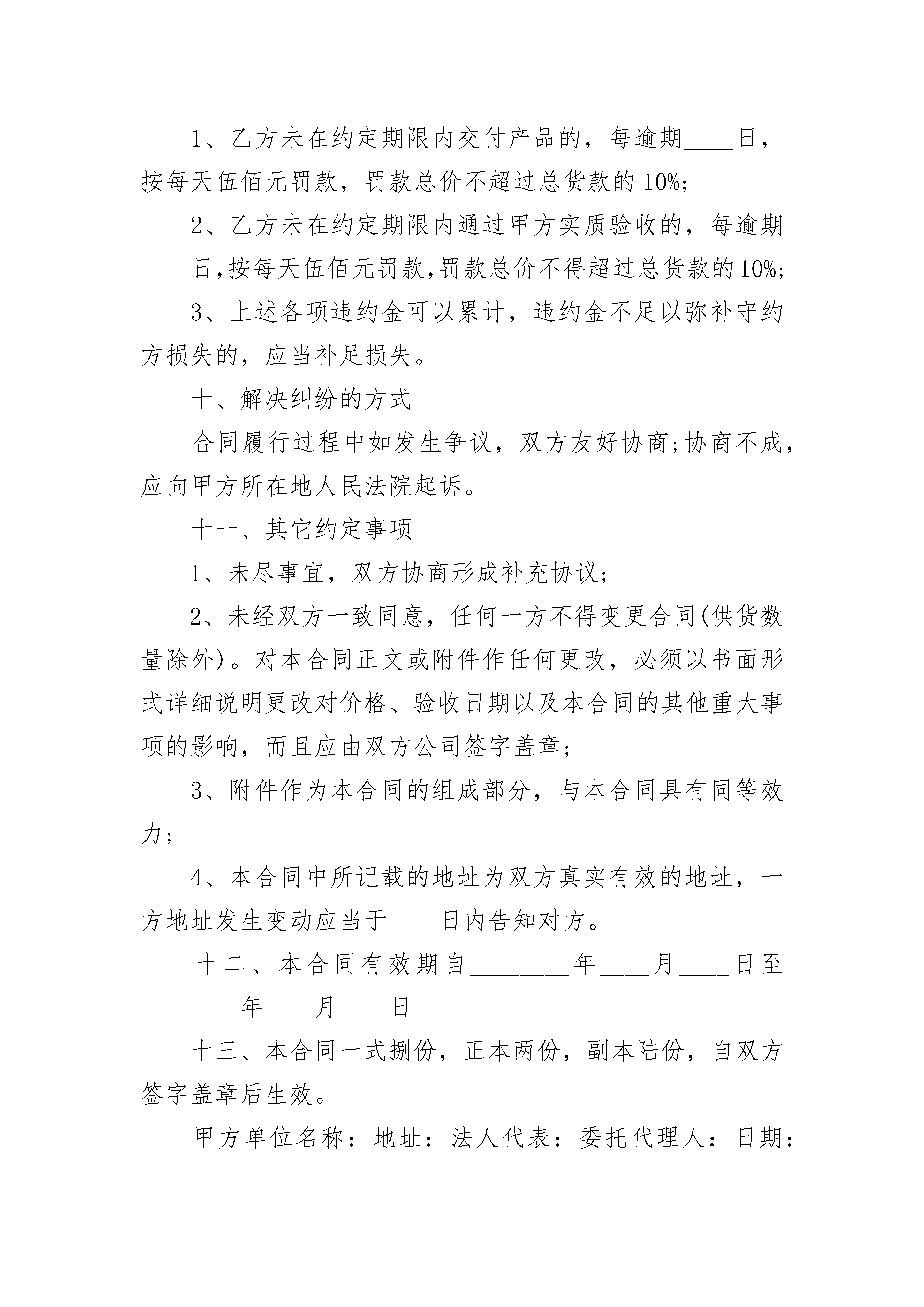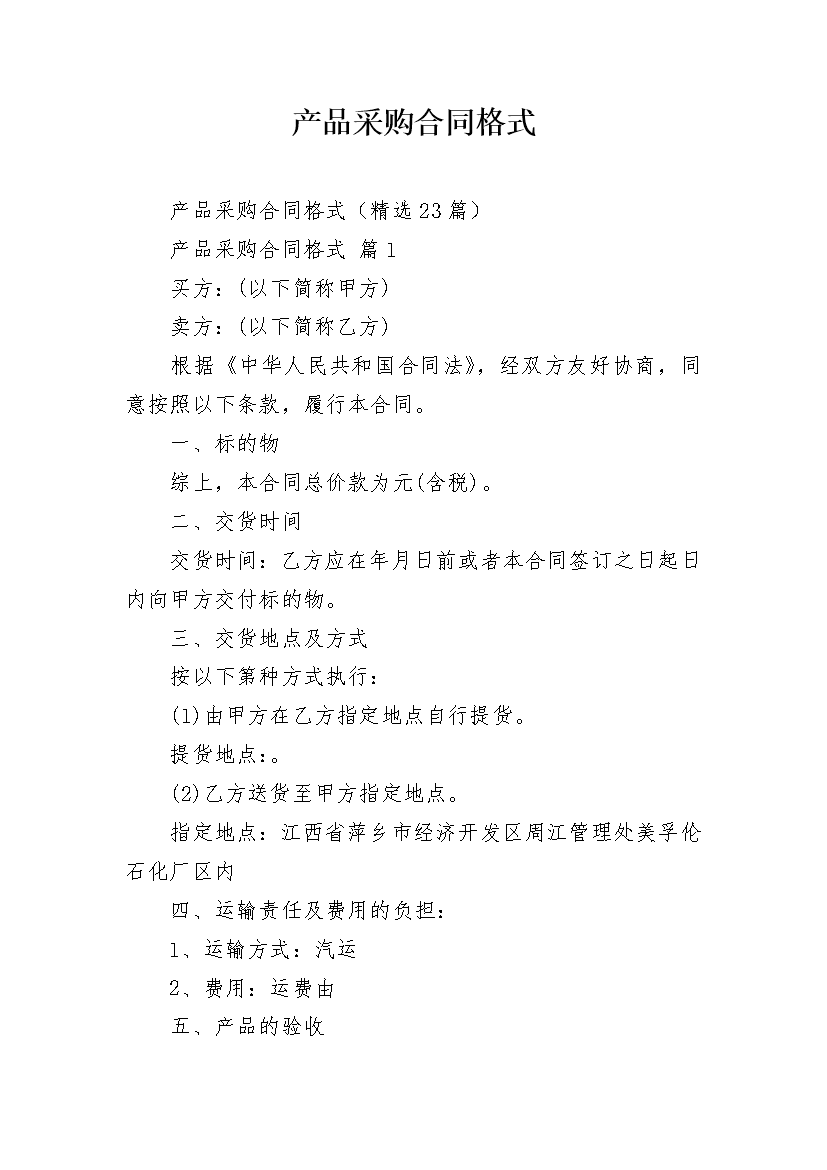 产品采购合同格式产品采购合同格式(精选23篇)产品采购合同格式篇1买方:(以下简称甲方)卖方:(以下简称乙方)根据《中华人民共和国合同法》,经双方友好协商,同意按照以下条款,履行本合同。一、标的物综上,本合同总价款为元(含税)。二、交货时间交货时间:乙方应在年月日前或者本合同签订之日起日内向甲方交付标的物。三、交货地点及方式按以下第种方式执行:(1)由甲方在乙方指定地点自行提货。提货地点:。(2)乙方送货至甲方指定地点。指定地点:江西省萍乡市经济开发区周江管理处美孚伦石化厂区内四、运输责任及费用的负担