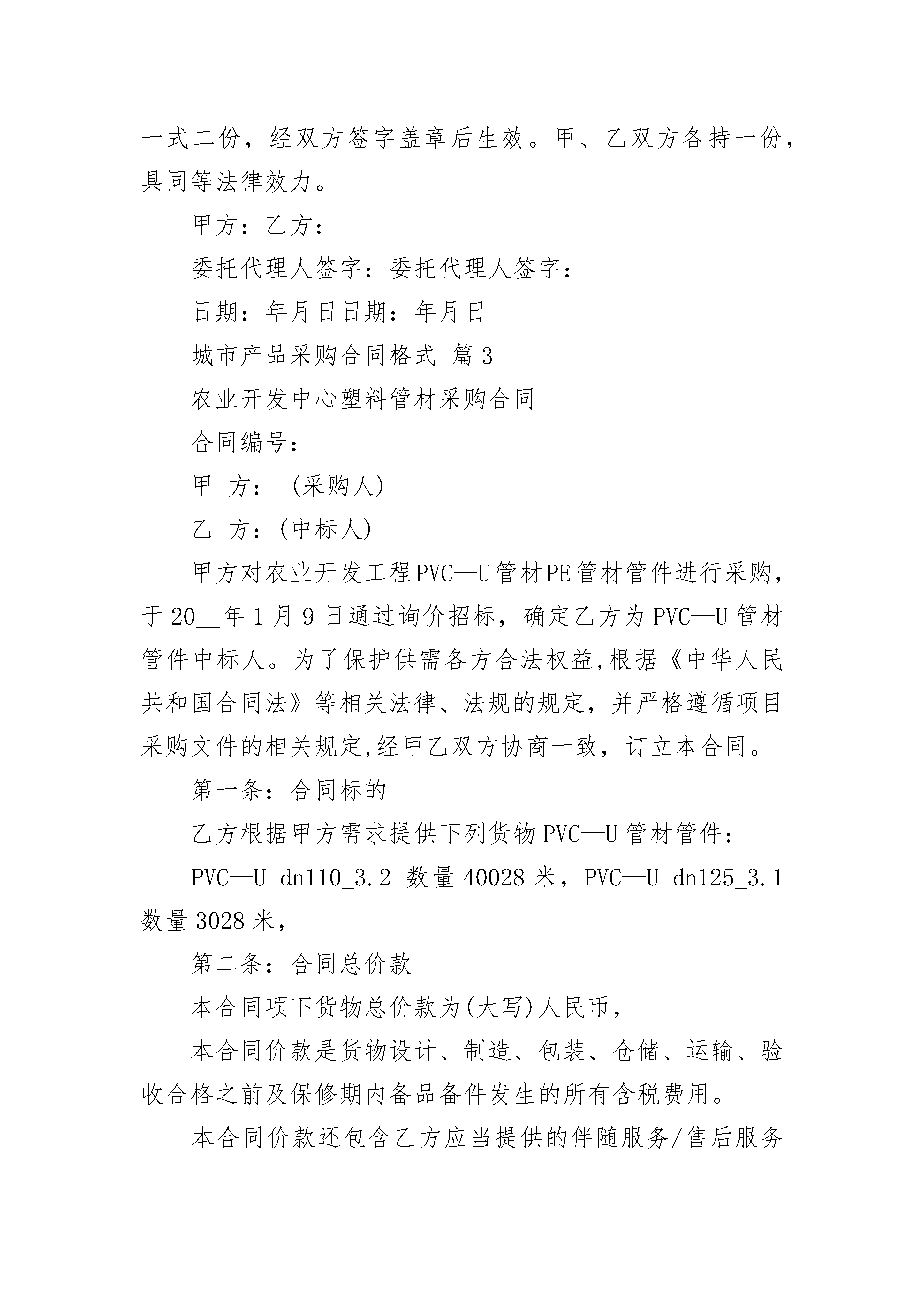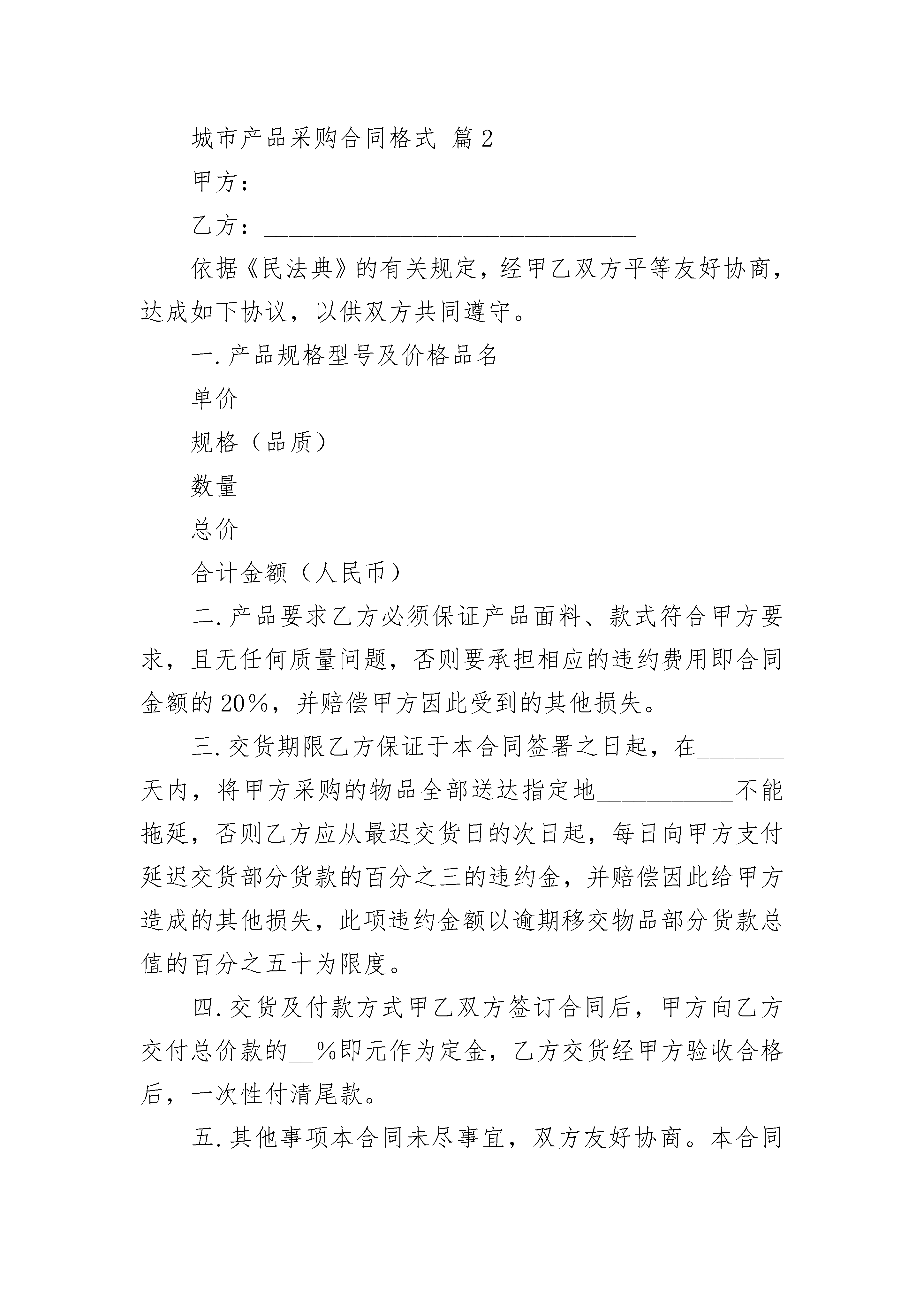 城市产品采购合同格式(5篇)出卖人(甲方):_______买受人(乙方):______甲、乙双方本着诚实守信的原则,平等互利,经公平协商签订如下买卖合同,以兹遵守。第一条标的物1.产品名称:电缆__2.规格/型号:____见购货明细表_____3.原产地:_________生产厂家:_电缆有限公司________总价款:叁佰玖拾贰万五千元整______4.质量(1)整体质量、性能应当达到的标准,采用以下第_________项:a.按照国家强制标准或者指导标准执行;b.按照国际通用标准执行;c.按照行业标准