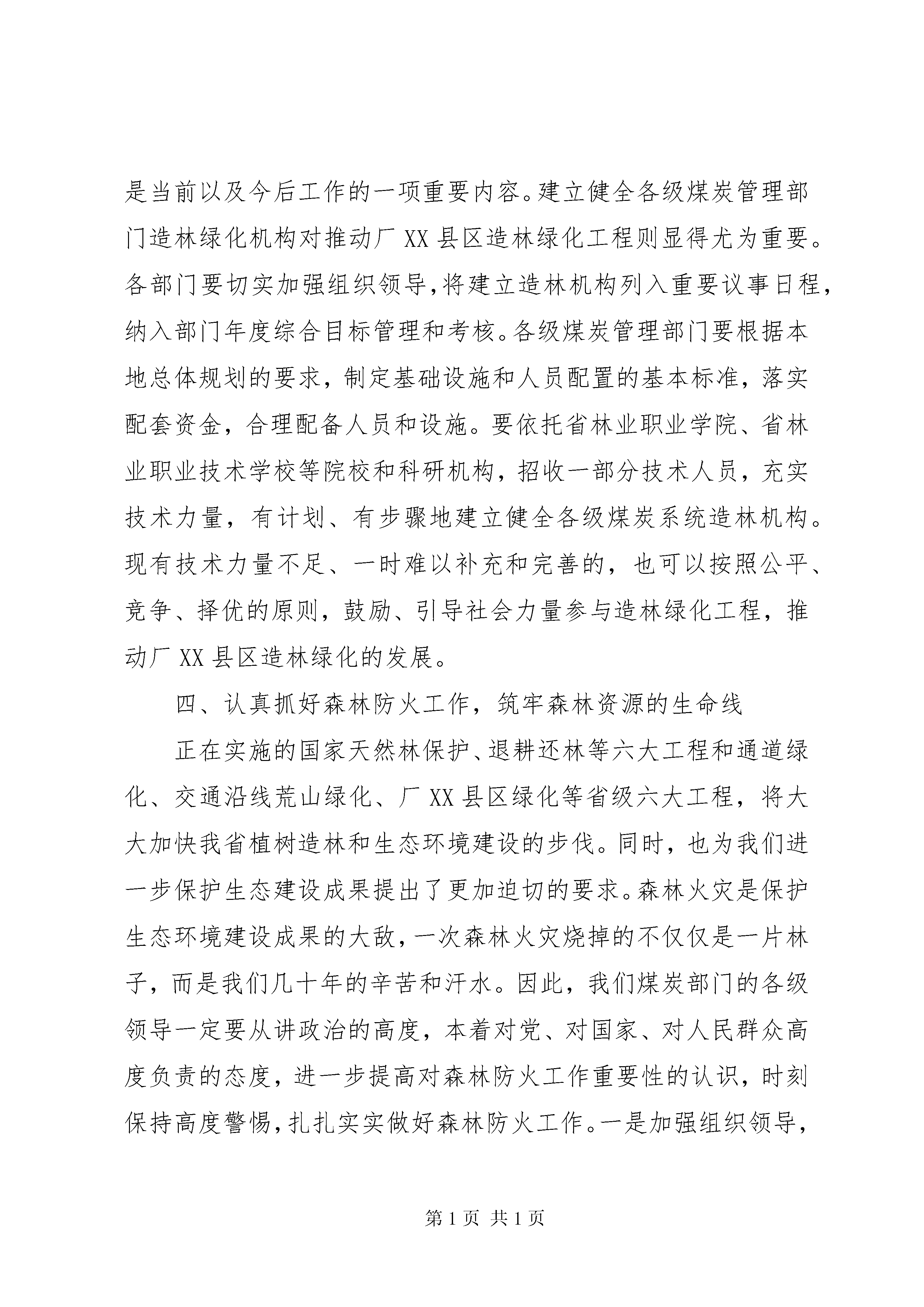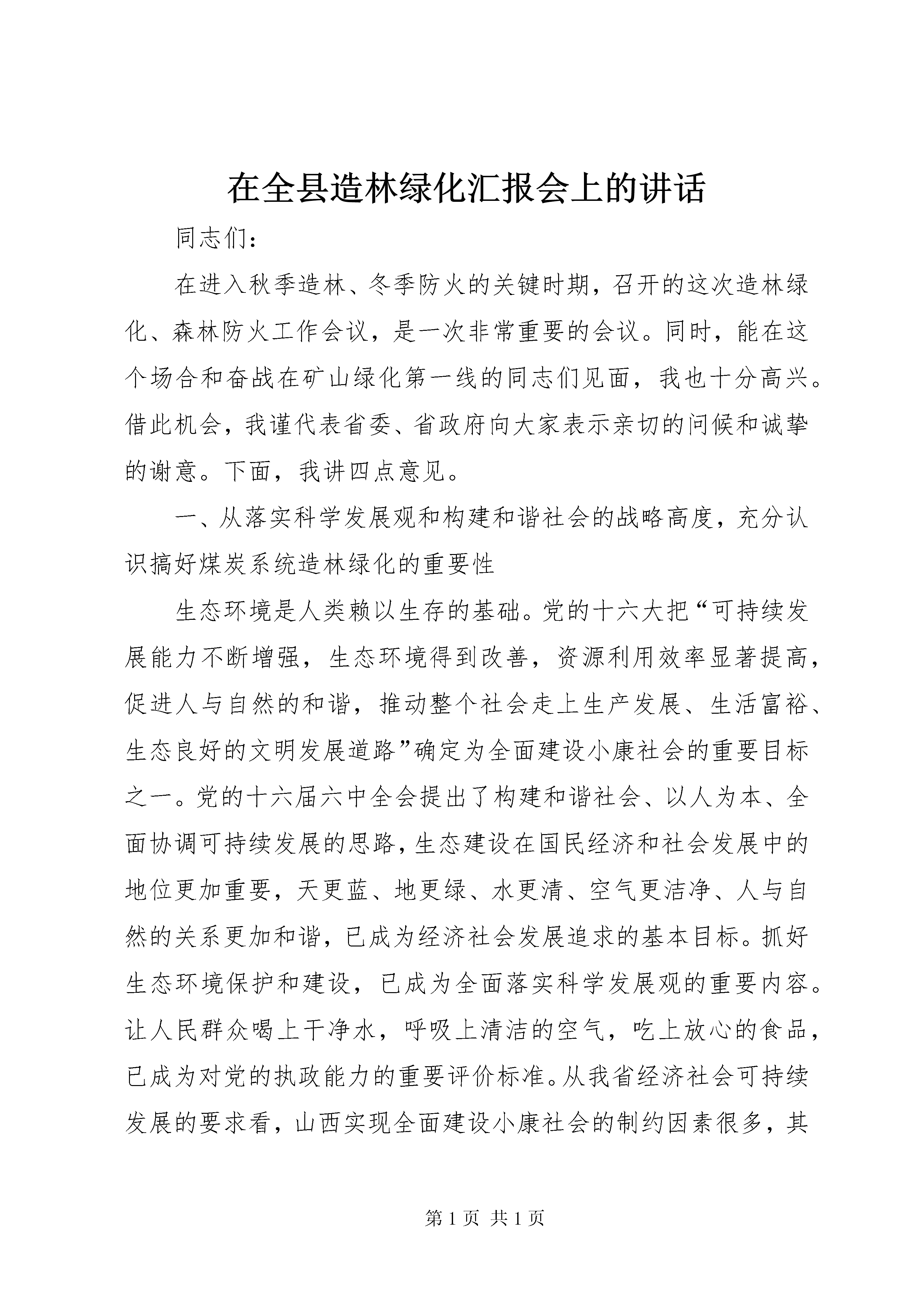 在全县造林绿化汇报会上的讲话同志们:在进入秋季造林、冬季防火的关键时期召开的这次造林绿化、森林防火工作会议是一次非常重要的会议。同时能在这个场合和奋战在矿山绿化第一线的同志们见面我也十分高兴。借此机会我谨代表省委、省政府向大家表示亲切的问候和诚挚的谢意。下面我讲四点意见。一、从落实科学发展观和构建和谐社会的战略高度充分认识搞好煤炭系统造林绿化的重要性生态环境是人类赖以生存的基础。党的十六大把“可持续发展能力不断增强生态环境得到改善资源利用效率显著提高促进