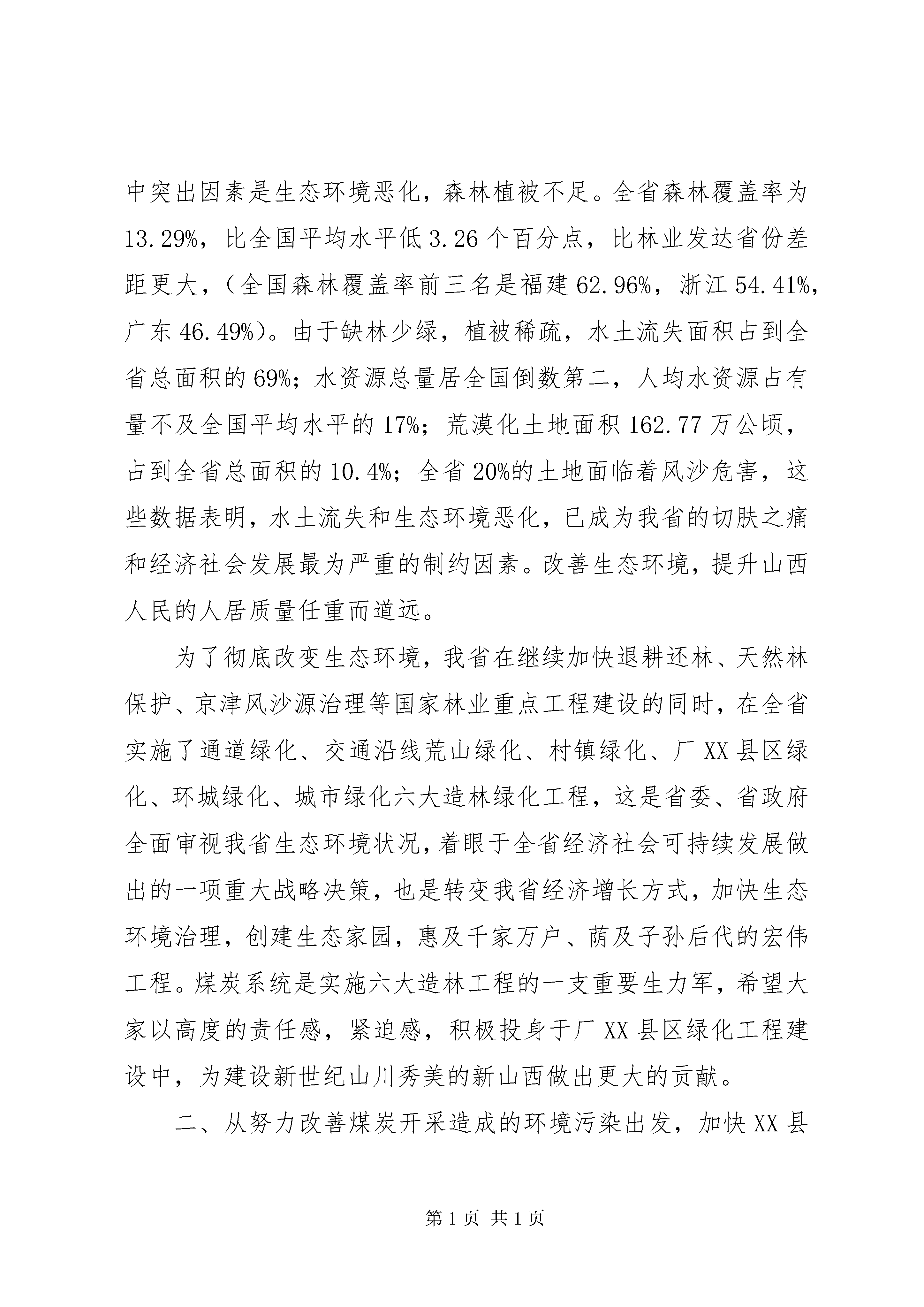 在全县造林绿化汇报会上的讲话同志们:在进入秋季造林、冬季防火的关键时期,召开的这次造林绿化、森林防火工作会议,是一次非常重要的会议。同时,能在这个场合和奋战在矿山绿化第一线的同志们见面,我也十分高兴。借此机会,我谨代表省委、省政府向大家表示亲切的问候和诚挚的谢意。下面,我讲四点意见。一、从落实科学发展观和构建和谐社会的战略高度,充分认识搞好煤炭系统造林绿化的重要性生态环境是人类赖以生存的基础。党的十六大把“可持续发展能力不断增强,生态环境得到改善,资源利用效率显著提高,促进人与自