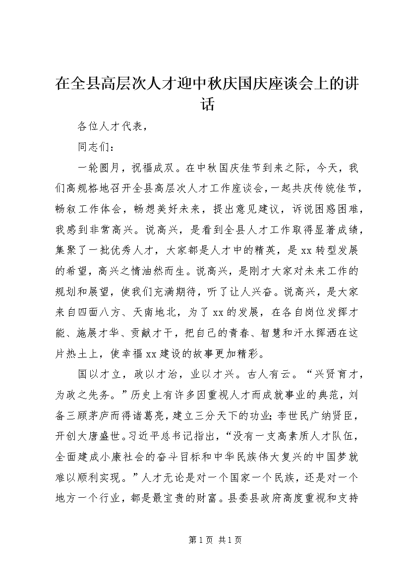 第PAGE\*Arabic\*MERGEFORMAT4页共NUMPAGES\*MERGEFORMAT4页在全县高层次人才迎中秋庆国庆座谈会上的讲话各位人才代表,同志们:一轮圆月,祝福成双。在中秋国庆佳节到来之际,今天,我们高规格地召开全县高层次人才工作座谈会,一起共庆传统佳节,畅叙工作体会,畅想美好未来,提出意见建议,诉说困惑困难,我感到非常高兴。说高兴,是看到全县人才工作取得显著成绩,集聚了一批优秀人才,大家都是人才中的精英,是xx转型发展的希望,高兴之情油然而生。说高兴,是刚才大家对未来工
