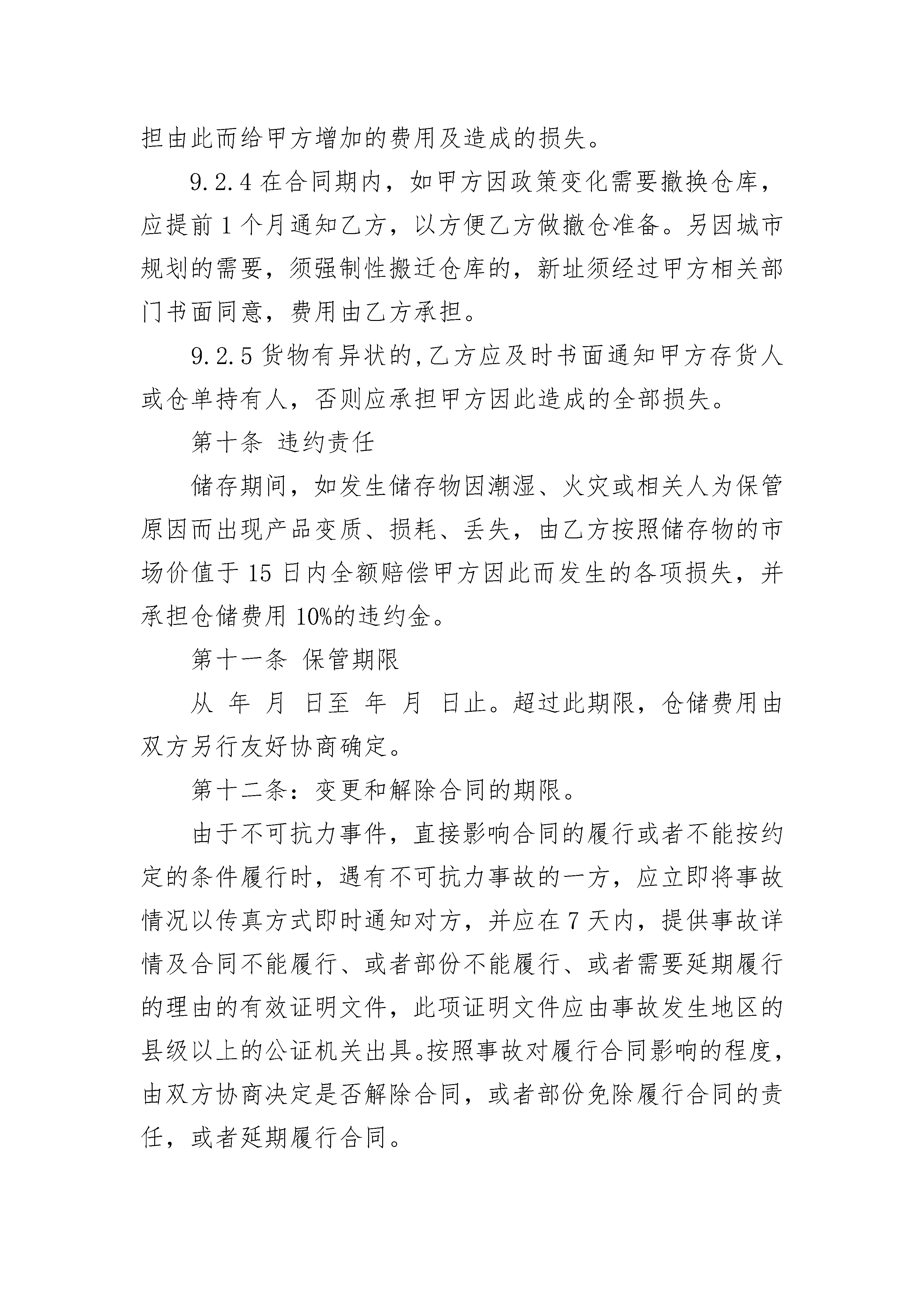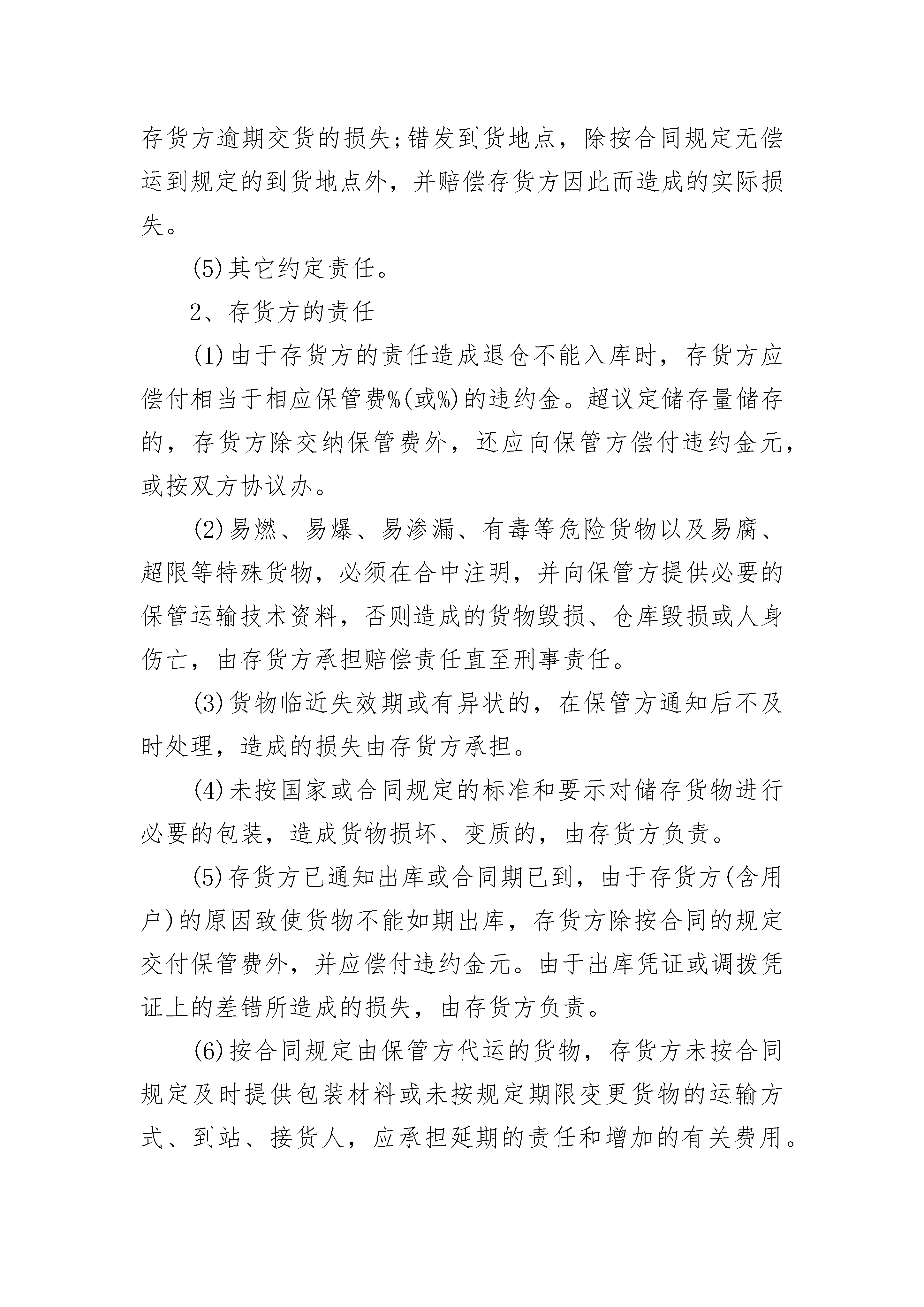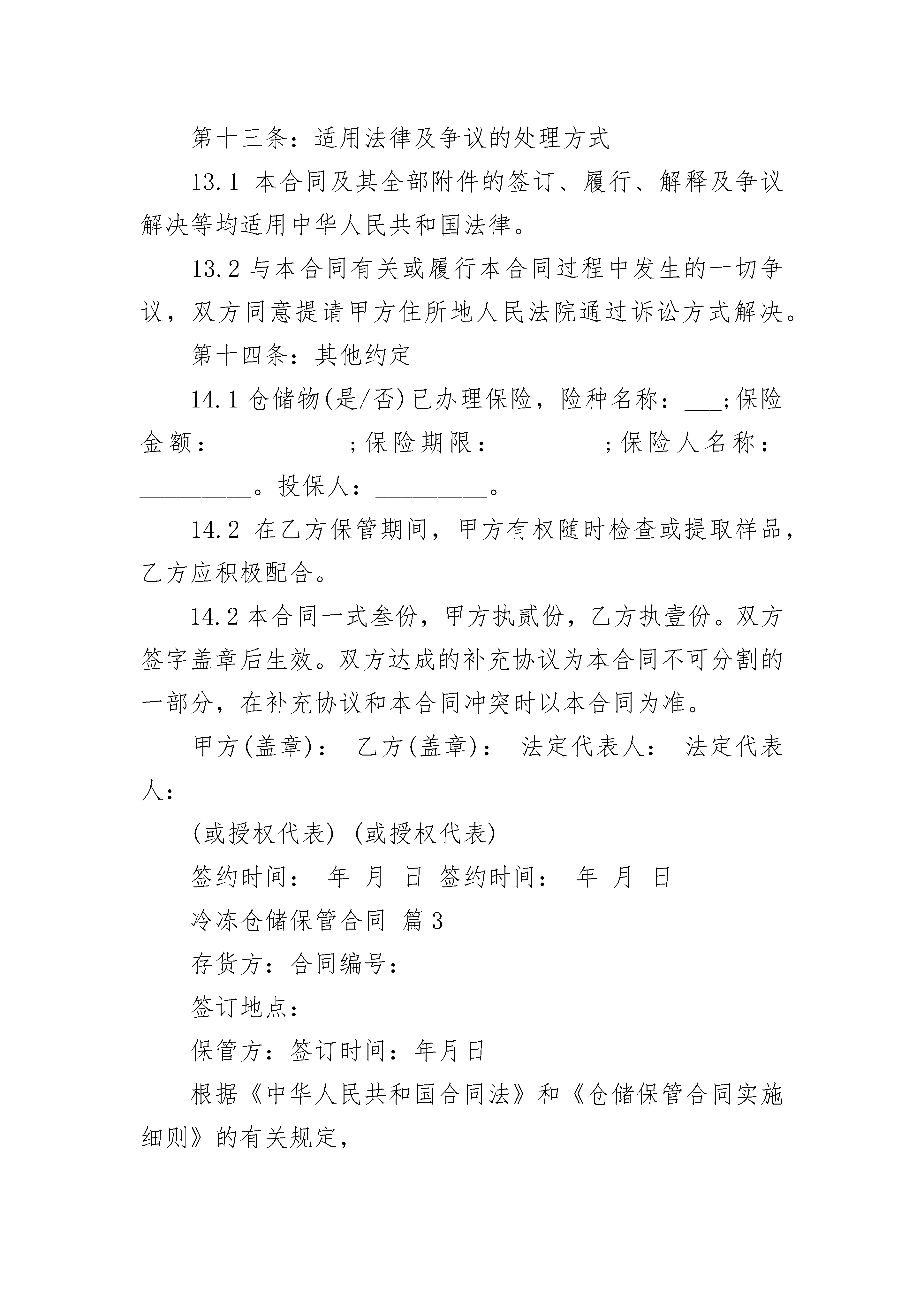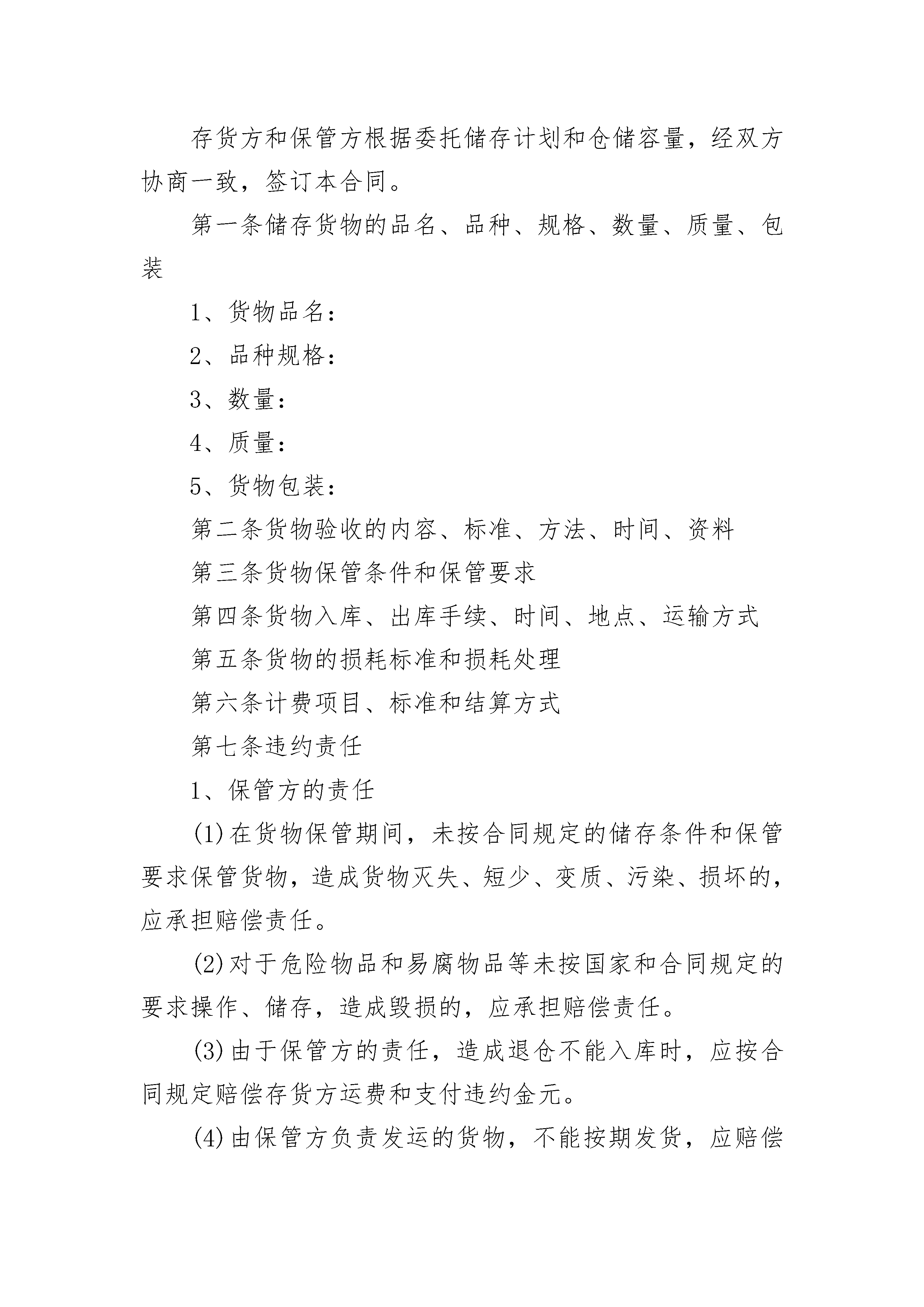 冷冻仓储保管合同根据《民法典》及相关规定,就冷库库房租赁事宜,为明确出租方与承租方的权利义务关系,经双方协商一致,签订本合同,以资双方共同遵守。1.本合同是________冷冻仓储有限公司(出租方)储存本合约持有人(存货人即承租人)交付的仓储物,存货人支付仓储费并明确仓储过程中双方责任的合同。2.存货人承诺所储藏之商品为合法商品,所提供之资料为真实资料、存货人联系资料变化时应及时通知保管人。3.存货人所储藏商品如有违反中华人民共和国有关政策、法律、法规、案例、规定等而受工商、海关、商检、公安、技监、环保、