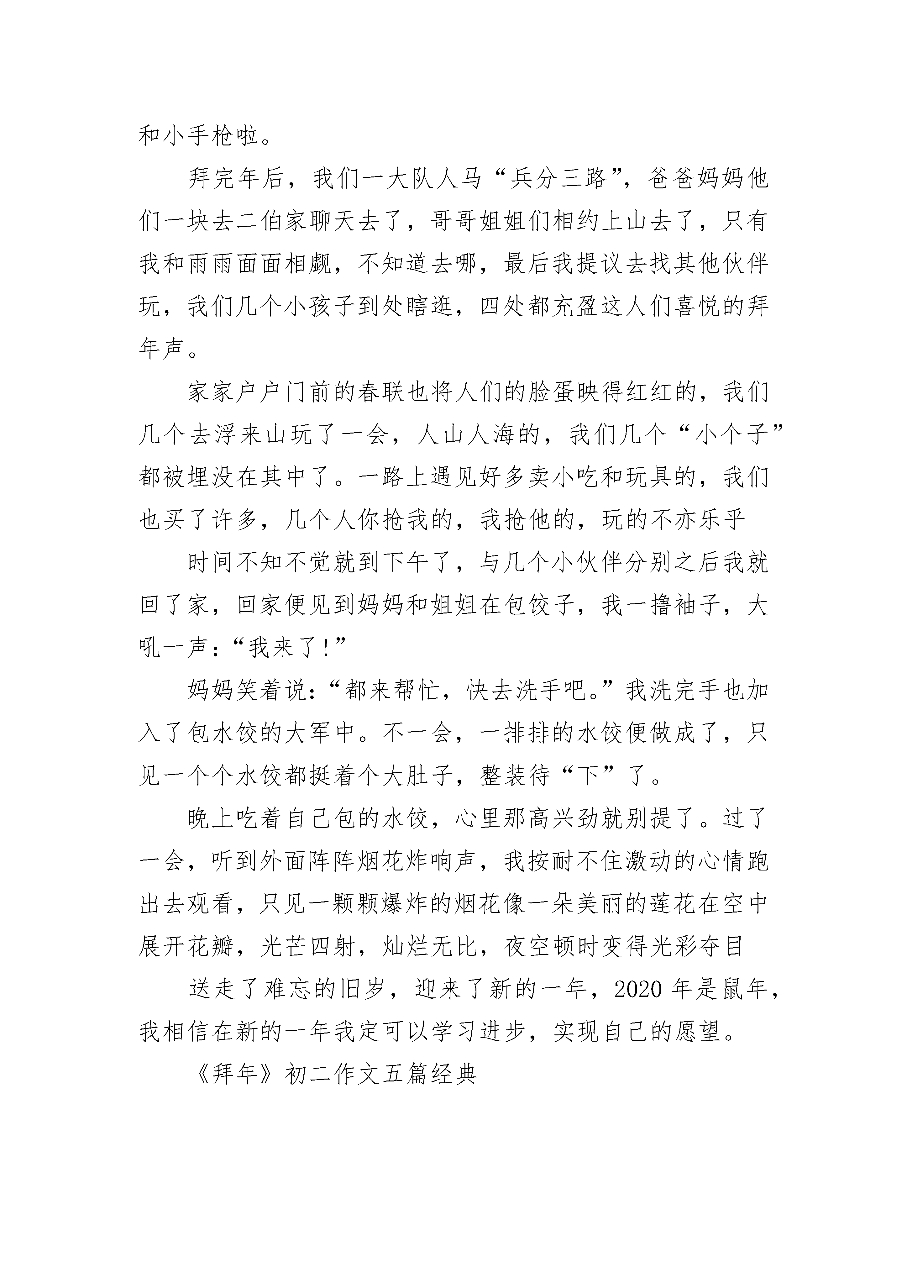 初二拜年作文关于初二拜年作文5篇无论是身处学校还是步入社会,说到作文,大家肯定都不陌生吧,作文根据写作时限的不同可以分为限时作文和非限时作文。你知道作文怎样才能写的好吗?以下是小编为大家整理的初二拜年作文5篇,仅供参考,希望能够帮助到大家。初二拜年作文篇1新年的第一天,我和老爸、老妈到舅舅家去给外婆拜年。走在路上,只见两只喜鹊在枝头叽叽喳喳地叫着,好像在说“新年好!新年好!”一上公共汽车,只见汽车上都是乘车拜年的人,一家一户坐在一起,掂着礼品,个个喜气洋洋的。向窗外望去,只见有开小汽车的、有骑摩托车、电动
