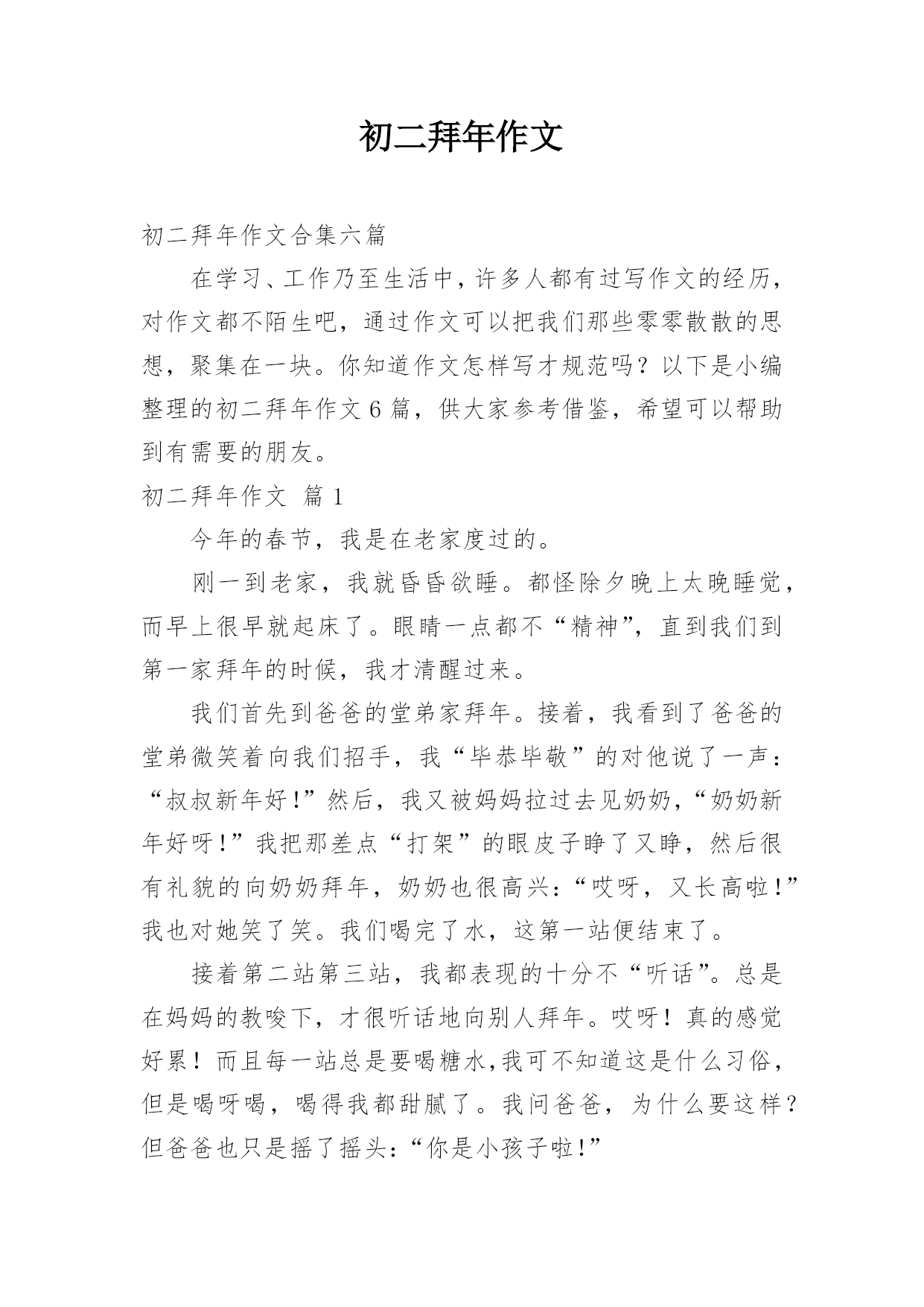 初二拜年作文初二拜年作文合集六篇在学习、工作乃至生活中,许多人都有过写作文的经历,对作文都不陌生吧,通过作文可以把我们那些零零散散的思想,聚集在一块。你知道作文怎样写才规范吗?以下是小编整理的初二拜年作文6篇,供大家参考借鉴,希望可以帮助到有需要的朋友。初二拜年作文篇1今年的春节,我是在老家度过的。刚一到老家,我就昏昏欲睡。都怪除夕晚上太晚睡觉,而早上很早就起床了。眼睛一点都不“精神”,直到我们到第一家拜年的时候,我才清醒过来。我们首先到爸爸的堂弟家拜年。接着,我看到了爸爸的堂弟微笑着向我们招手,我“毕恭