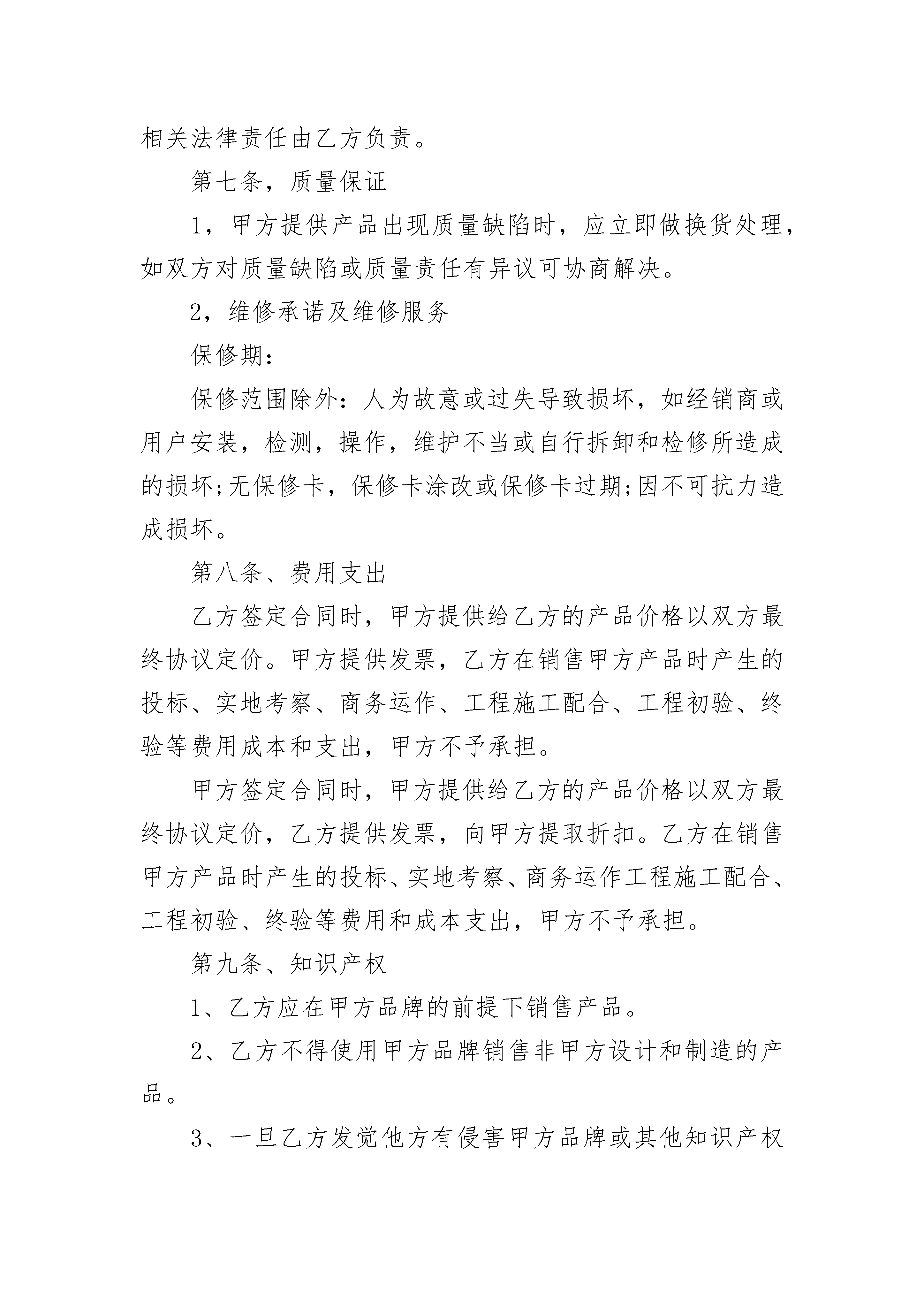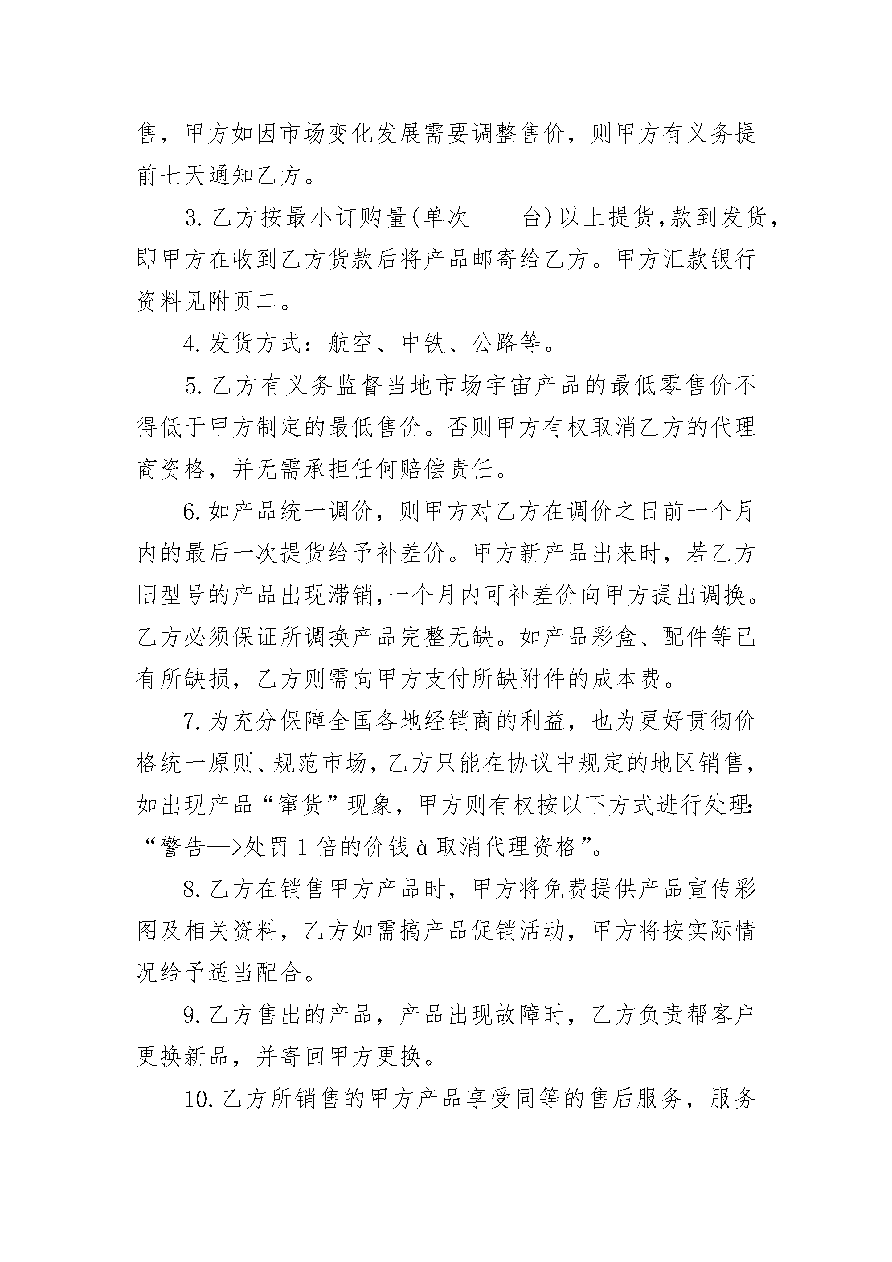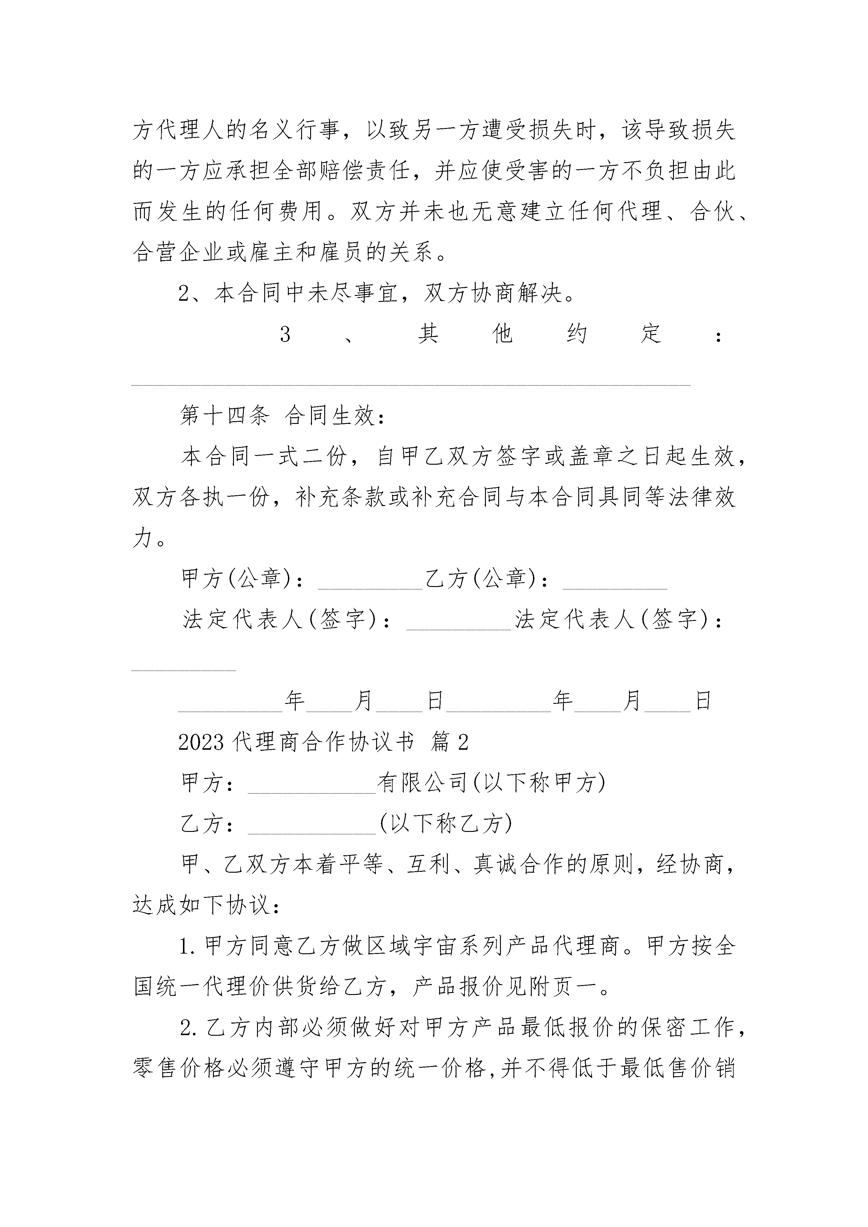 代理商合作的协议书代理商合作的协议书在现在社会,协议在生活中的使用越来越广泛,签订协议可以保障自身的权益不被侵害。我们该怎么拟定协议呢?下面是小编精心整理的代理商合作的协议书,仅供参考,大家一起来看看吧。代理商合作的协议书1甲方:___________有限公司(以下称甲方)乙方:___________(以下称乙方)甲、乙双方本着平等、互利、真诚合作的原则,经协商,达成如下协议:1.甲方同意乙方做区域宇宙系列产品代理商。甲方按全国统一代理价供货给乙方,产品报价见附页一。2.乙方内部必须做好对甲方产品最低报价
