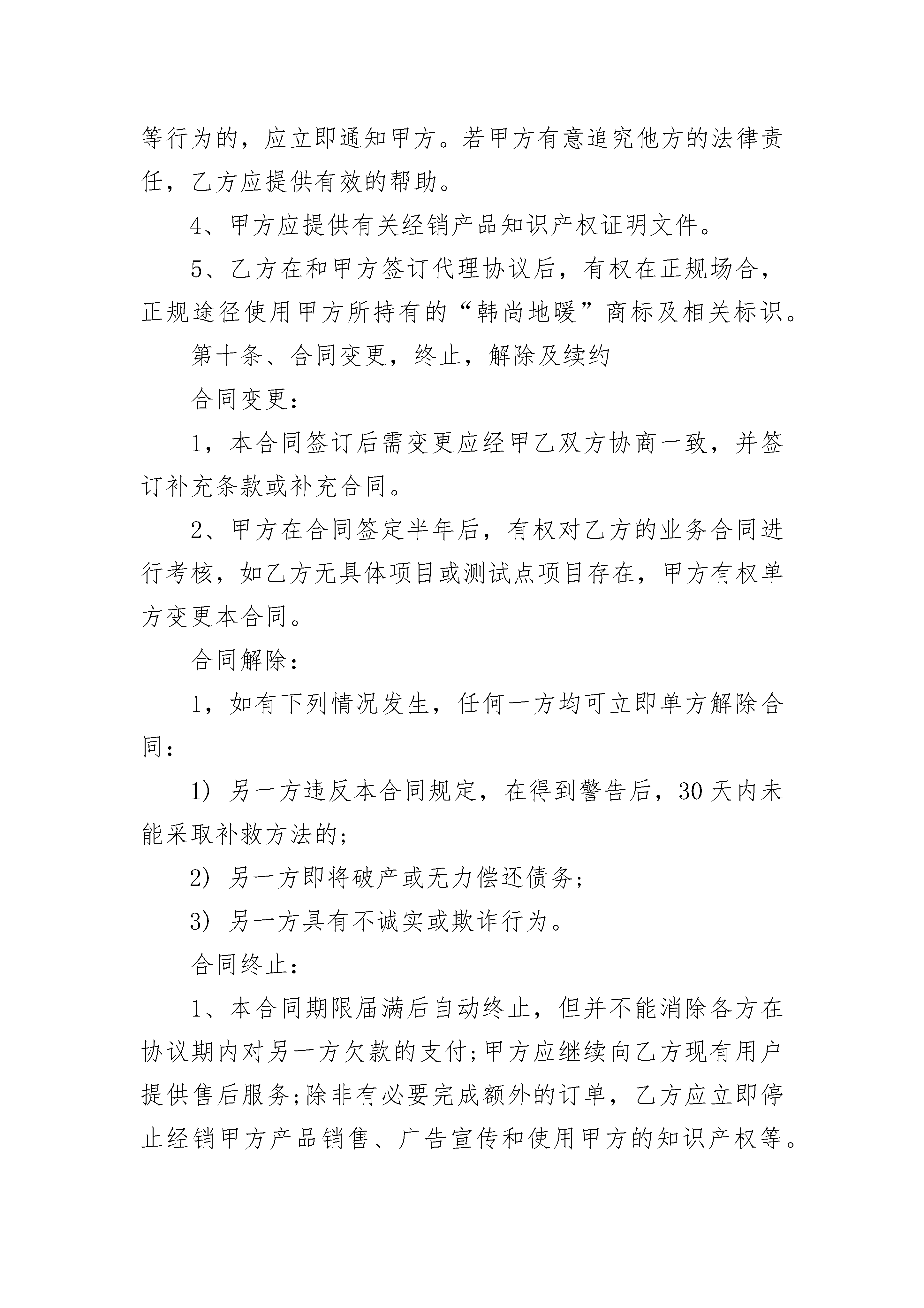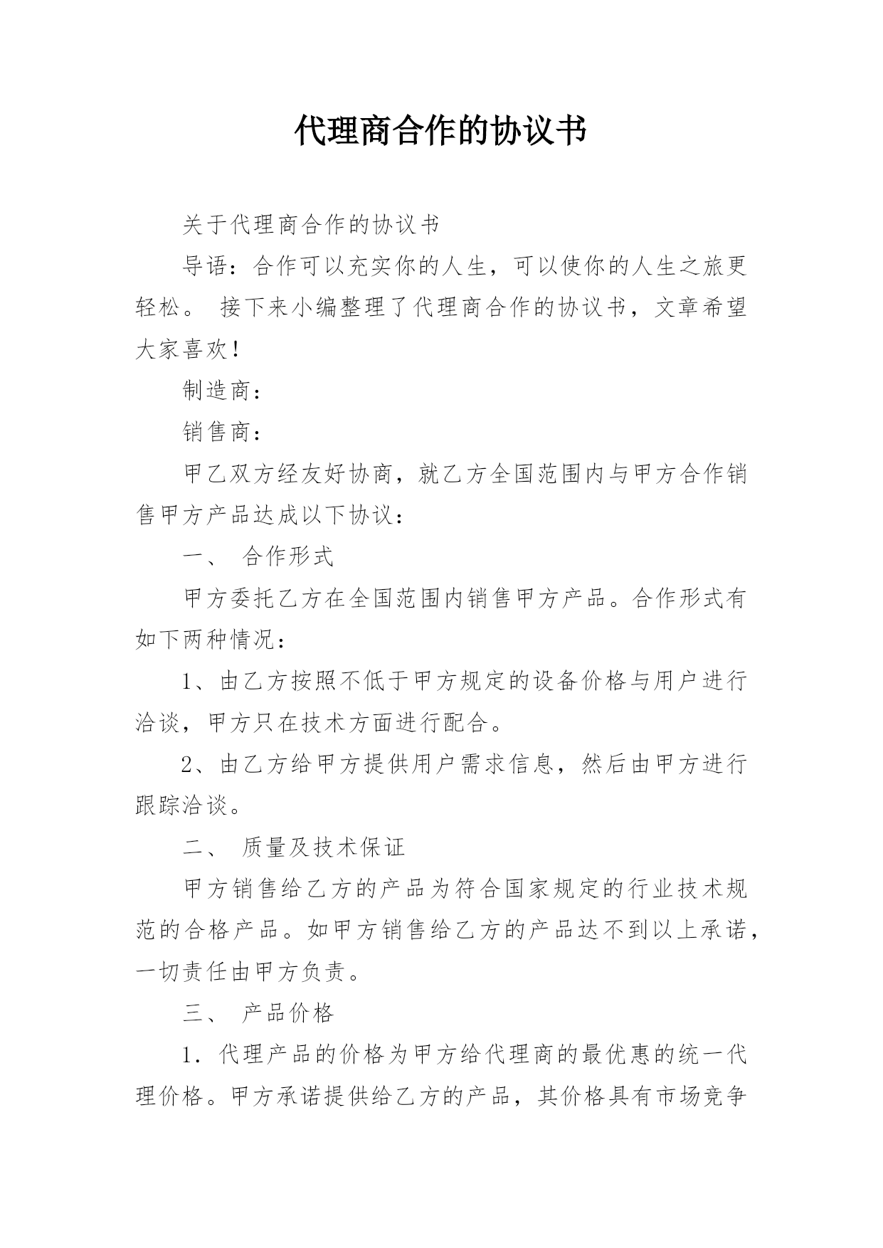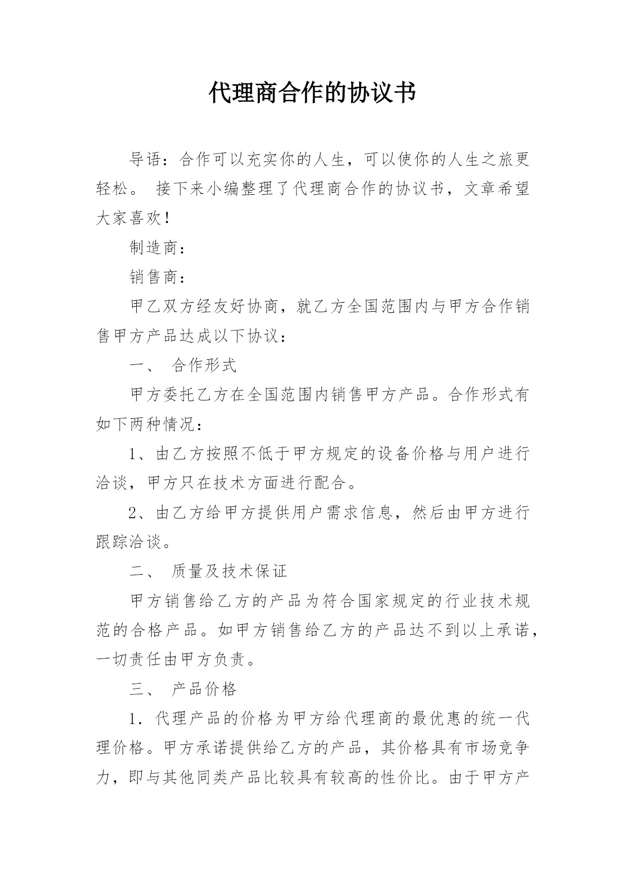 代理商合作的协议书在现在社会,协议在生活中的使用越来越广泛,签订协议可以保障自身的权益不被侵害。我们该怎么拟定协议呢?下面是小编精心整理的代理商合作的协议书,仅供参考,大家一起来看看吧。代理商合作的协议书1甲方:___________有限公司(以下称甲方)乙方:___________(以下称乙方)甲、乙双方本着平等、互利、真诚合作的原则,经协商,达成如下协议:1.甲方同意乙方做区域宇宙系列产品代理商。甲方按全国统一代理价供货给乙方,产品报价见附页一。2.乙方内部必须做好对甲方产品最低报价的保密工作,零售价