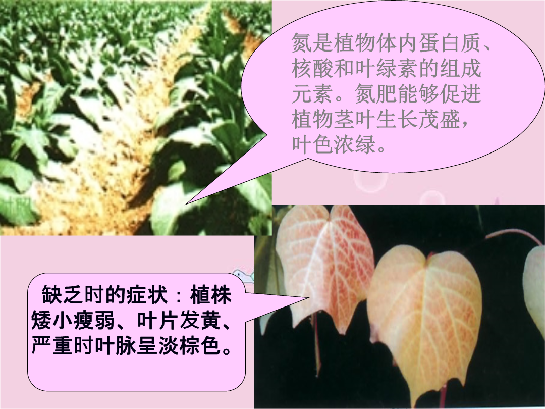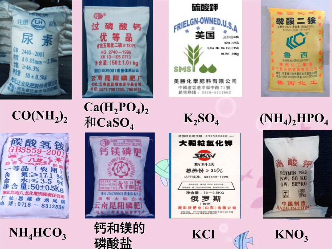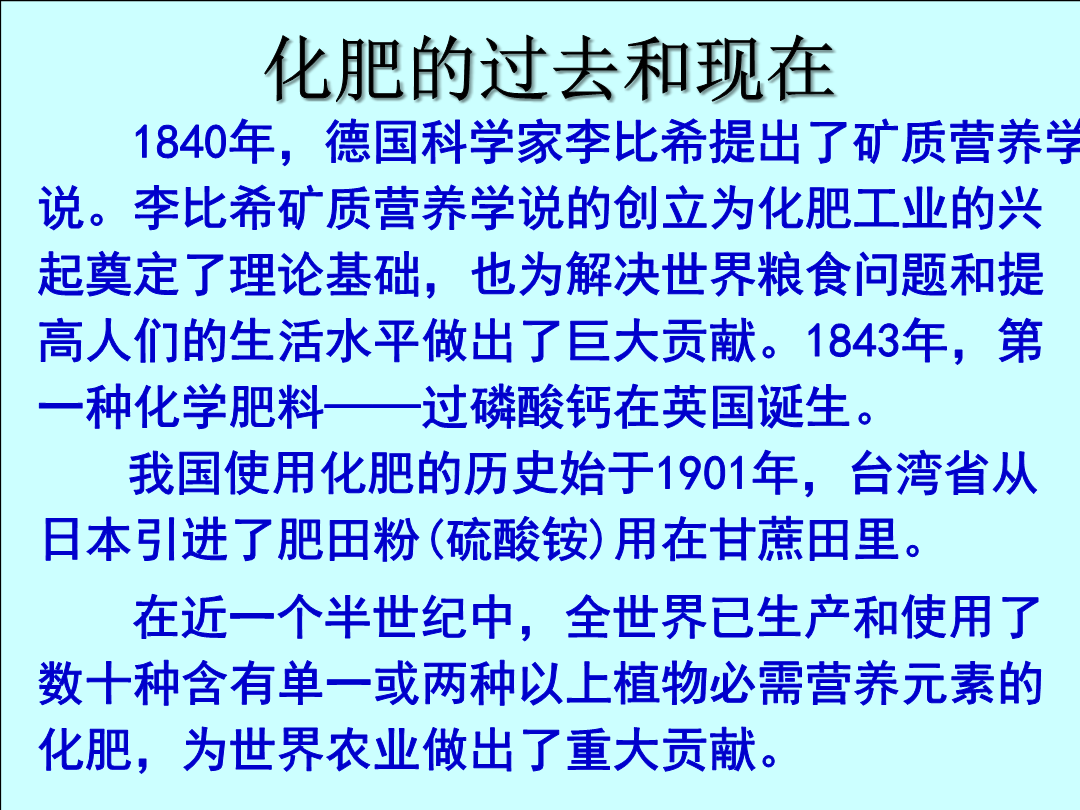 课题2化学肥料在一派欣欣向荣的农村景象中,多彩多姿的植物给美丽的自然画卷,增添了无穷的活力。植物生长需要哪些元素?缺氮1840年,德国科学家李比希提出了矿质营养学说。李比希矿质营养学说的创立为化肥工业的兴起奠定了理论基础,也为解决世界粮食问题和提高人们的生活水平做出了巨大贡献。1843年,第一种化学肥料——过磷酸钙在英国诞生。我国使用化肥的历史始于1901年,台湾省从日本引进了肥田粉(硫酸铵)用在甘蔗田里。在近一个半世纪中,全世界已生产和使用了数十种含有单一或两种以上植物必需营养元素的化肥,为世