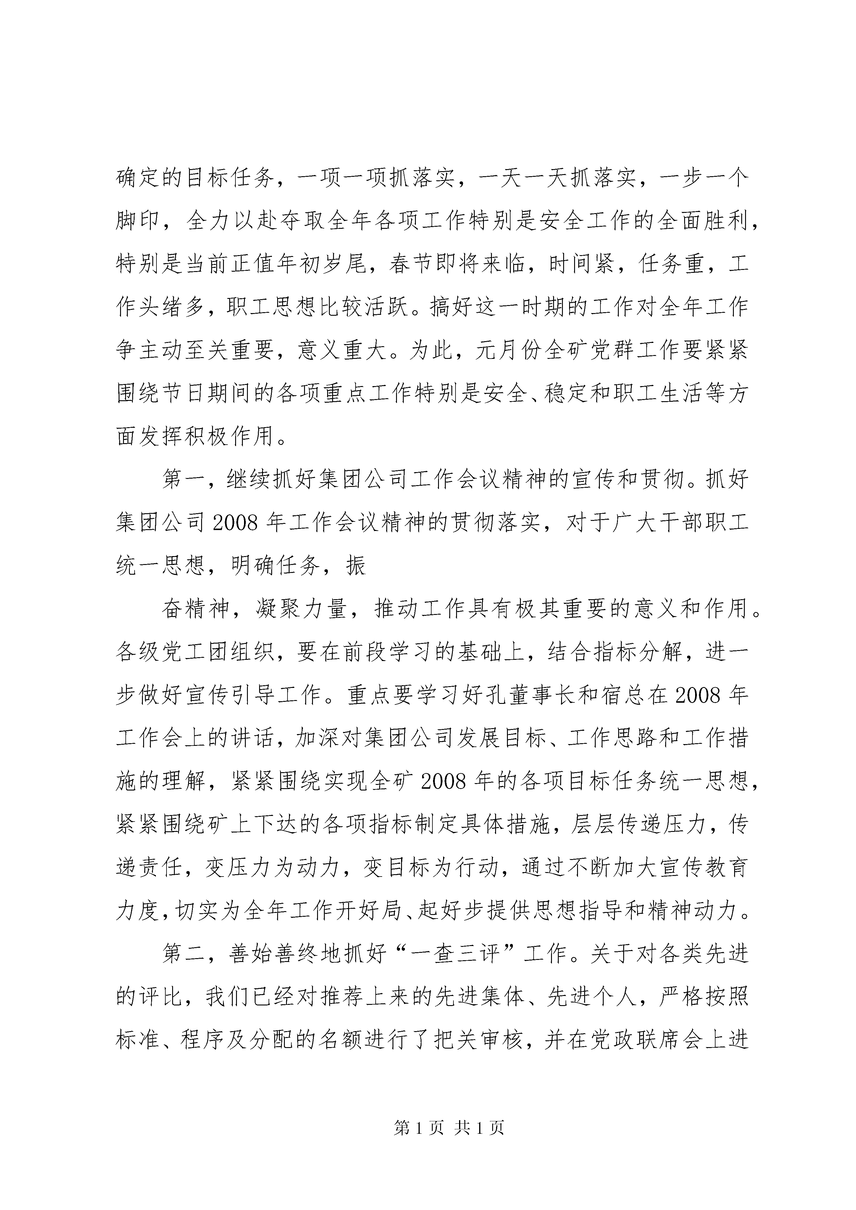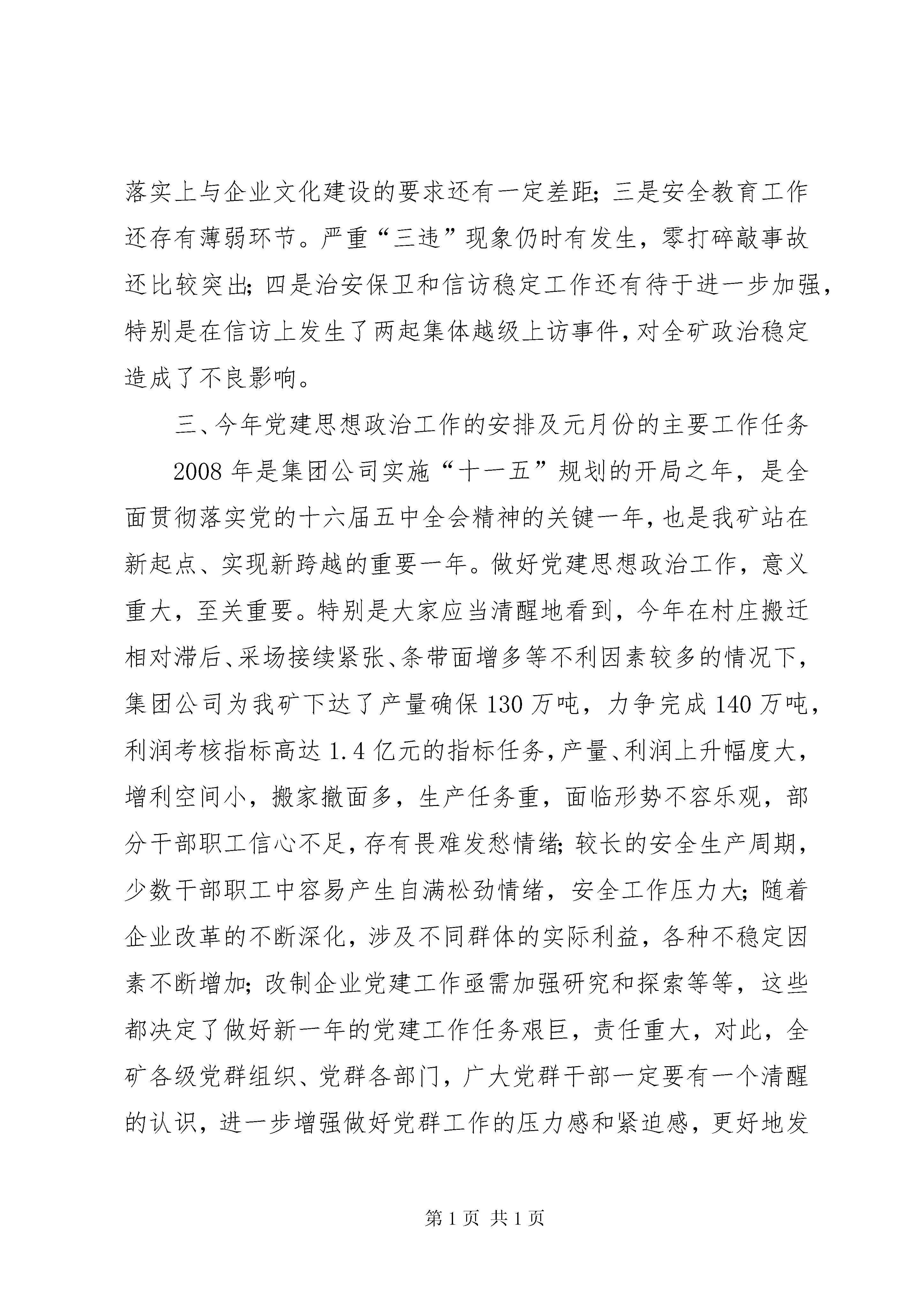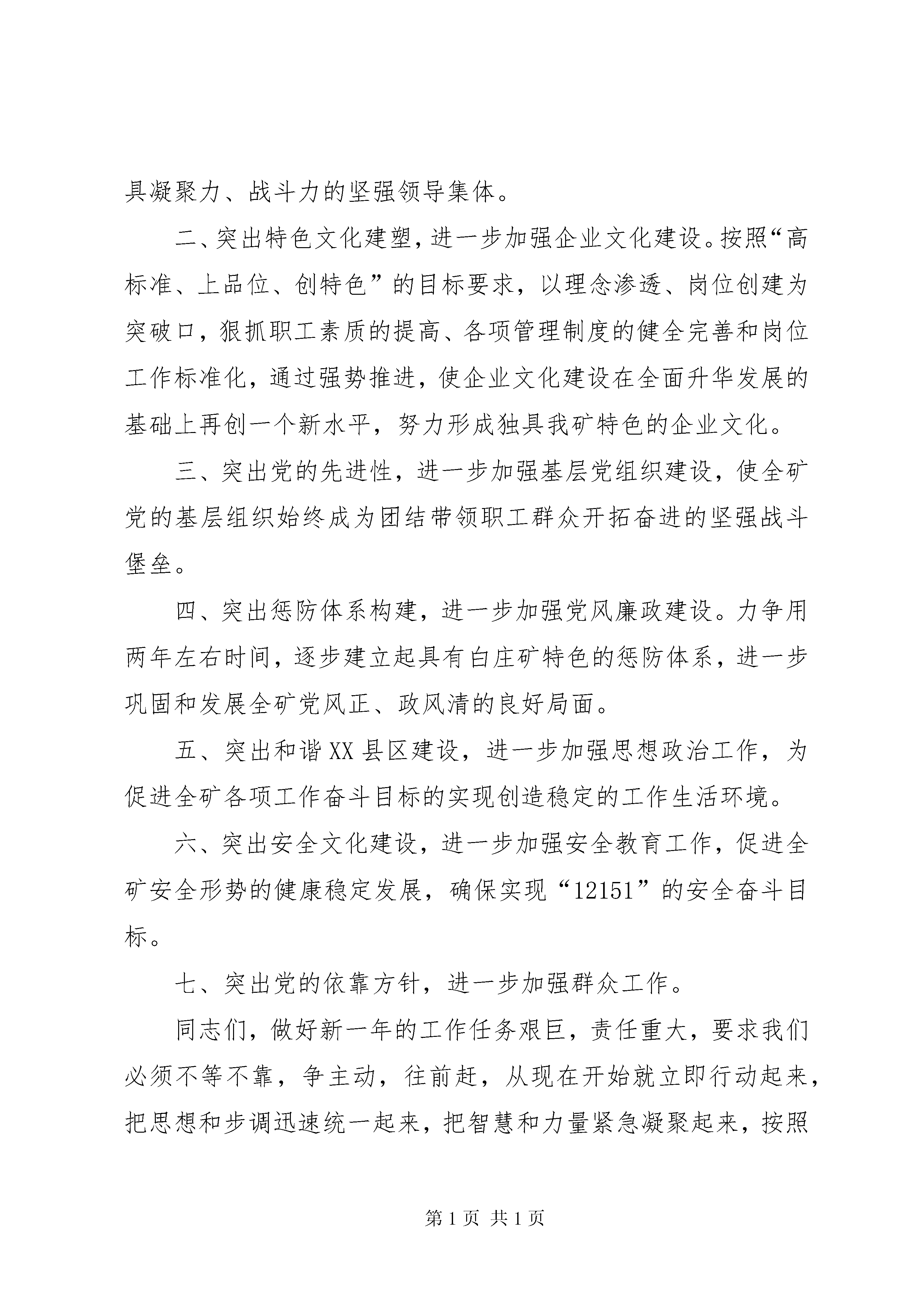 全矿安全工作会上的讲话文章标题:全矿安全工作会上的讲话同志们:新年来临之际今天我们召开扩大的安全办公会全面回顾总结四季度决战及2005年全矿的安全工作安排部署今年及元月份的工作任务。把安全办公会作为今年我们召开的第一个重要会议充分表明了矿领导班子坚定不移地把安全生产放在一切工作首位的态度和决心也反映了大家的共同心愿。刚才*矿长传达了集团公司安全例会精神*处长简要总结了安全决战的情况并提出了今后一个时期安全工作的要求*矿长作了重要讲话对去年的安全工作给予了客观评