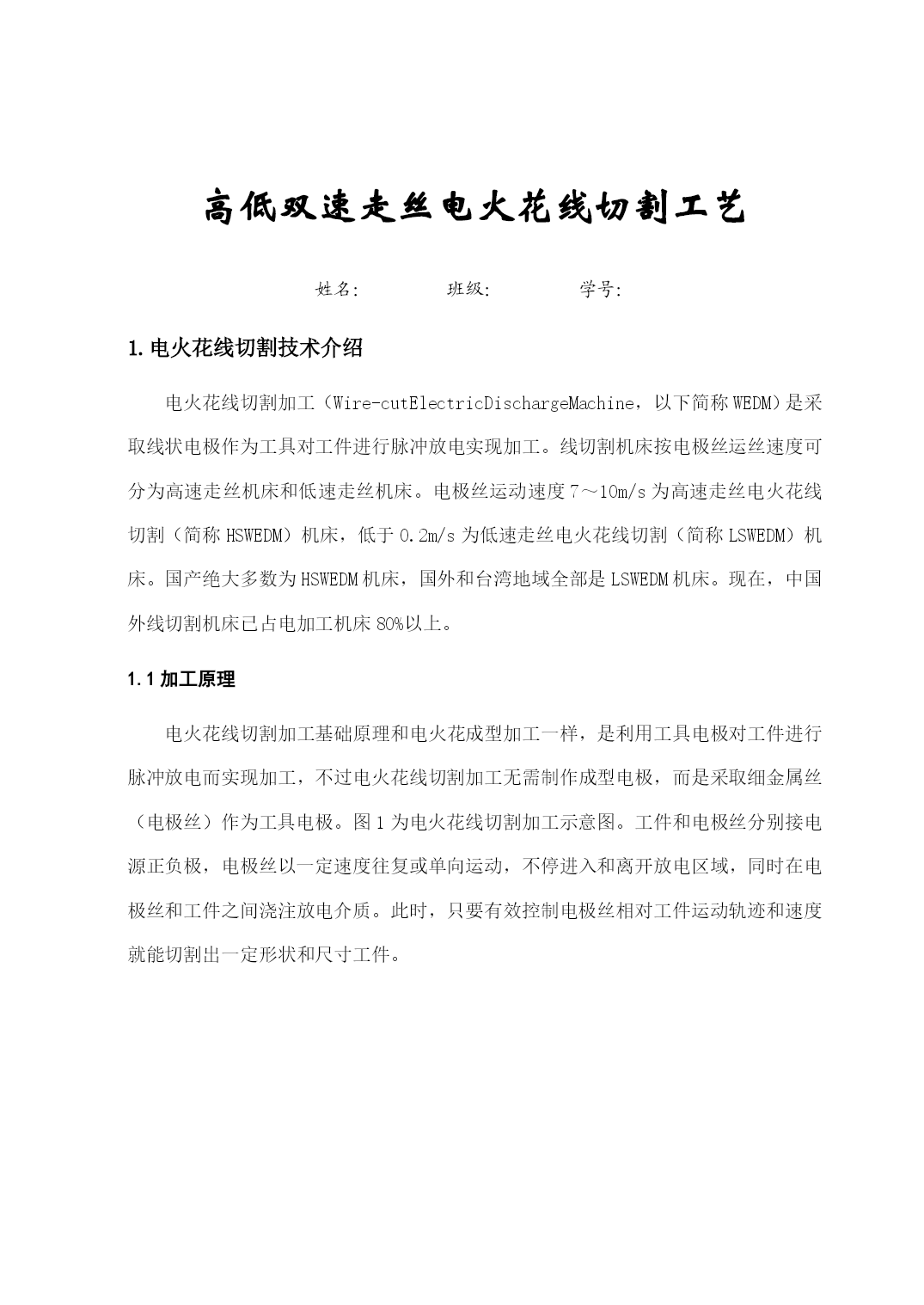 高低双速走丝电火花线切割工艺姓名:班级:学号:1.电火花线切割技术介绍电火花线切割加工(Wire-cutElectricDischargeMachine,以下简称WEDM)是采取线状电极作为工具对工件进行脉冲放电实现加工。线切割机床按电极丝运丝速度可分为高速走丝机床和低速走丝机床。电极丝运动速度7~10m/s为高速走丝电火花线切割(简称HSWEDM)机床,低于0.2m/s为低速走丝电火花线切割(简称LSWEDM)机床。国产绝大多数为HSWEDM机床,国外和台湾地域全部是LSWEDM机床。现在,中国外线切割