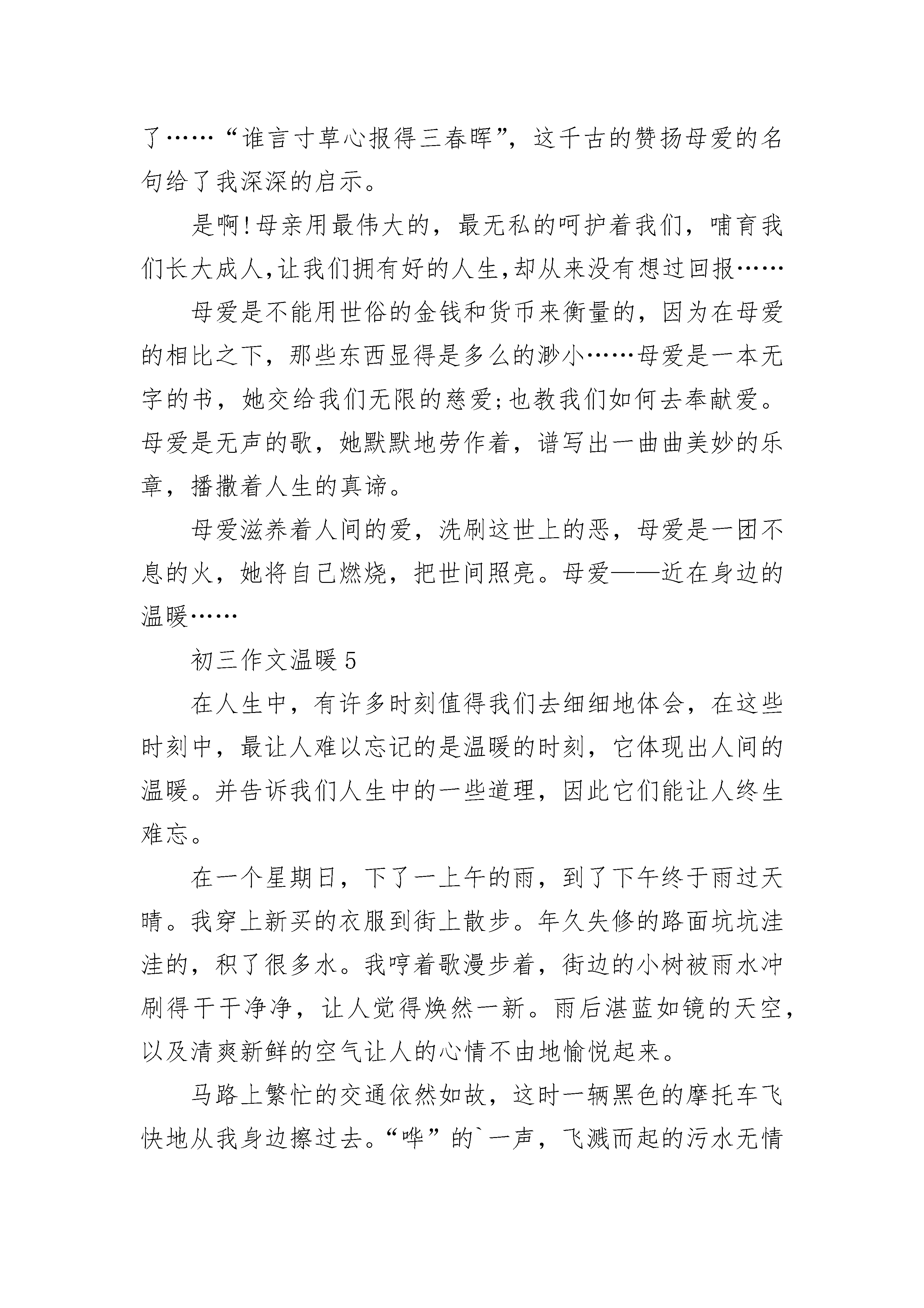 温暖初三作文关于温暖初三作文在日复一日的学习、工作或生活中,大家对作文都再熟悉不过了吧,借助作文人们可以反映客观事物、表达思想感情、传递知识信息。相信许多人会觉得作文很难写吧,下面是小编帮大家整理的关于温暖初三作文,仅供参考,欢迎大家阅读。关于温暖初三作文1温暖是初春的河上泛起的第一道涟漪;温暖是夜晚的庭院满溢的银色月光;温暖是傍晚天际擦过的飞鸿;温暖是你怦然心动的一抹温存。生活中的温暖有太多太多,犹如夜空中的繁星,闪闪烁烁。其中最亮的那一颗,永驻我的心间。随着放学铃声的响起,同学们陆陆续续地涌出教学楼。