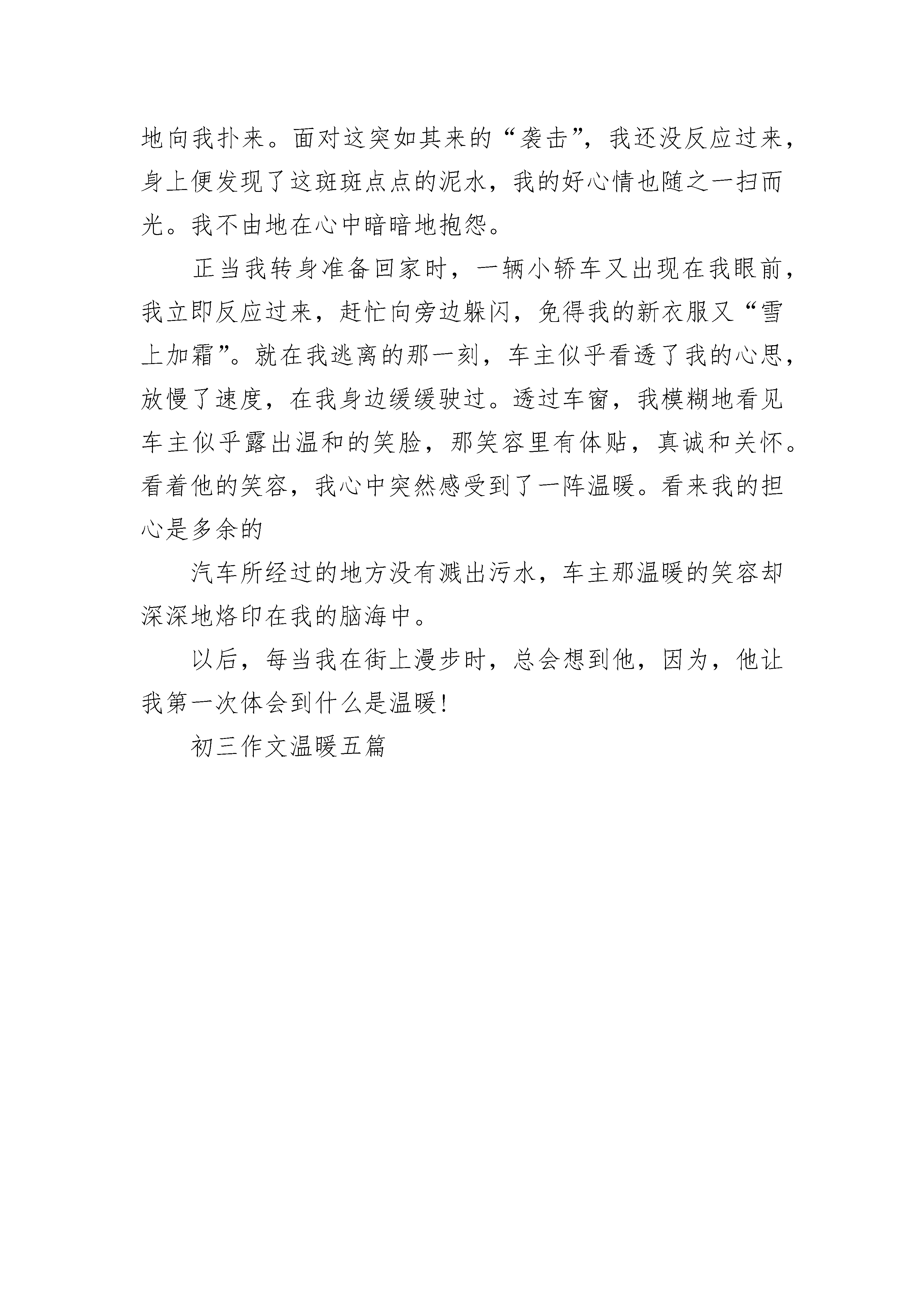 温暖的初三作文温暖的初三作文在平凡的学习、工作、生活中,大家最不陌生的就是作文了吧,作文可分为小学作文、中学作文、大学作文(论文)。你知道作文怎样写才规范吗?以下是小编收集整理的温暖的初三作文,仅供参考,希望能够帮助到大家。温暖的初三作文1温暖,我们生活中无处不在。一个动作,一句问候,一个眼神,像一缕阳光,深深地温暖人心。温暖就这么简单。自习课上,同学们纷纷低头各顾各的做着作业。一不小心,笔滑落在地,捡起来一看,笔头已断。我着急万分:怎么办呐,我只有这一支笔了。环顾四周,大家都忙的不亦乐乎,哪有时间管我的