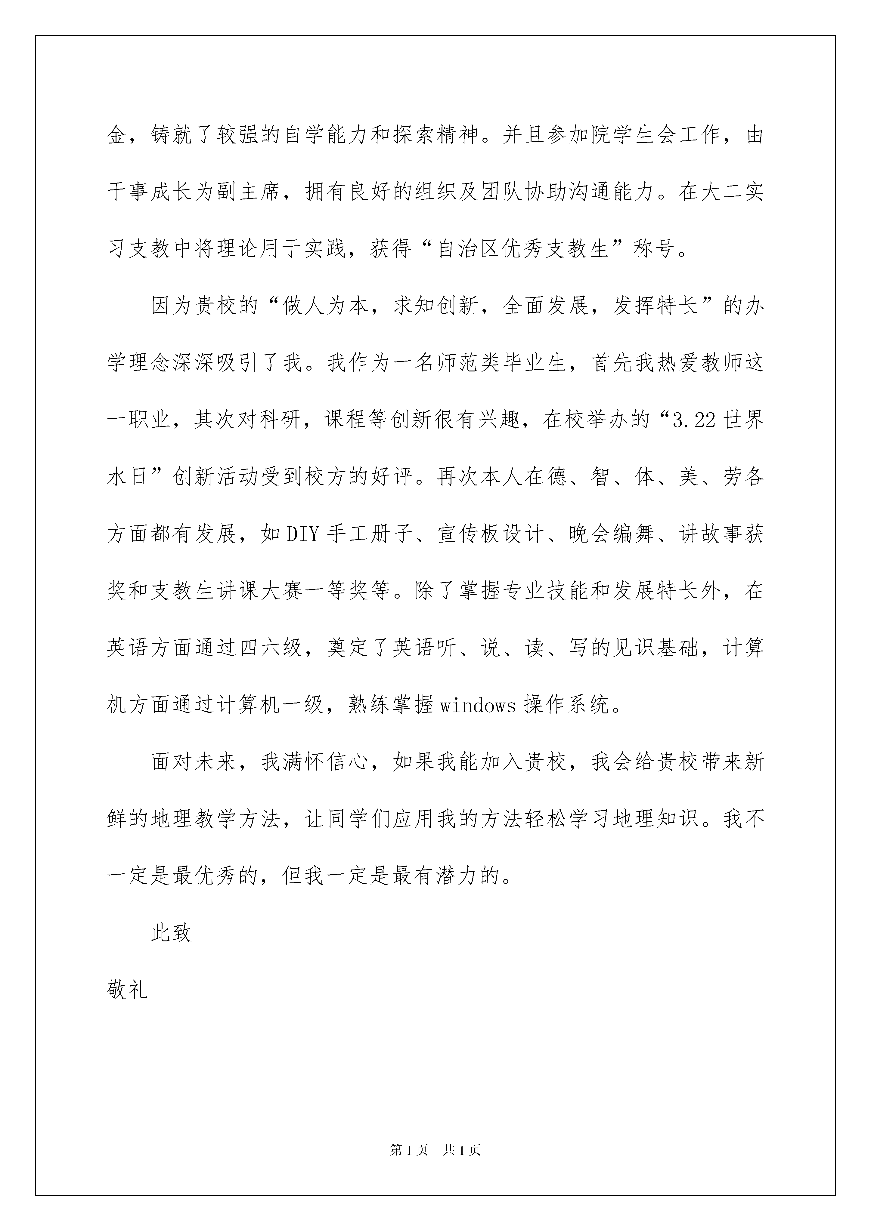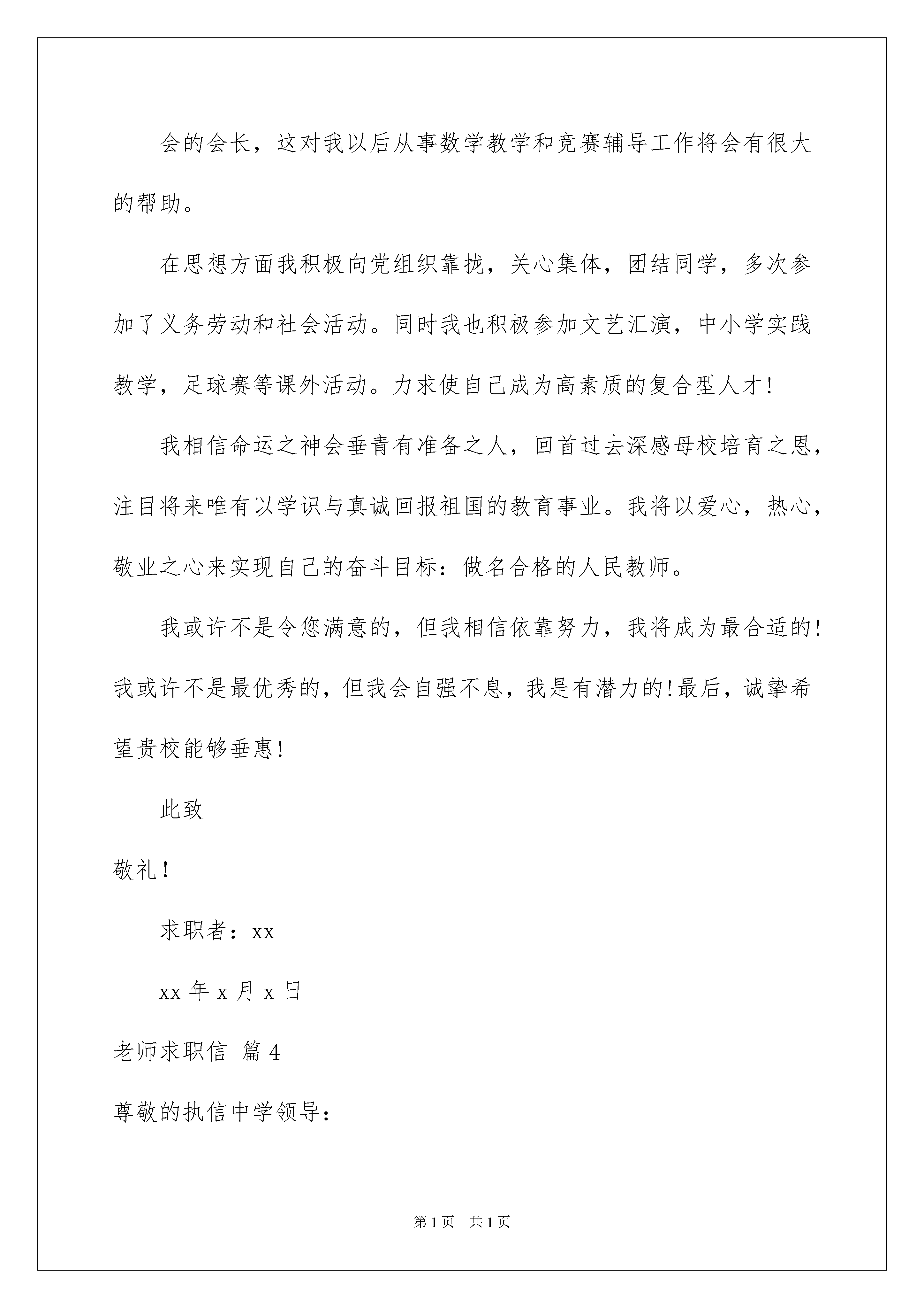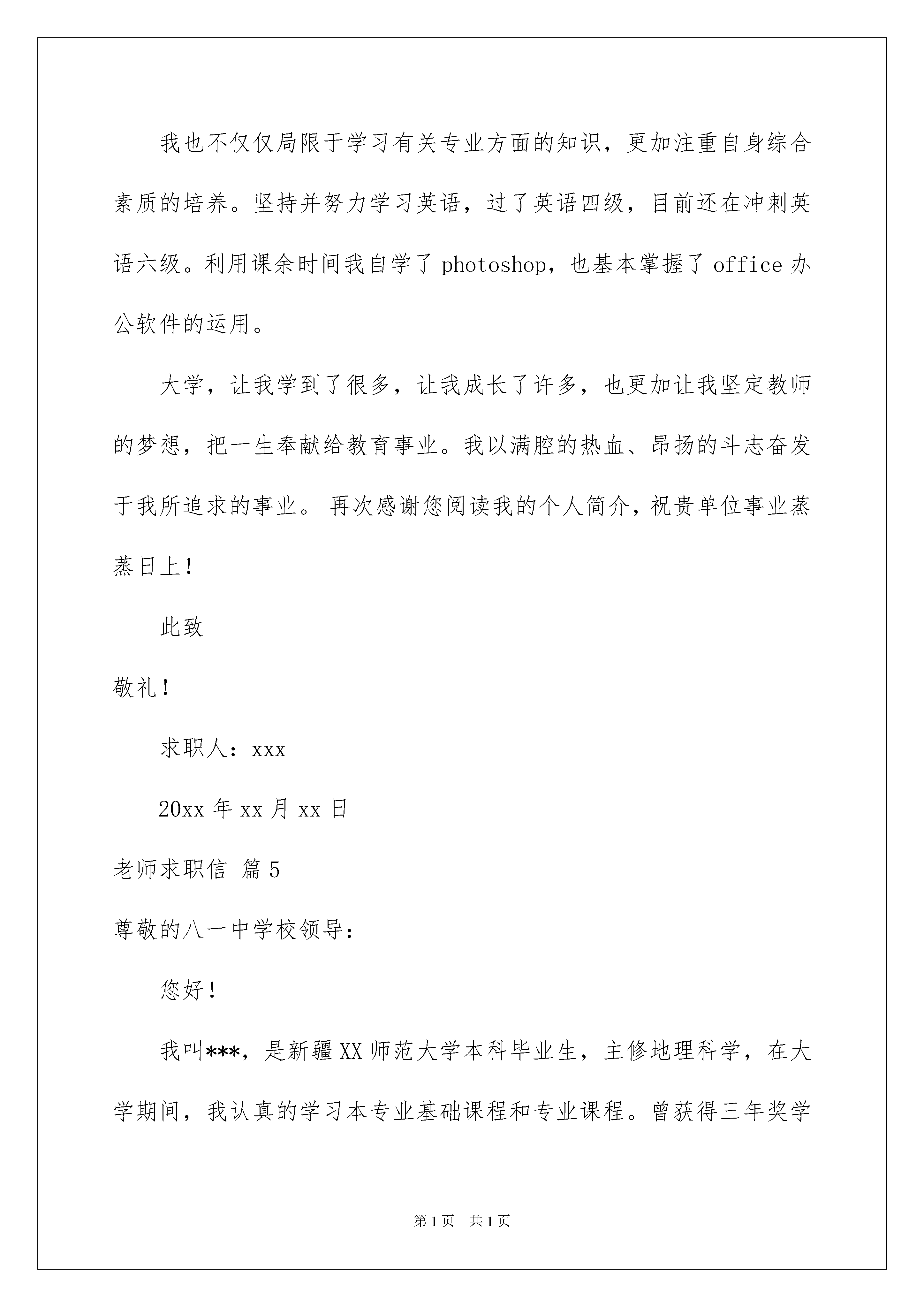 2022关于老师求职信5篇关于老师求职信5篇时间稍纵即逝,我们找工作的时间越来越近,此时是不是该好好写写求职信呢?你真的懂得怎么写好求职信吗?下面是我精心整理的老师求职信5篇,欢迎大家借鉴与参考,希望对大家有所帮助。老师求职信篇1恭敬的贵公司领导:您好!缘于对贵公司的向往和生长自我、成绩自我的渴望,作为一名即将走向社会的大门生,我由衷地期盼本身的奇迹之帆能从这里顺遂动身。头脑――统统举措的指南。专业课的学习不但使我更刚强了社会主义方向,并且使我更深刻地认识到敏锐地把握期间政治气味对一个公司企业的生长至关紧张。尤其是在创建当代企业制度进程中,人们险些告竣共鸣:强大的头脑动力是企业无形资产的构成部分之一。我乐意用本身的专业所学和公司同仁一起致力于企业头脑建立,加强公司凝结力、战斗力。管理――当代企业的紧张内容。在进入以人为核心的管理阶段,研究“企业怎样做人的事变”不可缺少。只管做人的事变很巨大,可此中也有成绩感。除了把握有关头脑教诲专业的大量知识外,我还自修了不少企业管理之类的课程,常常翻阅此方面的杂志,很有爱好在此方面实践一下,把理论用于实际生存中。执法――保障权益的有效武器。商战中,企业不免会陷入经济纠纷,为了打扫拦阻公司生长的倒霉因素,有须要诉诸于执法来维护合法的权益。虽说是搞头脑教诲的,但我还用心学习了大量的执法规矩,如有机遇,盼望能成为贵公司的一名执法办事事变者,为公司分忧解难积极。人无完人,故在积极改正缺点的同时,我不停把“活到老,学到老”作为本身的座右铭,不知贵公司可否给我一个继承学习的机遇?谢谢您的存眷,至于我是否是千里马,需您伯乐来裁定,渴望着您手中的荣幸神箭会射向我!求职人:20xx年xx月xx日老师求职信篇2尊敬的校领导:您好!首先请允许我向您致以真诚的问候和良好的祝愿!非常感谢您在百忙之中审阅我的求职信。我是xx师范学院美术系xx级美术学专业的毕业生,现在离开母校,即将踏入社会大学,心情是那样地兴奋又傍徨。我渴望一个新生活舞台,找到一个适合自己并值得为其奉献一切的工作单位。我20xx年出生于xx市滑县的一个农业大县,一个充满温馨的家庭,父母让我从小养成刻苦耐劳、谦虚谨慎、热情待人、朴实诚恳的生活态度。在四年的大学生涯中,我刻苦学习,力求上进,一直凭着"没有最好,只有更好"准则为之奋斗,取得优异的成绩,奠定了坚实的`专业基础。我学过的课程有:素描、油画、国画、internetphotoshop、visualfoxpro、网页制作等。我工作认真负责,在班级担任劳动委员、早操评分员。我是一个爱运动的男孩,常常喜欢在课余的时候去打打球,所以我拥有一个健康的体质。在激烈的人才竞争中,我拥有大学生的渊博知识,我有颗真挚的心和拼搏进取的精神,愿为贵校贡献一份自己的力量,更好地为贵校服务。虽然我刚从学校毕业,没有实际的工作经验,但我相信像贵校那样重能力、重水平、重开拓,有远见的单位,一定能把能力、水平与经验等同视之。给新人一个显身手的机会,希望贵校能给我一个机会,能考虑我,我迫切希望早日成为贵单位的一员。如我有幸成为贵校的一员,将严格遵守单位的各项规章制度,发挥自己的聪明才智,开拓创新,创造业绩,以报答贵校对我的信任!(另随表附上个人简历等复印件)祝贵校的事业蒸蒸日上!求职人:xxx20xx年x月x日老师求职信篇3尊敬的领导:您好!当您翻开这一页的时候,在即将投身社会之际,我希望在贵校谋求到一份与专业和兴趣相符的工作,终生学习,不断提高,实现自己的人生价值。我怀着一颗赤诚的心和对教育工作的执著追求,真诚地向您推荐自己。我叫方超,是一名江苏师范大学数学与应用数学专业的应届毕业生。经过四年的认真学习和不懈努力,我已具备了系统的专业知识和一定的教学实际能力,做一名优秀的教师是我一直以来的理想,现在正准备以高昂的热情与所学的知识投入到社会之中,服务于教育事业,实现自身的价值。贵校,江苏省溧阳中学,是我的母校。对这里的一切我都无比熟悉,这也将成为我以后工作的优势。也正是这里良好的管理体制,浓厚的教学氛围和积极进取的精神使我能够进入大学学习,选择了师范专业以后我变将这里作为自己毕业后的首选目标,相信在母校领导的帮助指导下,通过自身的努力,我会成为一名合格的人民教师,希望母校能给我提供一个施展才华的机会!大学的四年时光里,我本着自强不息,学以致用的原则,一直以认真的态度对待学习。在学好专业课的同时,我也注重综合知识和综合技能的培养与提高,广泛的涉猎了文学,哲学,心理学,教育学等方面的书籍,计算机理论与操作也具有一定的水平。在教师技能方面,我勤学苦练,不断提高自身的整体水平,并在教育