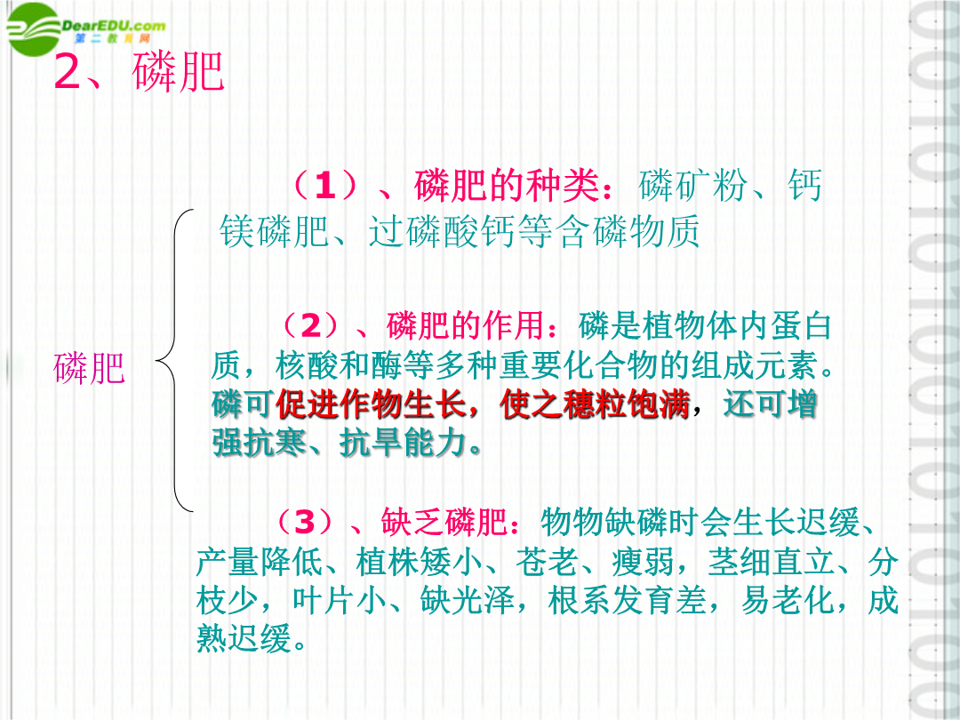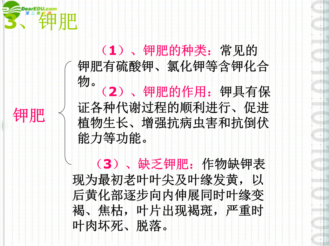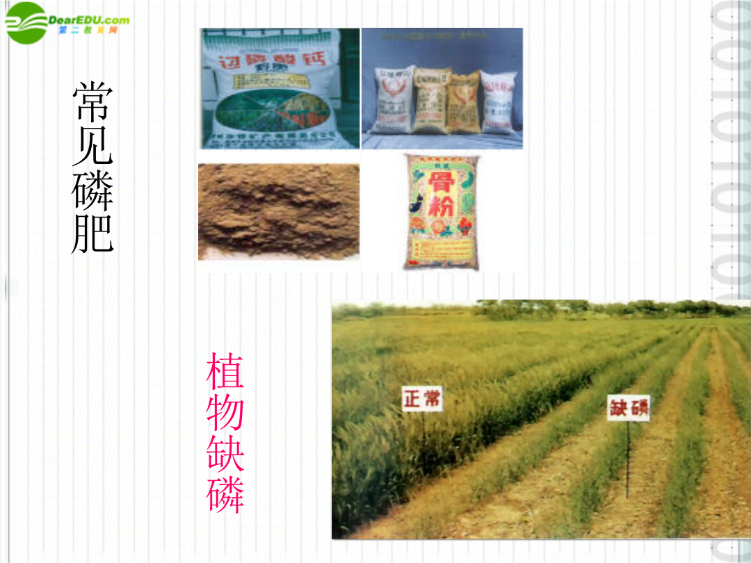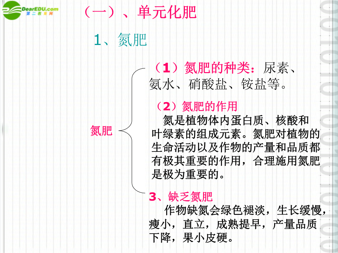 化学肥料作物的生长发育不可缺少的化学元素有十六种,即:碳、氧、氢、氮、磷、钾、钙、镁、硫、铁、锰、铜、硼、锌、钼、氯。以碳、氧、氢三种元素需要量最大,其来源是空气和水;其次,作物需要量较大的是氮、磷、钾等,则需从土壤中吸收,而土壤里氮、磷、钾三种元素往往难以满足作物的需要。氮肥注意:(1)NH4HCO3=NH3↑+H2O+CO2↑(2)NH4NO3在高温,受猛烈撞击易爆炸。尿素白色晶体缺氮植株矮小瘦弱,叶片发黄,严重时叶脉呈淡棕色磷肥缺磷叶片呈深褐色略带紫色,尤其叶鞘部紫色很明