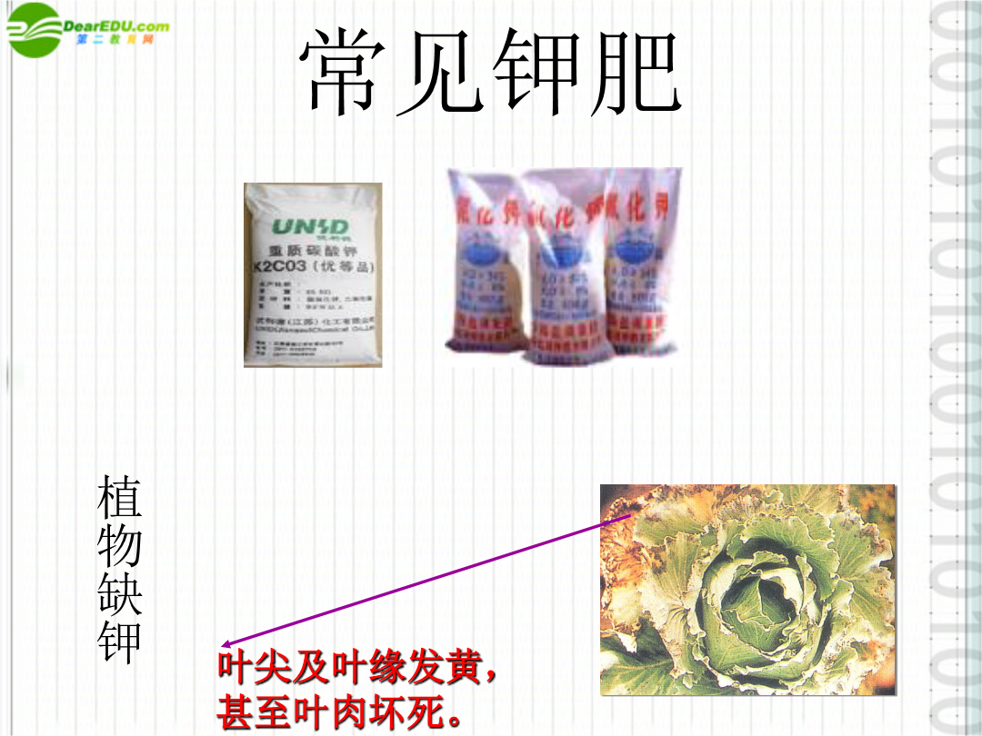 第十一元盐化肥植物生长需要养分,土壤所能提供的养分是有限的,因此要靠施肥来补充。最初使用的肥料是人畜粪便、植物体等沤制的天然有机肥料。随着人们对化学元素与植物生长关系的了解,出现了以化学和物理方法制成的含农作物生长所需营养元素的化学肥料。现在,施用化肥已经成为了农作物增产的最有力措施,施用化肥的增产作用占各增产因素总和的30%—60%。农作物所需的营养元素有许多种,其中,氮、磷、钾的需要量较大,因此,氮肥、磷肥、钾肥是最主要的化学肥料。1.氮肥常见的氮肥:2.磷肥常见的磷肥:钾在植物代谢活跃的器官和组织中