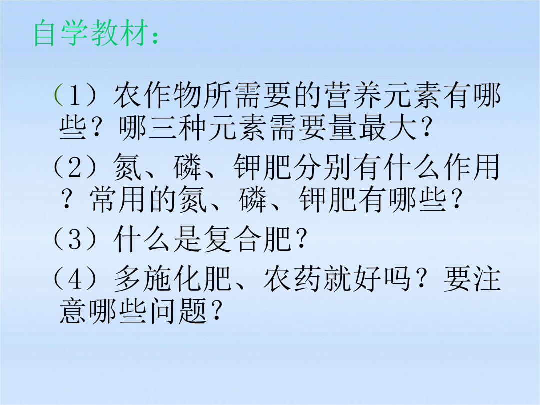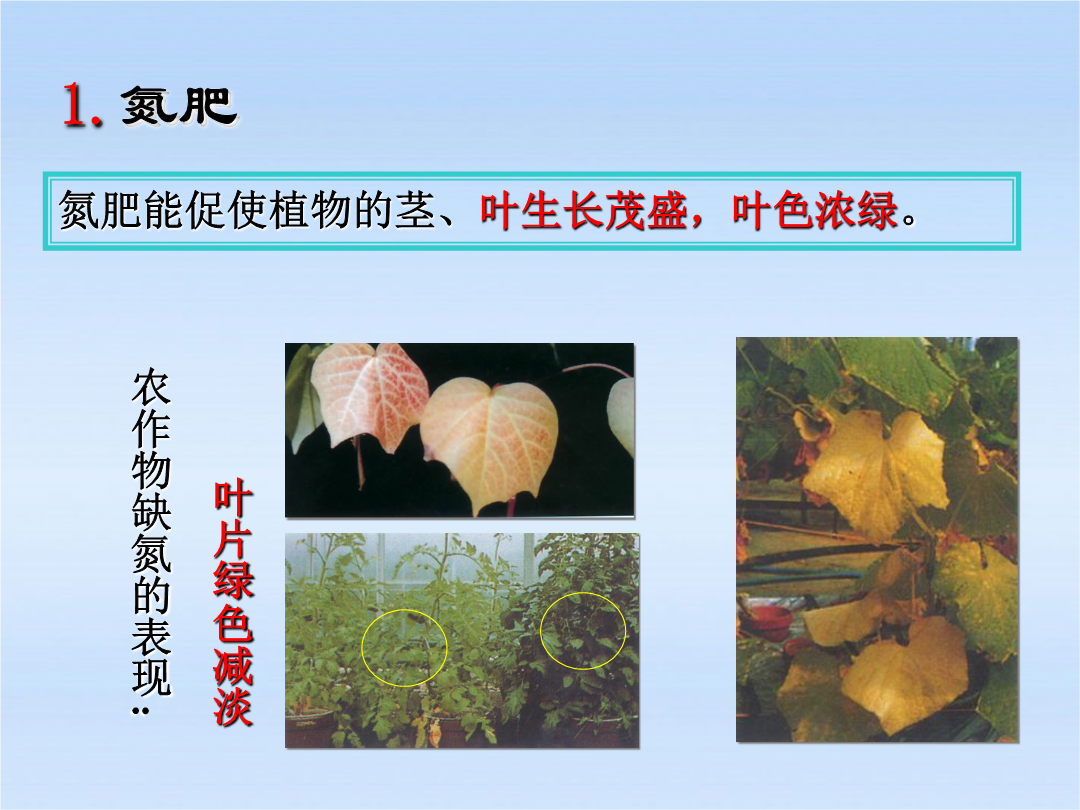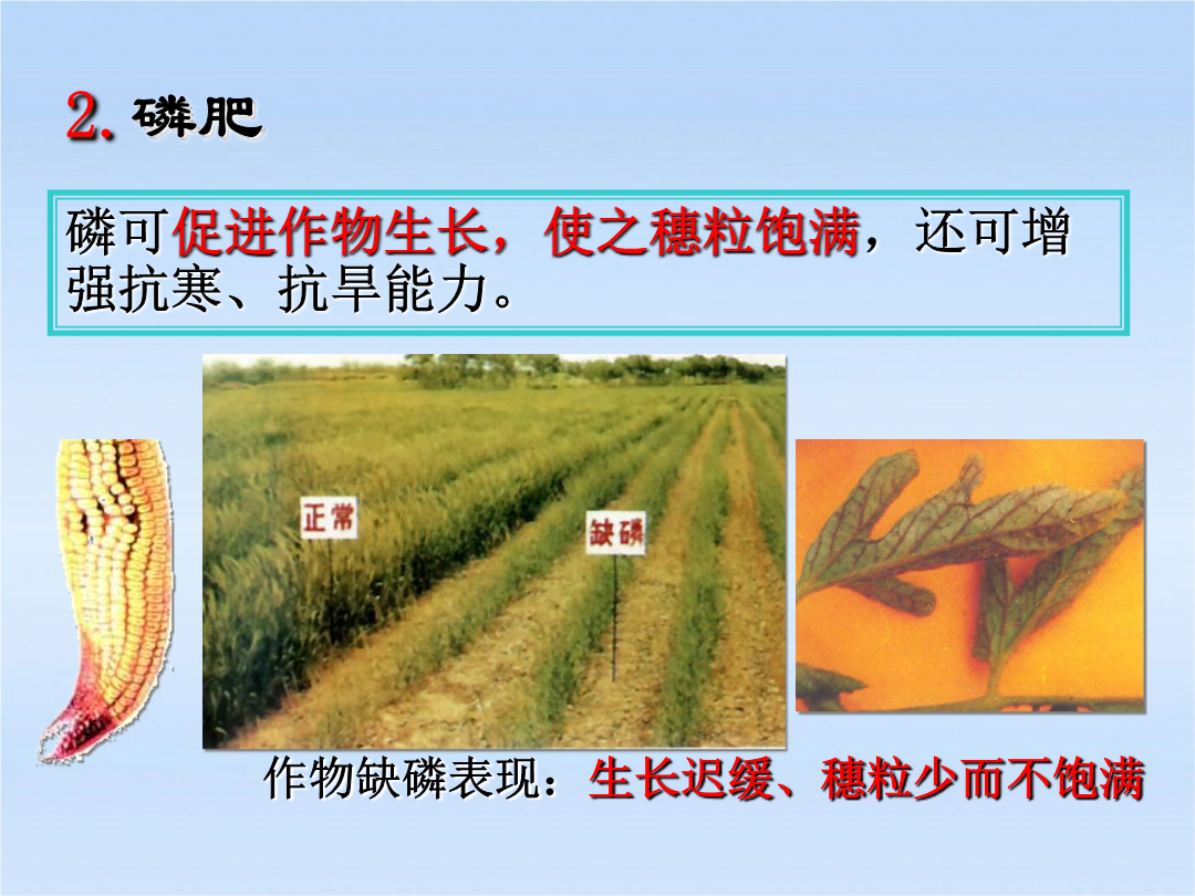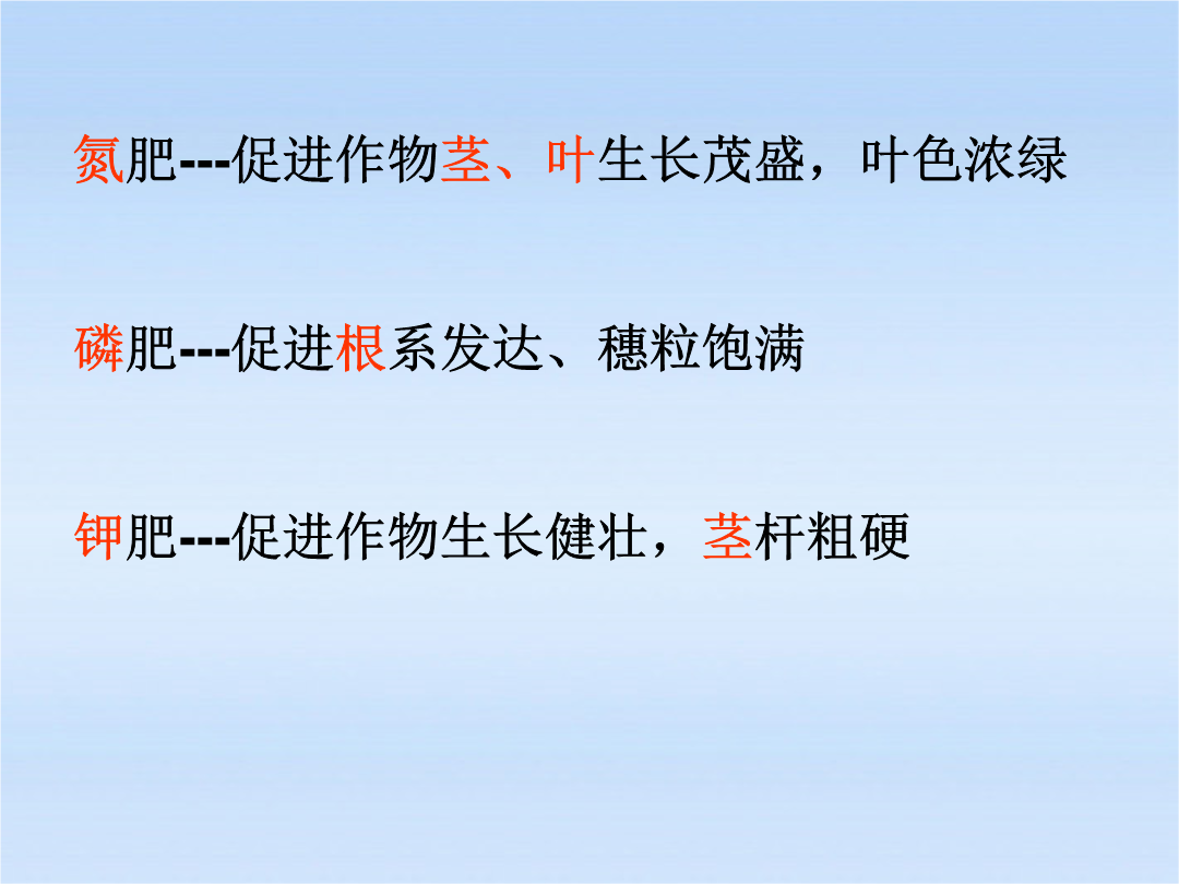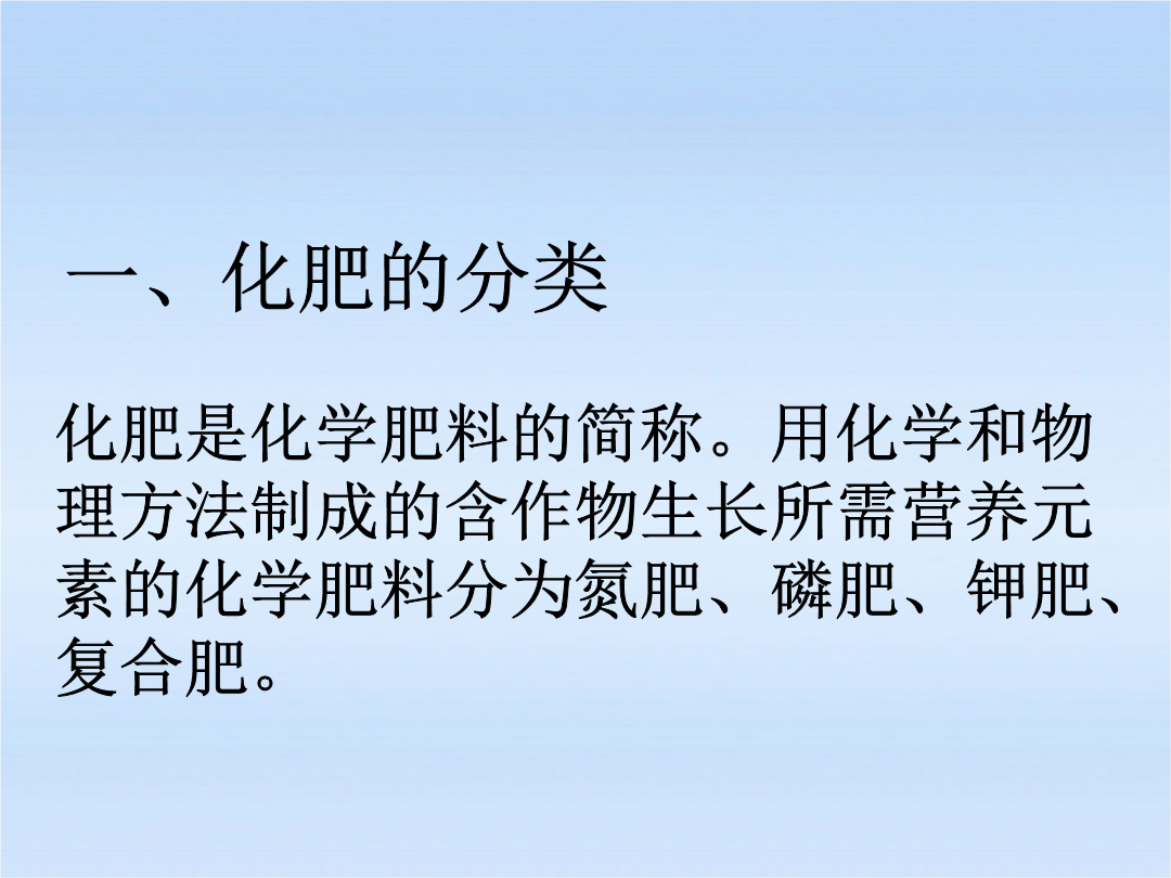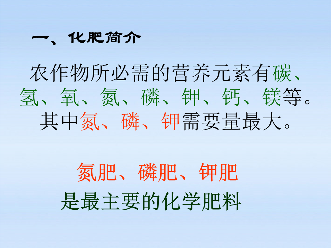化学肥料作物的生长发育不可缺少的化学元素有十六种,即:碳、氧、氢、氮、磷、钾、钙、镁、硫、铁、锰、铜、硼、锌、钼、氯。以碳、氧、氢三种元素需要量最大,其来源是空气和水;其次,作物需要量较大的是氮、磷、钾等,则需从土壤中吸收,而土壤里氮、磷、钾三种元素往往难以满足作物的需要。氮肥注意:(1)NH4HCO3=NH3↑+H2O+CO2↑(2)NH4NO3在高温,受猛烈撞击易爆炸。尿素白色晶体缺氮植株矮小瘦弱,叶片发黄,严重时叶脉呈淡棕色磷肥缺磷叶片呈深褐色略带紫色,尤其叶鞘部紫色很明