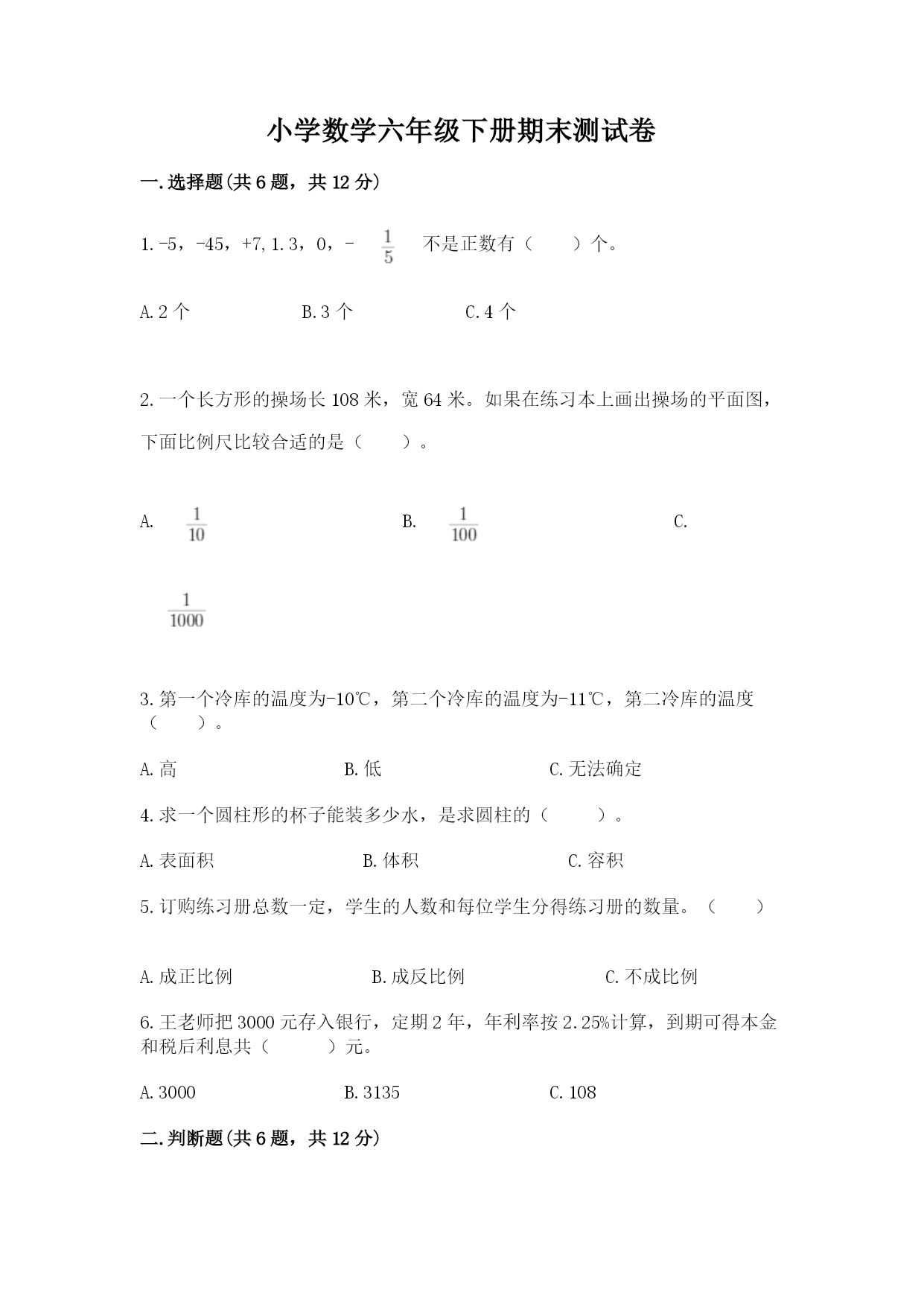 小学数学六年级下册期末测试卷一.选择题(共6题,共12分)1.-5,-45,+7,1.3,0,-不是正数有()个。A.2个B.3个C.4个2.一个长方形的操场长108米,宽64米。如果在练习本上画出操场的平面图,下面比例尺比较合适的是()。A.B.C.3.第一个冷库的温度为-10℃,第二个冷库的温度为-11℃,第二冷库的温度()。A.高B.低C.无法确定4.求一个圆柱形的杯子能装多少水,是求圆柱的()。A.表面积B.体积C.容积5.订购练习册总数一定,学生的人数和每位学生分得练习册的数量。()A.成正比例