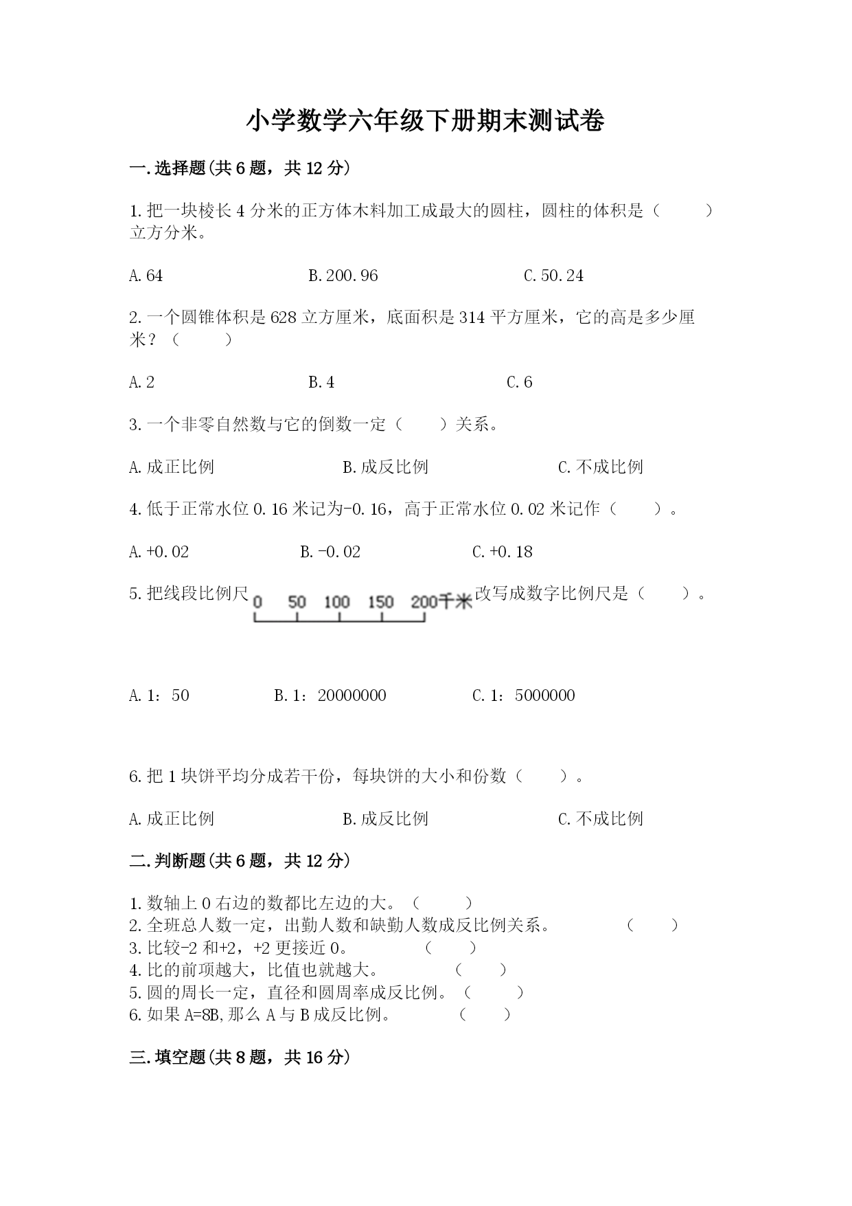 小学数学六年级下册期末测试卷一.选择题(共6题,共12分)1.把一块棱长4分米的正方体木料加工成最大的圆柱,圆柱的体积是()立方分米。A.64B.200.96C.50.242.一个圆锥体积是628立方厘米,底面积是314平方厘米,它的高是多少厘米?()A.2B.4C.63.一个非零自然数与它的倒数一定()关系。A.成正比例B.成反比例C.不成比例4.低于正常水位0.16米记为-0.16,高于正常水位0.02米记作()。A.+0.02B.-0.02C.+0.185.把线段比例尺改写成数字比例尺是()。A.1