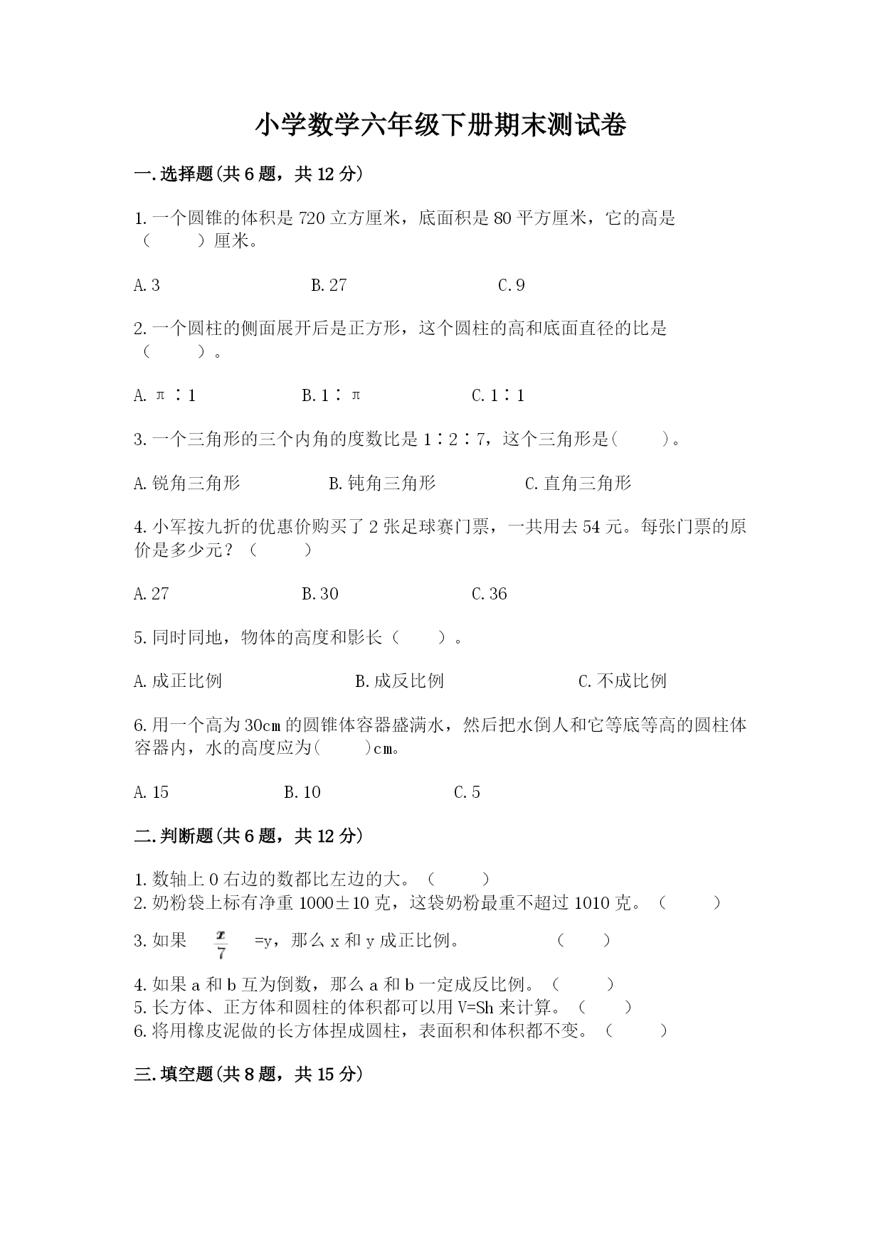 小学数学六年级下册期末测试卷一.选择题(共6题,共12分)1.一个圆锥的体积是720立方厘米,底面积是80平方厘米,它的高是()厘米。A.3B.27C.92.一个圆柱的侧面展开后是正方形,这个圆柱的高和底面直径的比是()。A.π∶1B.1∶πC.1∶13.一个三角形的三个内角的度数比是1∶2∶7,这个三角形是()。A.锐角三角形B.钝角三角形C.直角三角形4.小军按九折的优惠价购买了2张足球赛门票,一共用去54元。每张门票的原价是多少元?()A.27B.30C.365.同时同地,物体的高度和影长()。A.