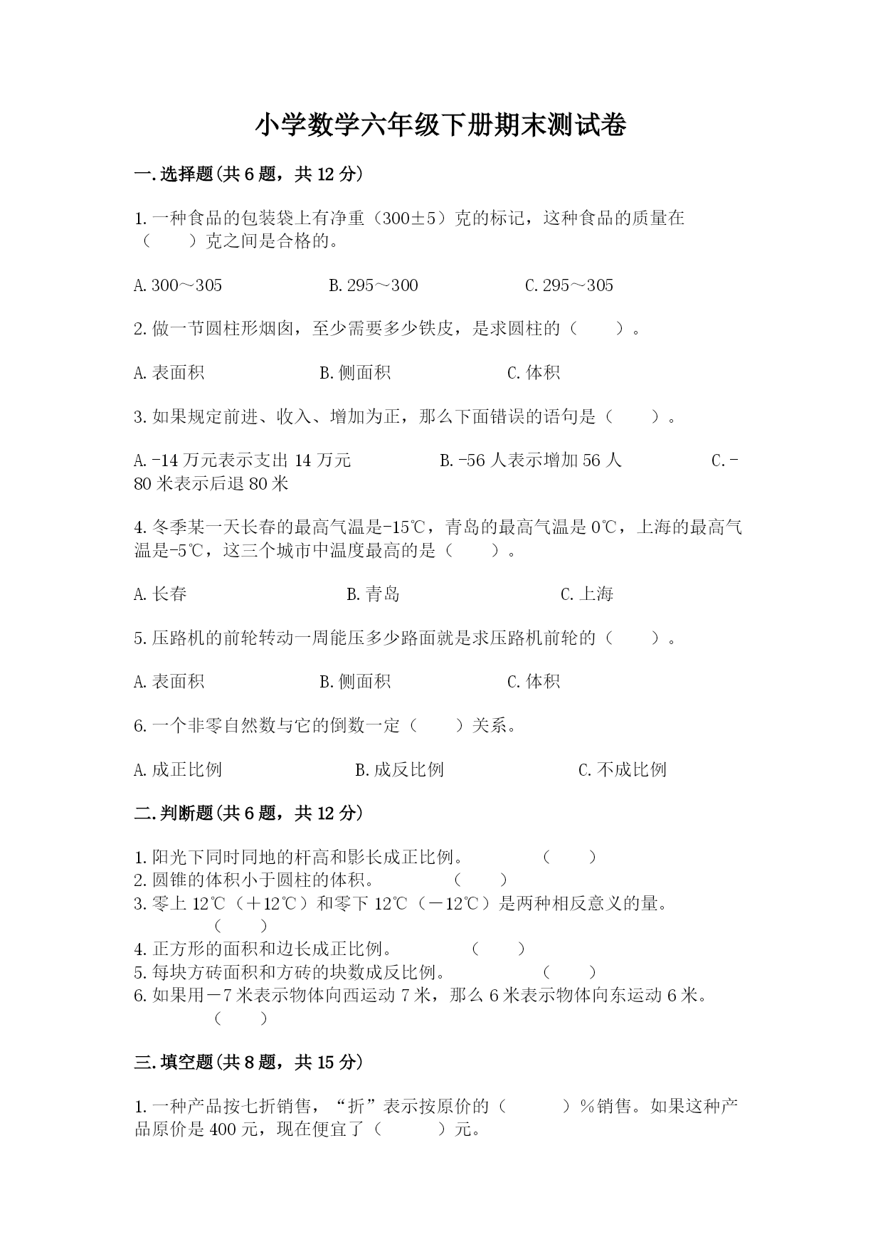 小学数学六年级下册期末测试卷一.选择题(共6题,共12分)1.一种食品的包装袋上有净重(300±5)克的标记,这种食品的质量在()克之间是合格的。A.300~305B.295~300C.295~3052.做一节圆柱形烟囱,至少需要多少铁皮,是求圆柱的()。A.表面积B.侧面积C.体积3.如果规定前进、收入、增加为正,那么下面错误的语句是()。A.-14万元表示支出14万元B.-56人表示增加56人C.-80米表示后退80米4.冬季某一天长春的最高气温是-15℃,青岛的最高气温是0℃,上海的最高气温是-5℃