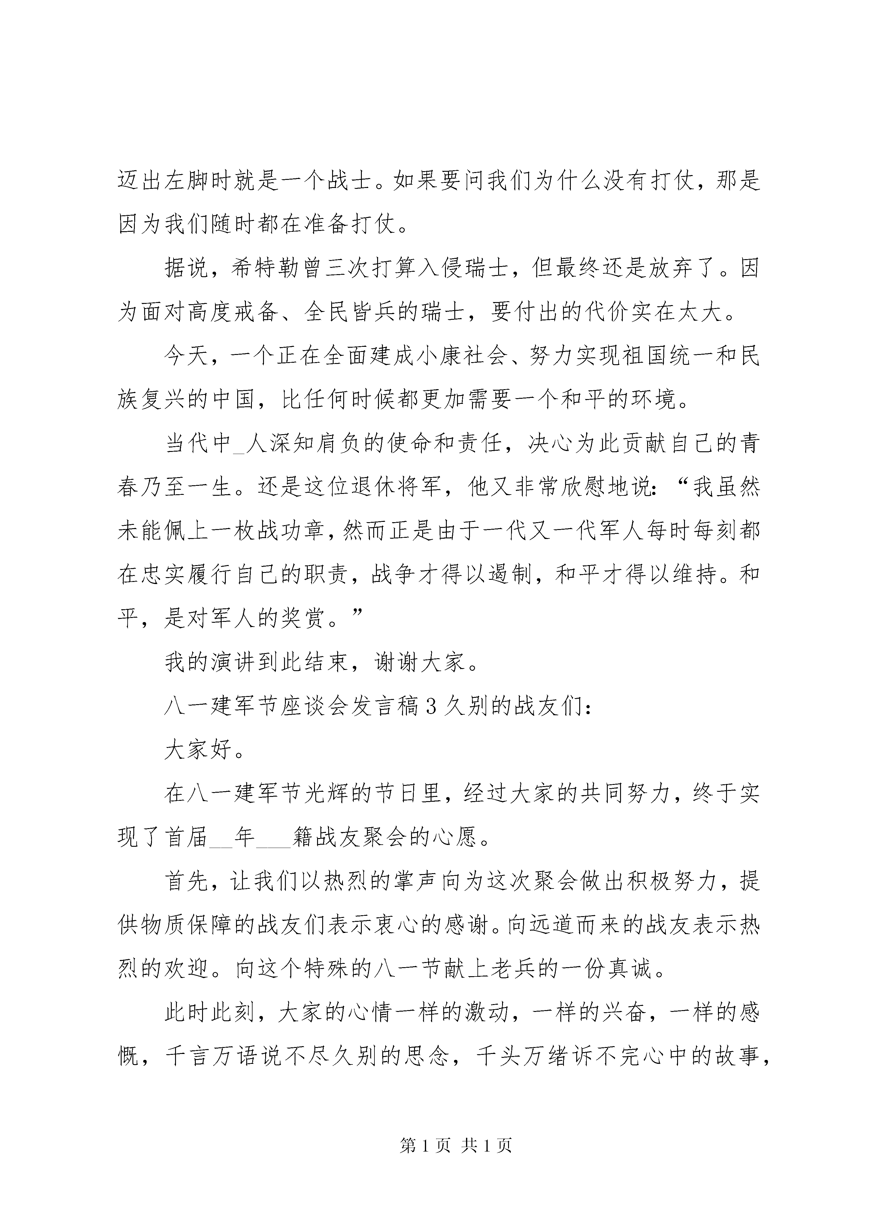 八一建军节座谈会发言稿精品多篇为的会员“iiqjja”投稿推荐但愿对你的学习工作带来帮助。伟大的中国人民解放军在中国共产党的领导下历经了艰苦卓绝的战争才赢得了中华人民共和国的建立。时值中国人民解放军建军93周年之际向军人们致以节日的问候和崇高的敬意。下面是小编为大家整理的八一建军节座谈会发言稿优秀范文5篇欢迎大家阅读借鉴但愿对你有借鉴作用。八一建军节座谈会发言稿范文一光阴似箭日月如梭时间过得很快又到八一建军节了。今天我怀着无比激动和感恩的心情在这里表示一下自己