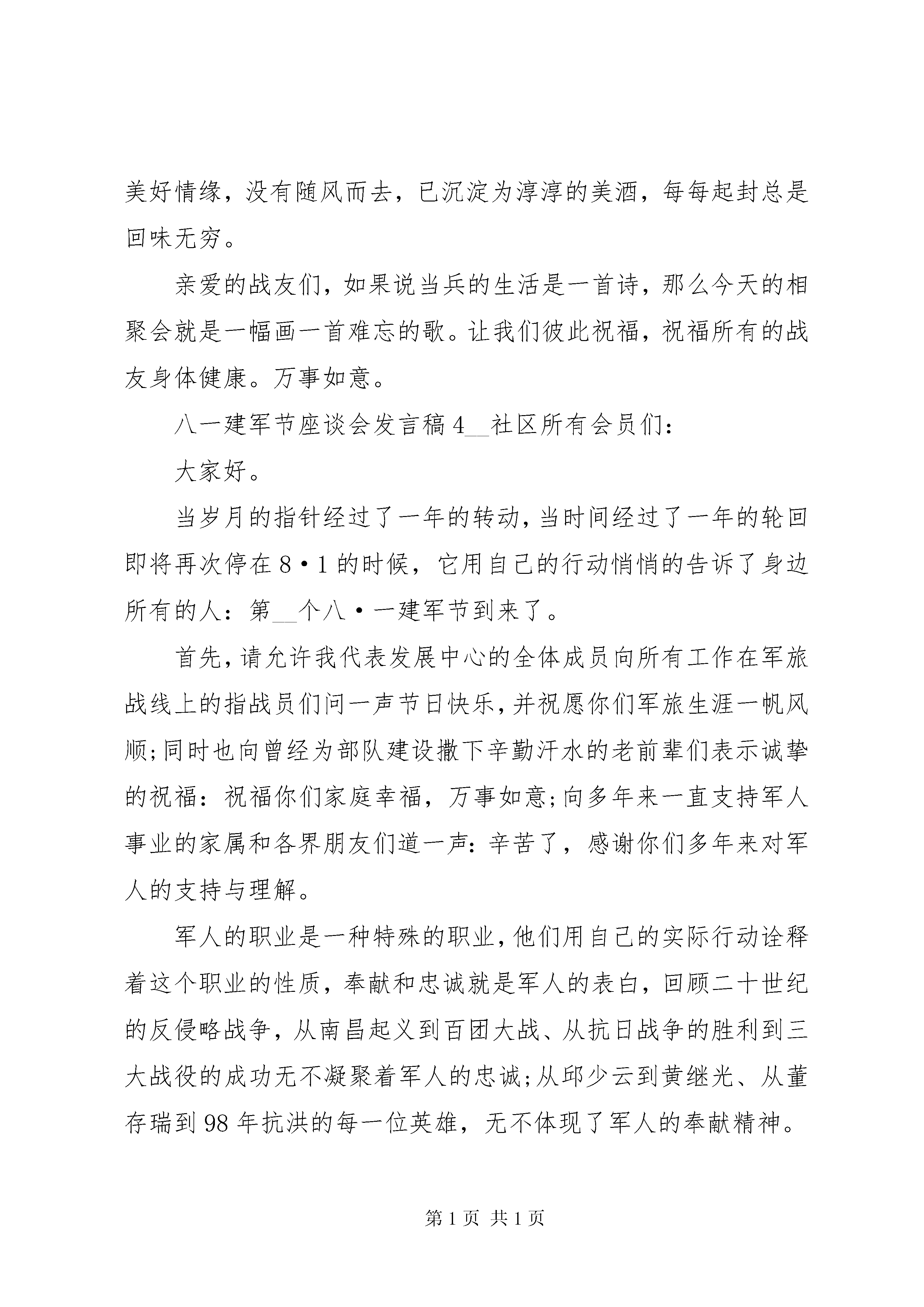 八一建军节座谈会发言稿多篇为的会员“cbzcl”投稿推荐但愿对你的学习工作带来帮助。八一建军节座谈会发言稿有哪些。“军爱民民拥军”军民共建鱼水情深是我们优良的革命传统。在新形势下我们更应该让这一传统焕发活力与光彩。共同阅读八一建军节座谈会发言稿5篇精选大全请您阅读。八一建军节座谈会发言稿1尊敬的_亲爱的战友们:你们好。今天是全军上下热烈欢庆的日子是建军__周年是八一建军节今天是个隆重的节日。今天我演讲的题目是《心系八一》。