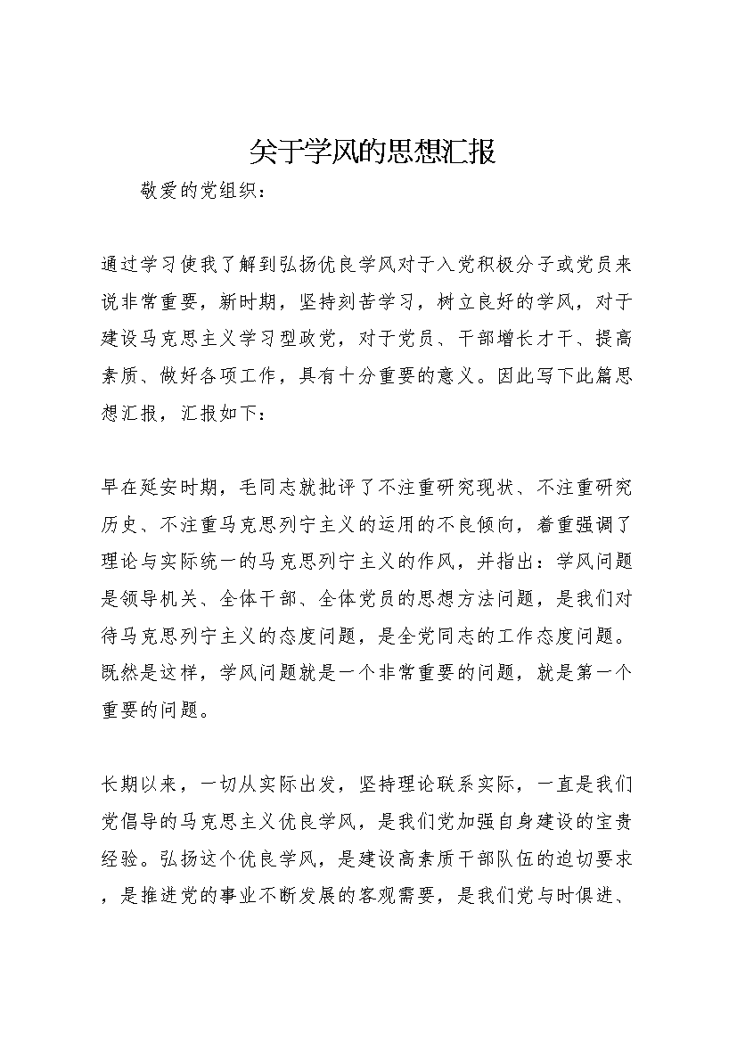 关于学风的思想汇报敬爱的党组织:通过学习使我了解到弘扬优良学风对于入党积极分子或党员来说非常重要新时期坚持刻苦学习树立良好的学风对于建设马克思主义学习型政党对于党员、干部增长才干、提高素质、做好各项工作具有十分重要的意义。因此写下此篇思想汇报汇报如下:早在延安时期毛同志就批评了不注重研究现状、不注重研究历史、不注重马克思列宁主义的运用的不良倾向着重强调了理论与实际统一的马克思列宁主义的作风并指出:学风问题是领导机关、全体干部、全体党员的思想方法问题是我们对待马克思列宁主义的态度