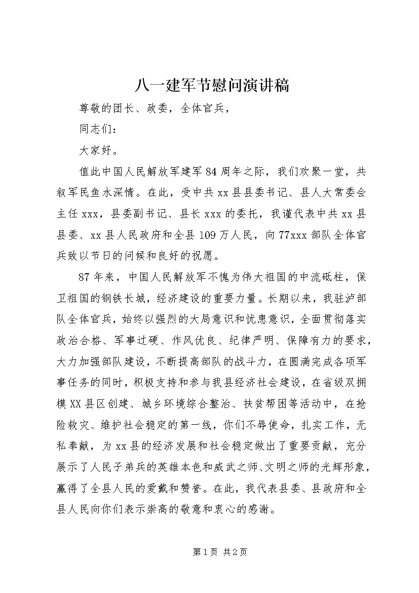 八一建军节慰问演讲稿尊敬的团长、政委全体官兵同志们:大家好。值此中国人民解放军建军84周年之际我们欢聚一堂共叙军民鱼水深情。在此受中共xx县县委书记、县人大常委会主任xxx县委副书记、县长xxx的委托我谨代表中共xx县县委、xx县人民政府和全县109万人民向77xxx部队全体官兵致以节日的问候和良好的祝愿。87年来中国人民解放军不愧为伟大祖国的中流砥柱保卫祖国的钢铁长城经济建设的重要力量。长期以来我驻泸部队全体官兵始终以强烈的大局意识和忧患意识