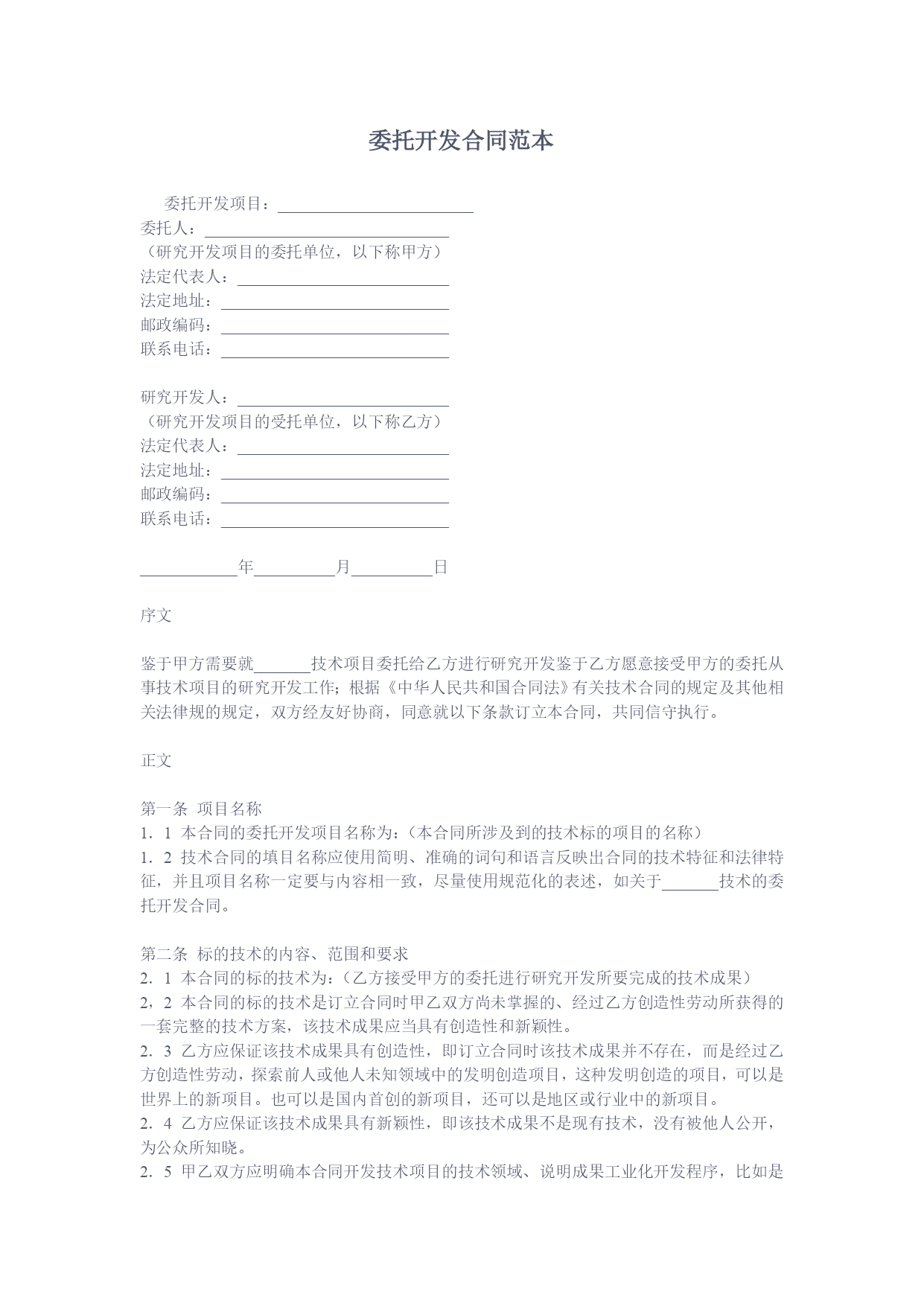 委托开发合同范本委托开发合同是一方当事人委托另一方当事人进行技术开发所订立的合同。委托开发合同怎么写?以下是查字典范文网小编为大家整理的委托开发合同范文,欢迎参考阅读。委托开发合同范文1委托方:_________(以下简称甲方)法定代表人或负责人:_________分析开发方:_________(以下简称乙方)法定代表人或负责人:_________依据中华人民共和国合同法的有关规定,经双方当事人协商一致,签订本合同。1.项目名称:_________。(注:本参考格式适用于新技术、新产品、新材料、新工艺及其