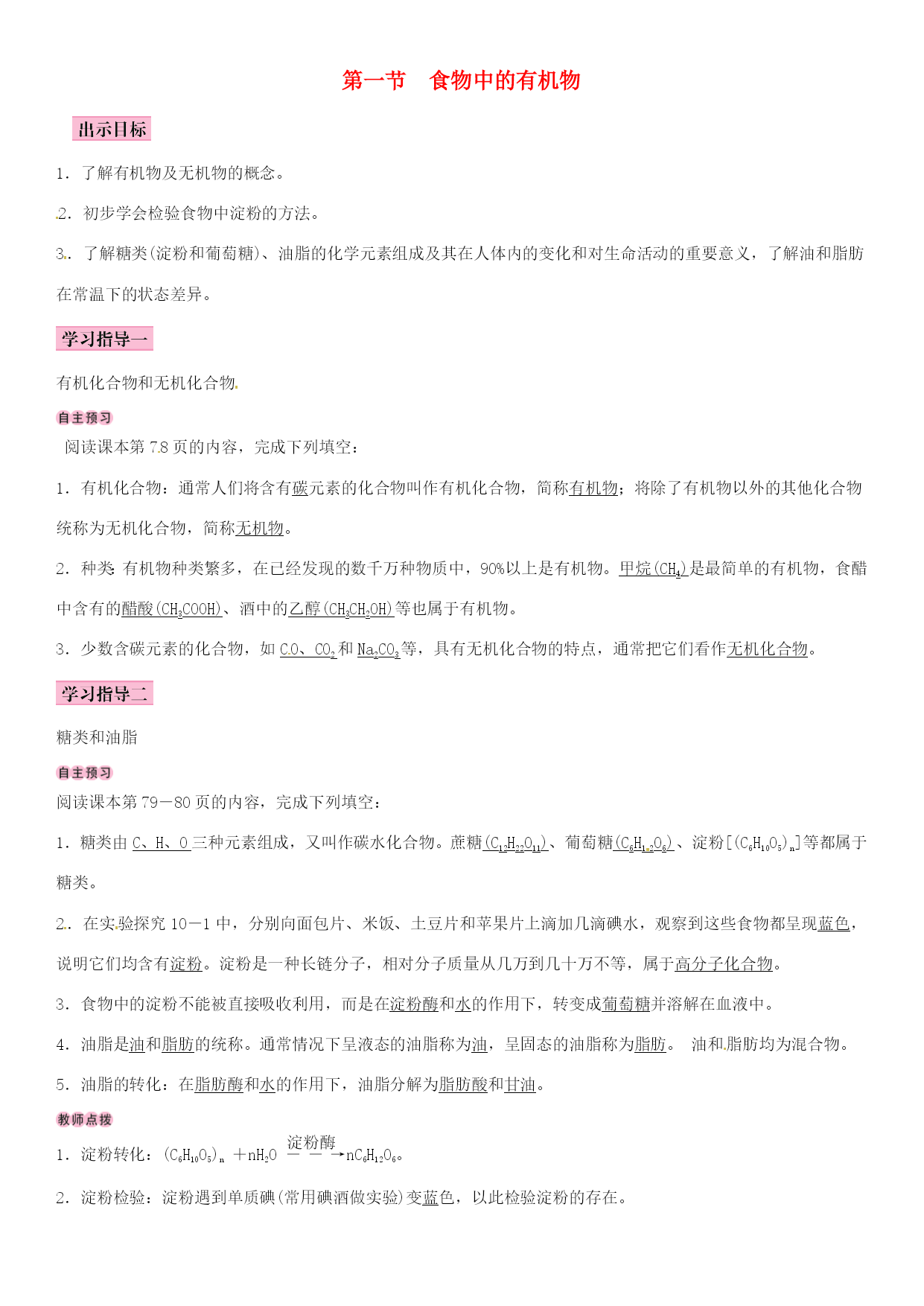 2第一节食物中的有机物1.了解有机物及无机物的概念。2.初步学会检验食物中淀粉的方法。3.了解糖类(淀粉和葡萄糖)、油脂的化学元素组成及其在人体内的变化和对生命活动的重要意义,了解油和脂肪在常温下的状态差异。有机化合物和无机化合物阅读课本的内容,完成下列填空:1.有机化合物:通常人们将含有碳元素的化合物叫作有机化合物,简称有机物;将除了有机物以外的其他化合物统称为无机化合物,简称无机物。2.种类:有机物种类繁多,在已经发现的数千万种物质中,90%以上是有机物。甲