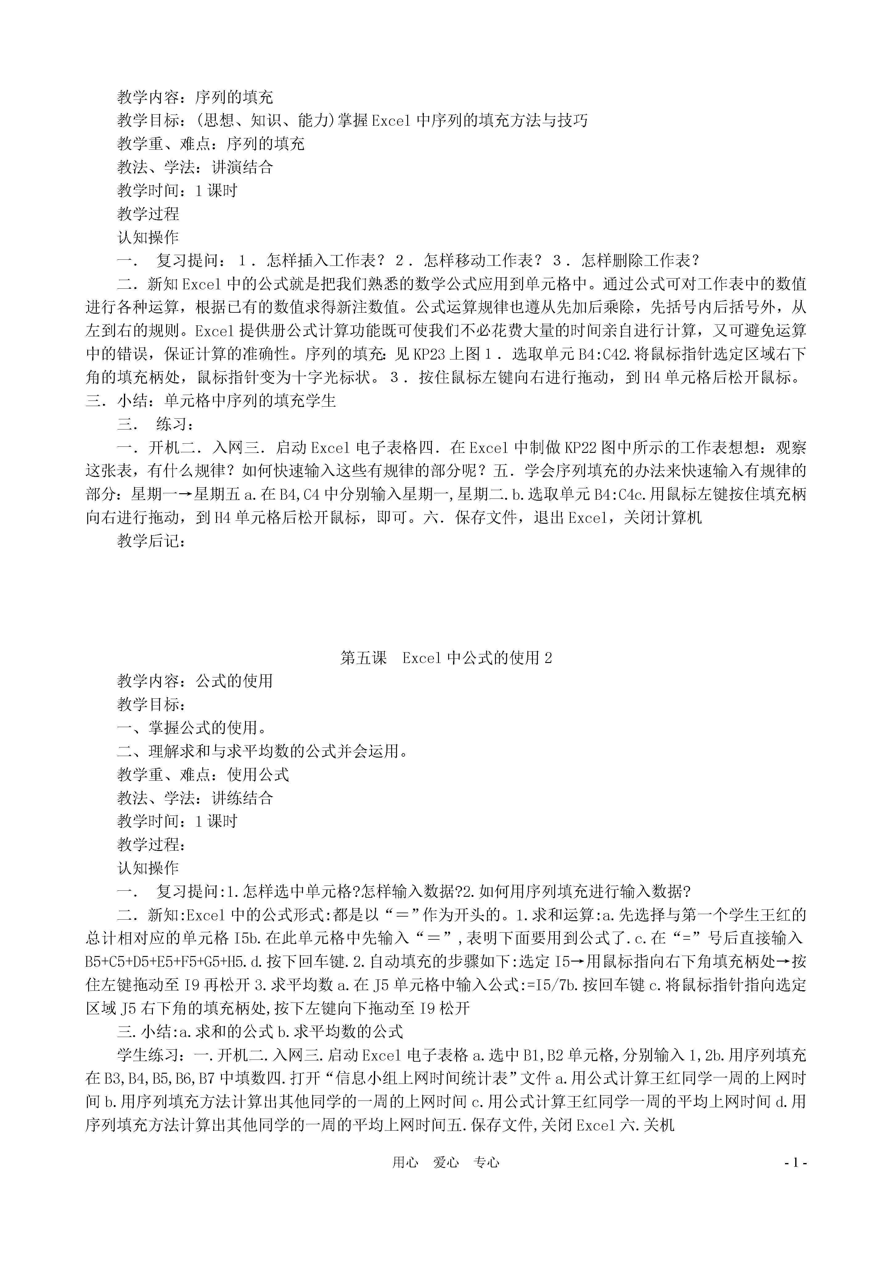 -1-用心爱心专心用心爱心专心第一课初识电子表格教学内容:电子表格的启动与组成教学目标:(思想、知识、能力)1.了解什么叫MicrosoftExcel2.掌握如何启动Excel电子表格3.掌握Excel窗口的组成教学重、难点:Excel启动,Excel窗口的组成教法、学法:讲演辅结合教学时间:1课时教学过程:认知操作一.复习提问1.怎样开机,关机?2.学校机房计算机如何登录入网?二.学习新知1.Excel的自我介绍Excel的特长:进行数据处理,对处理结果进行