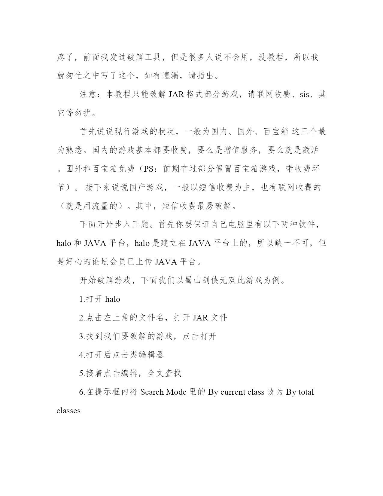 手机游戏下载java,手机游戏下载免费,手机游戏破解版下载,手机游戏...篇一:手机java游戏破解全攻略手机java游戏破解全攻略(图文非转载,是我亲自操作的哦~)国产游戏一般都收费(严重鄙视),但其中不乏好玩的,所以特意学会破解游戏,这样就再也不怕收费程序啦~那么现在进入教学。首先,选一个游戏这是一个收费游戏,我现在破解。介绍一下工具,用手机就可以,需要两个软件,第一个是X管理器第二个是handyzip下面开始破解,第一步,安装游戏第二步,运行游戏,并开始进入游戏第三步,找到游戏的收费部分第四步,选择