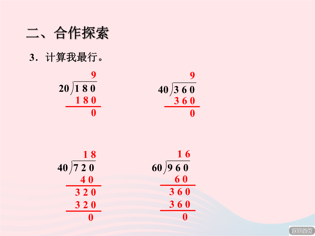 收获的季节——笔算(二)一、情境导入平均每个同学摘了多少筐?二、合作探索二、合作探索平均每个家长摘了多少筐?二、合作探索二、合作探索二、合作探索二、合作探索三、自主练习三、自主练习四、回顾反思