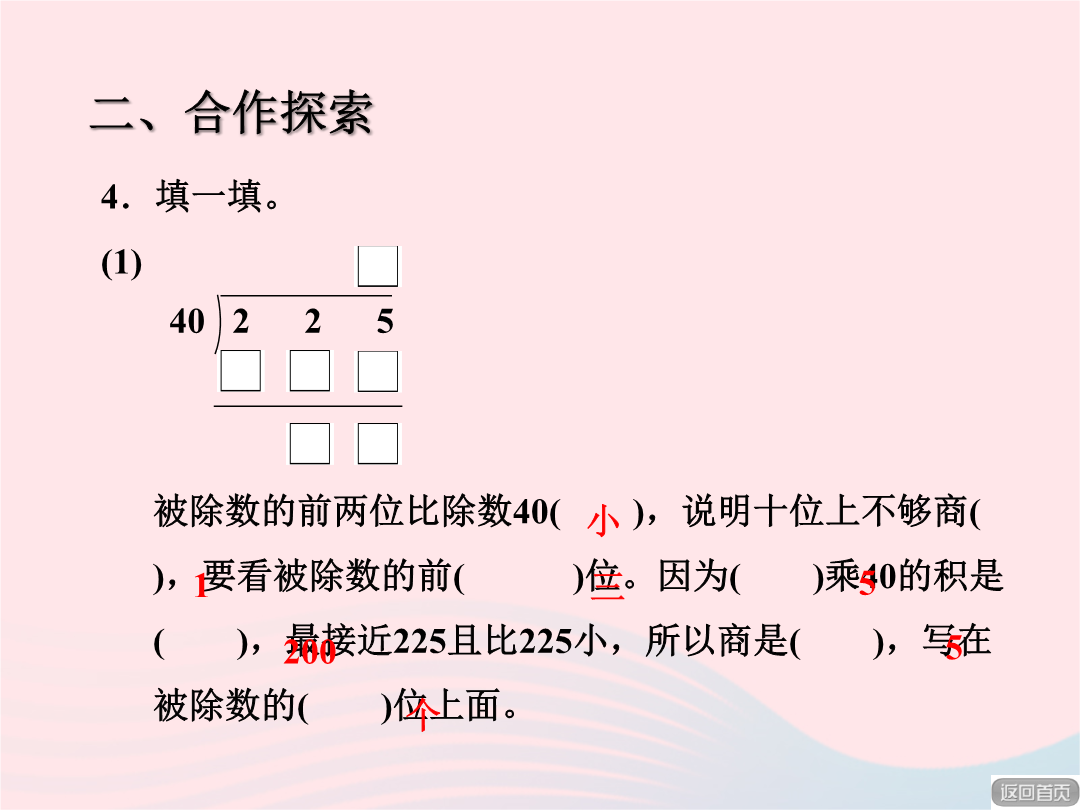 笔算除法(试商)试一试试一试(2)350÷50的商写在()位上。(3)计算30420,商是()位数,最高位在()位,商是()。(4)510÷30,510里面有()个十,30里面有()个十,51里面有()个3,510里面就有()个30。()位数()位数()位数()位数()位数()位数3.计算我最行。4.填一填。(1)(2)545÷90的商是(),余数是()。(3)在586÷40中,先商()位,商(),再商()位,商()。5.按要求计算。(1)先说出商是几位数,再计算。二、合作探索(2)列竖