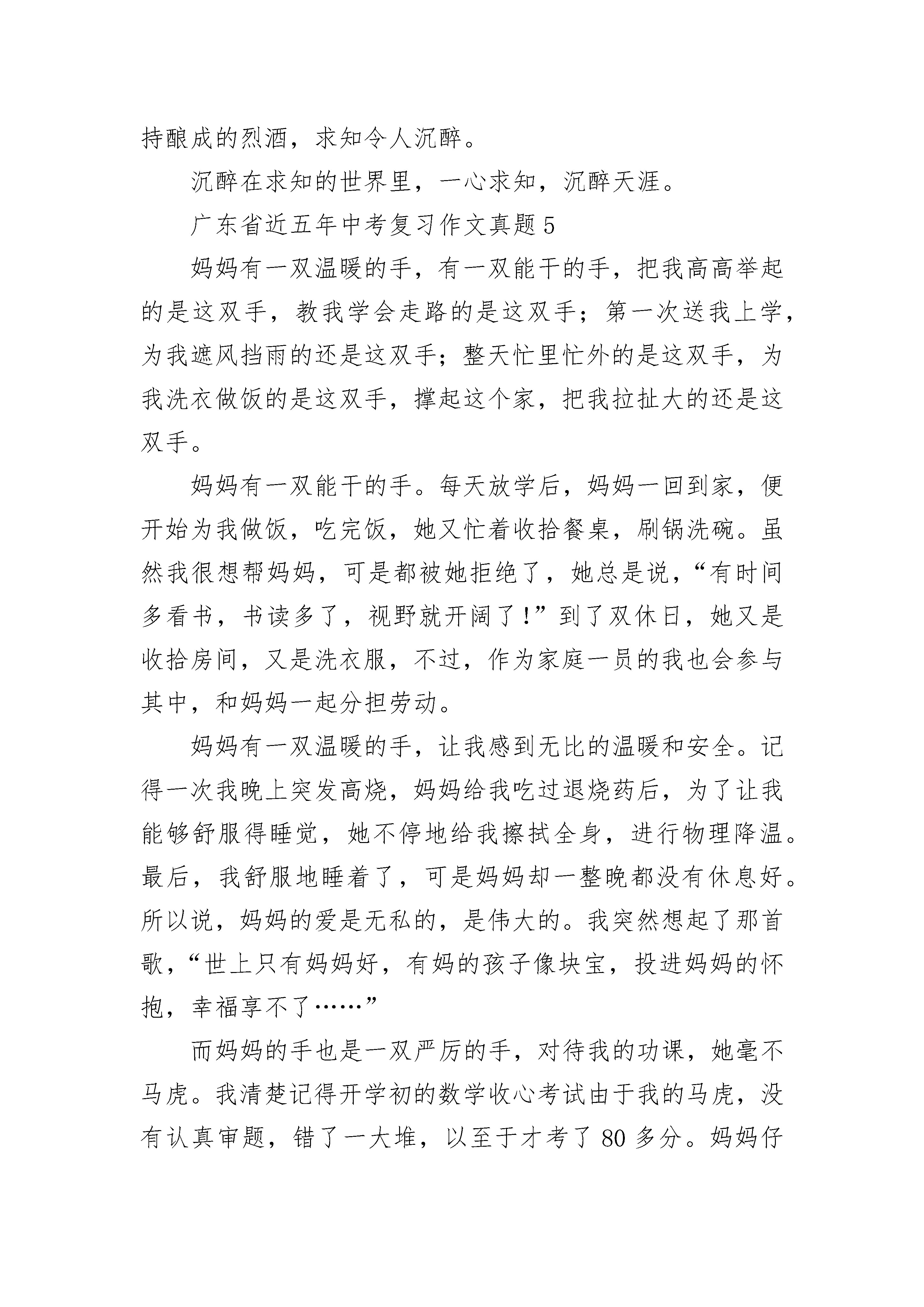广东省近五年中考复习作文真题每个人跟别人之间应该都产生过矛盾,我和家长之间也有矛盾,那就是我们总是不理解对方的话。经常我们都会发生这种事。记得有一次,我很晚很晚才回家,天都完全黑了,平时我是不会这么晚才回去的。好不容易等到了车,飞奔上去,巴不得这车快点,再快点。心想:“爸爸妈妈肯定都等急了,以前从没有这么晚过,再等一会儿妈妈肯定会急哭的!车啊,你快点啊!”下了车,我几乎可以说是“飞”回家的,平时差不多10分钟到家,今天4分钟就到了,我激动的打开家门才发现爸爸妈妈都板着脸了,我赶忙赔笑脸说到:“爸爸妈妈