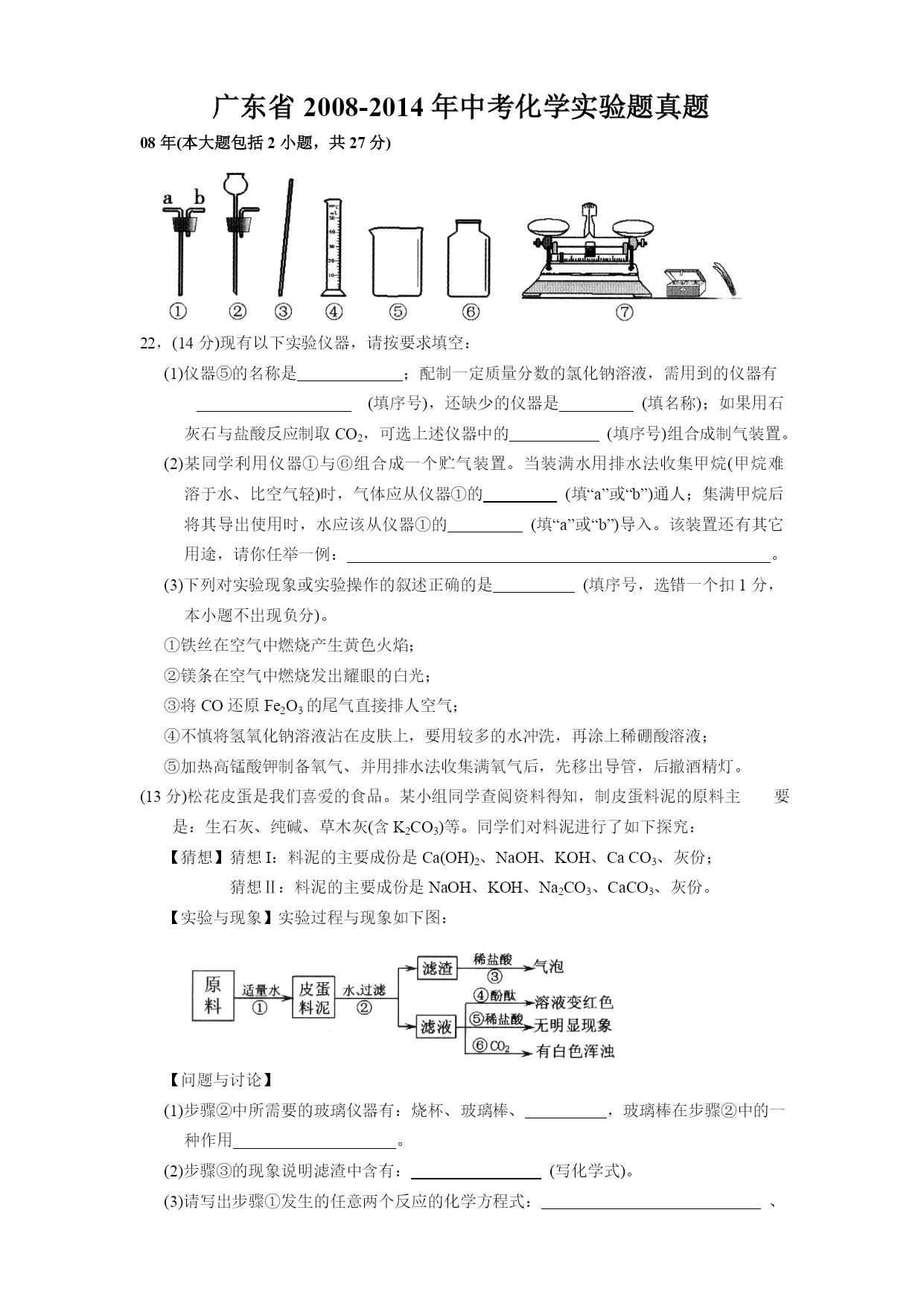 广东省2008-2014年中考化学实验题真题08年(本大题包括2小题,共27分)22,(14分)现有以下实验仪器,请按要求填空:(1)仪器⑤的名称是;配制一定质量分数的氯化钠溶液,需用到的仪器有(填序号),还缺少的仪器是(填名称);如果用石灰石与盐酸反应制取CO2,可选上述仪器中的(填序号)组合成制气装置。(2)某同学利用仪器①与⑥组合成一个贮气装置。当装满水用排水法收集甲烷(甲烷难溶于水、比空气轻)时,气体应从仪器①的(填“a”或“b”)通人;集满甲烷后将其导出使用时,水应该从仪器①的(填“a”或“b”