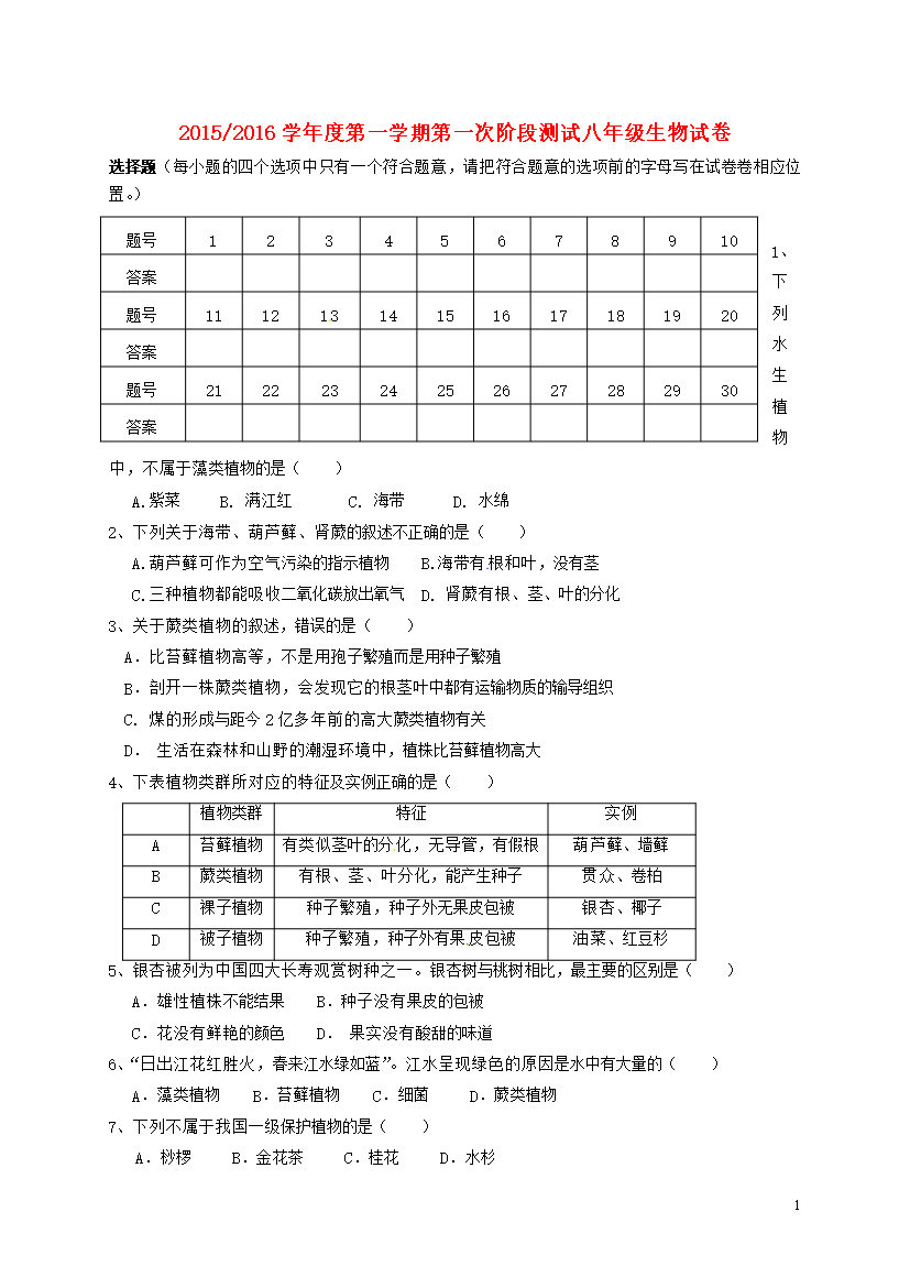 552015/2016学年度第一学期第一次阶段测试八年级生物试卷选择题(每小题的四个选项中只有一个符合题意请把符合题意的选项前的字母写在试卷卷相应位置。)题号12345678910答案题号11121314151617181920答案题号21222324252627282930答案1、下列水生植物中不属于藻类植物的是()A.紫菜B.满江红C.海带D.水绵2、下列关于海带、葫芦藓、肾蕨的叙述不正确的是()A.葫芦藓可作为空气污染的指示植物B.海带有根和