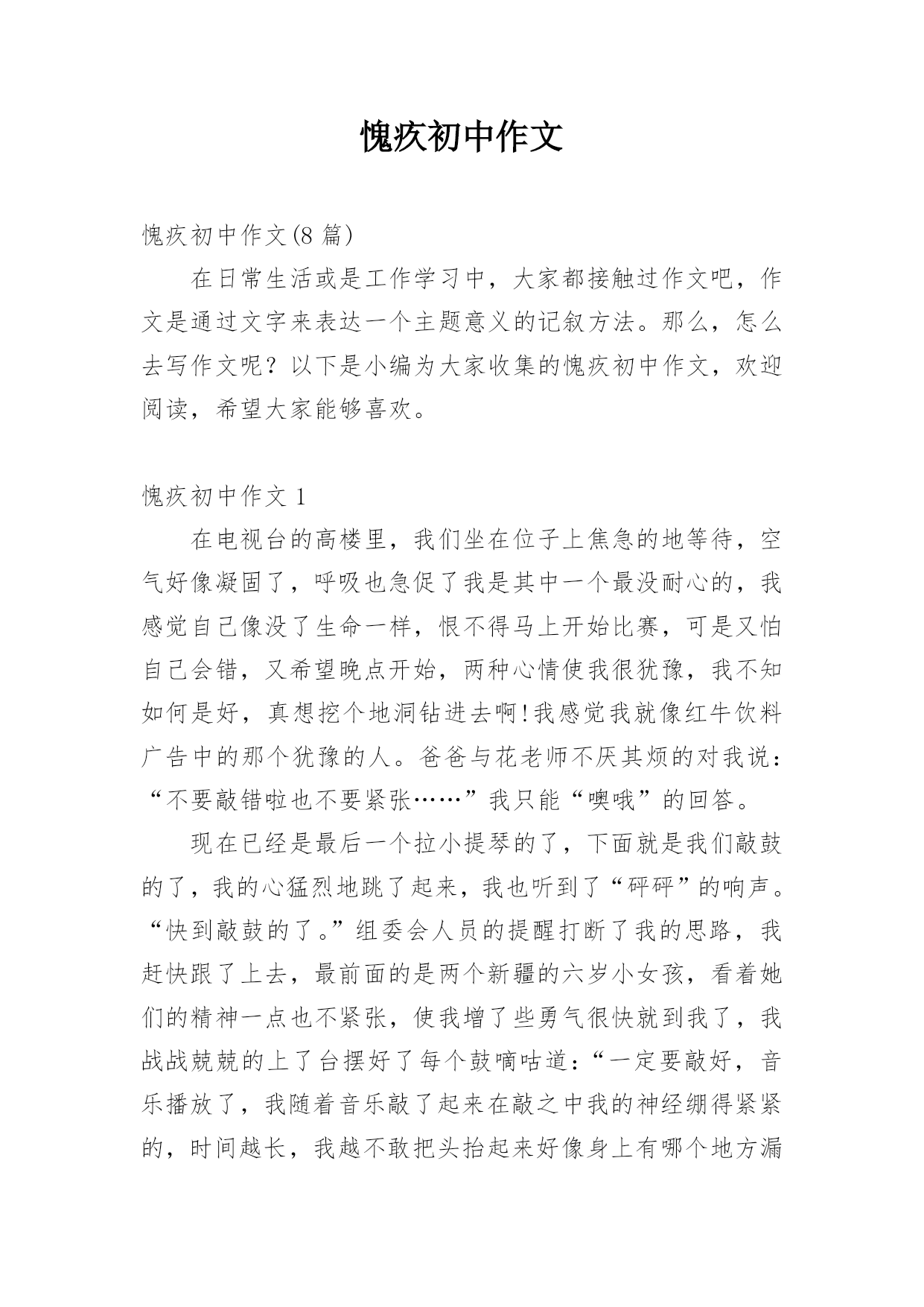 愧疚初中作文愧疚初中作文(8篇)在日常生活或是工作学习中,大家都接触过作文吧,作文是通过文字来表达一个主题意义的记叙方法。那么,怎么去写作文呢?以下是小编为大家收集的愧疚初中作文,欢迎阅读,希望大家能够喜欢。愧疚初中作文1在电视台的高楼里,我们坐在位子上焦急的地等待,空气好像凝固了,呼吸也急促了我是其中一个最没耐心的,我感觉自己像没了生命一样,恨不得马上开始比赛,可是又怕自己会错,又希望晚点开始,两种心情使我很犹豫,我不知如何是好,真想挖个地洞钻进去啊!我感觉我就像红牛饮料广告中的那个犹豫的人。爸爸与花老