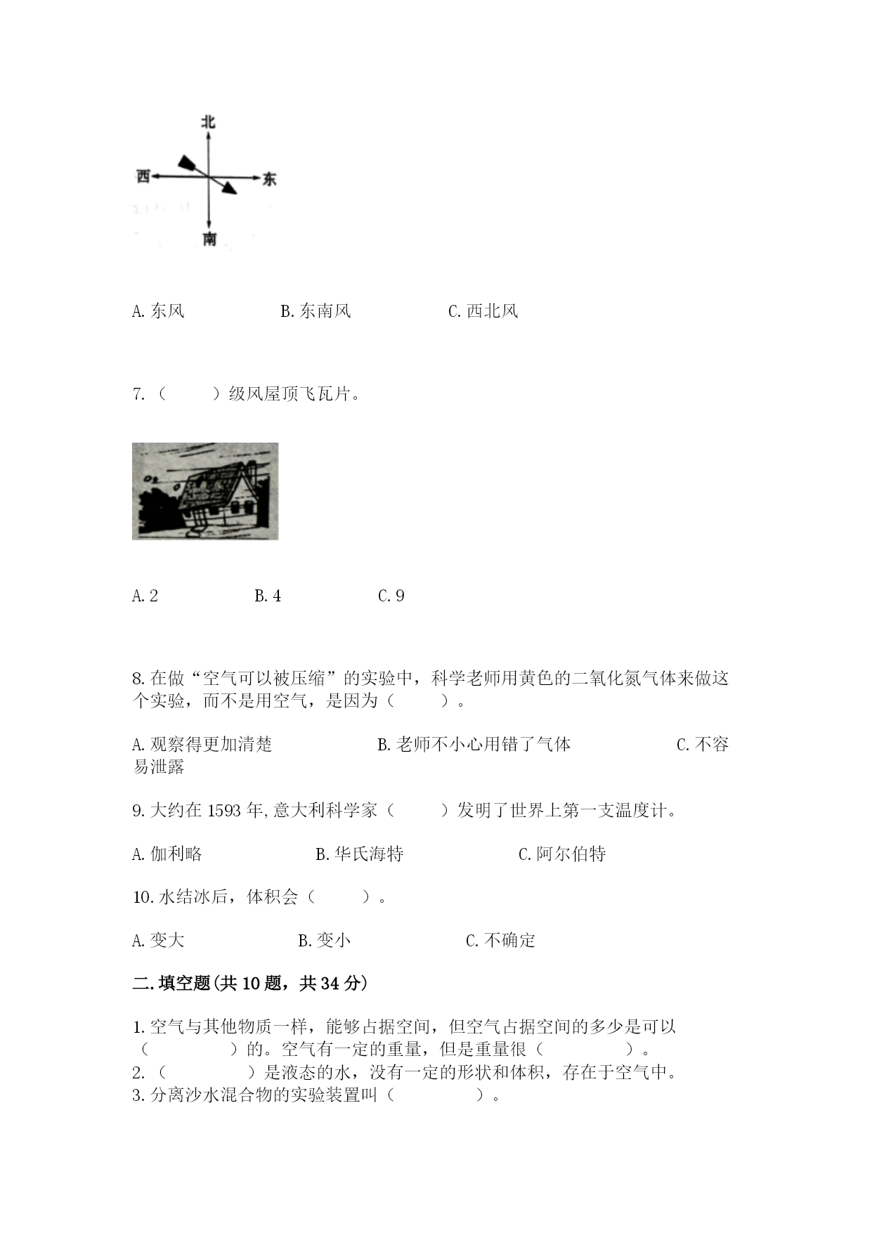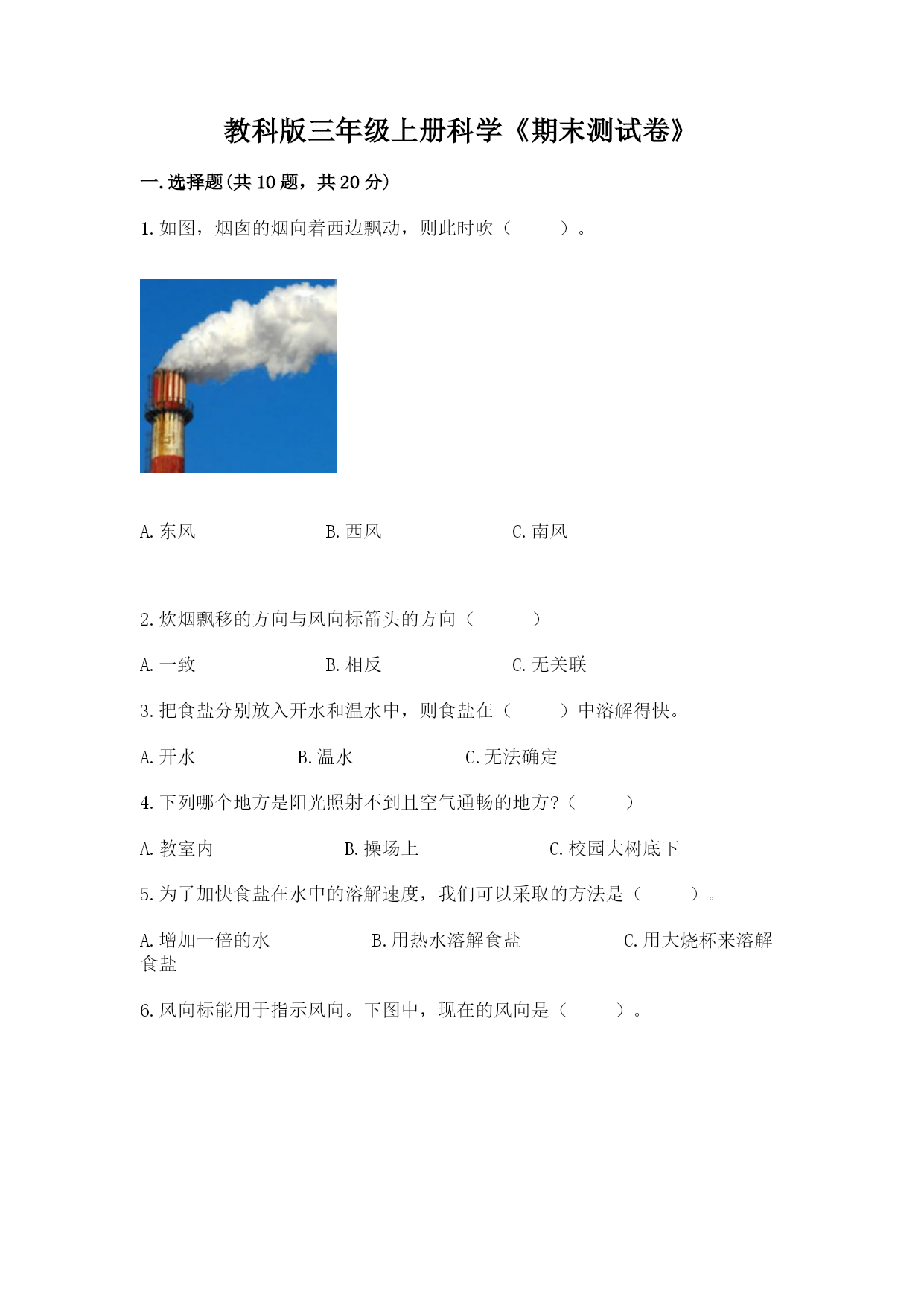 教科版三年级上册科学《期末测试卷》一.选择题(共10题,共20分)1.如图,烟囱的烟向着西边飘动,则此时吹()。A.东风B.西风C.南风2.炊烟飘移的方向与风向标箭头的方向()A.一致B.相反C.无关联3.把食盐分别放入开水和温水中,则食盐在()中溶解得快。A.开水B.温水C.无法确定4.下列哪个地方是阳光照射不到且空气通畅的地方?()A.教室内B.操场上C.校园大树底下5.为了加快食盐在水中的溶解速度,我们可以采取的方法是()。A.增加一倍的水B.用热水溶解食盐C.用大烧杯来溶解食盐6.风向标能用于指示