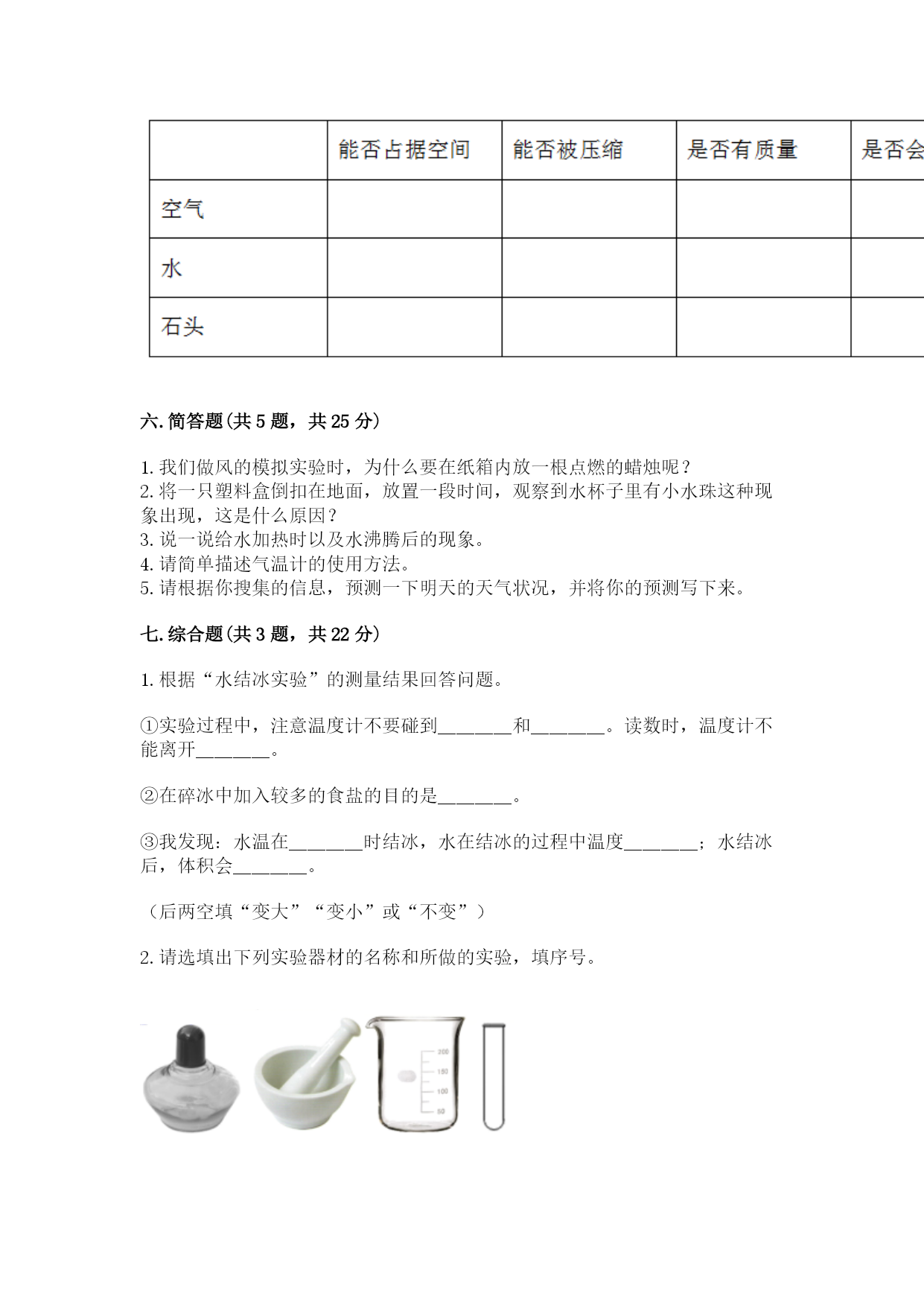 教科版三年级上册科学《期末测试卷》一.选择题(共10题,共20分)1.下列说法错误的是()。A.水有三种形态:固态、液态和气态B.露是液态的水,雾是气态的水,霜是固态的水C.湿衣服晾在阳光下比晾在阴凉处干得快,是因为温度高的地方水蒸发得快2.我们通过实验,50毫升水大约能溶解()克食盐。A.2B.18C.353.气温的单位是()。A.摄氏度B.毫米C.毫升4.下面使用温度计的方法正确的是()。A.B.C.5.河里的水一直流不完,这是因为()。A.地球公转B.地球自转C.水的循环6.用打气筒往一个充有空气的