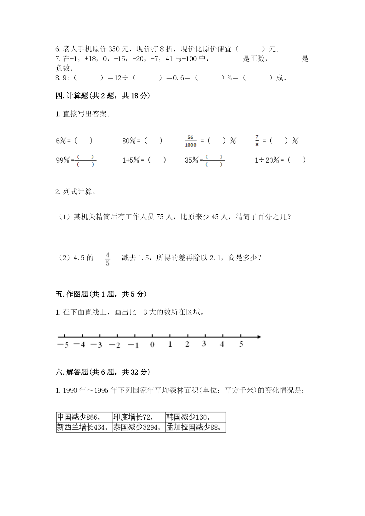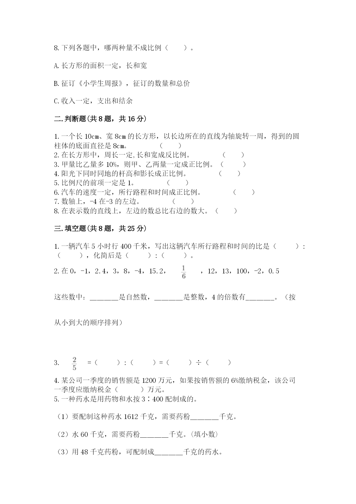 数学小升初期末测试卷一.选择题(共6题,共12分)1.小英把1000元按年利率2.25%存入银行,两年后,她应得本金和利息一共多少元?正确的列式是()。A.1000×2.25%B.(1000+2.25%×1000)×2C.1000×2.25%×2+10002.下面比-2小的数是()。A.-3B.-1C.0D.23.圆的面积与它的半径的平方()。A.不成比例B.成反比例C.成正比例4.2020年,小军的爸爸每月工资6000元,按规定收入超过5000元的部分按3%的税率缴纳个人所得税,小军的爸爸每月应缴纳个人