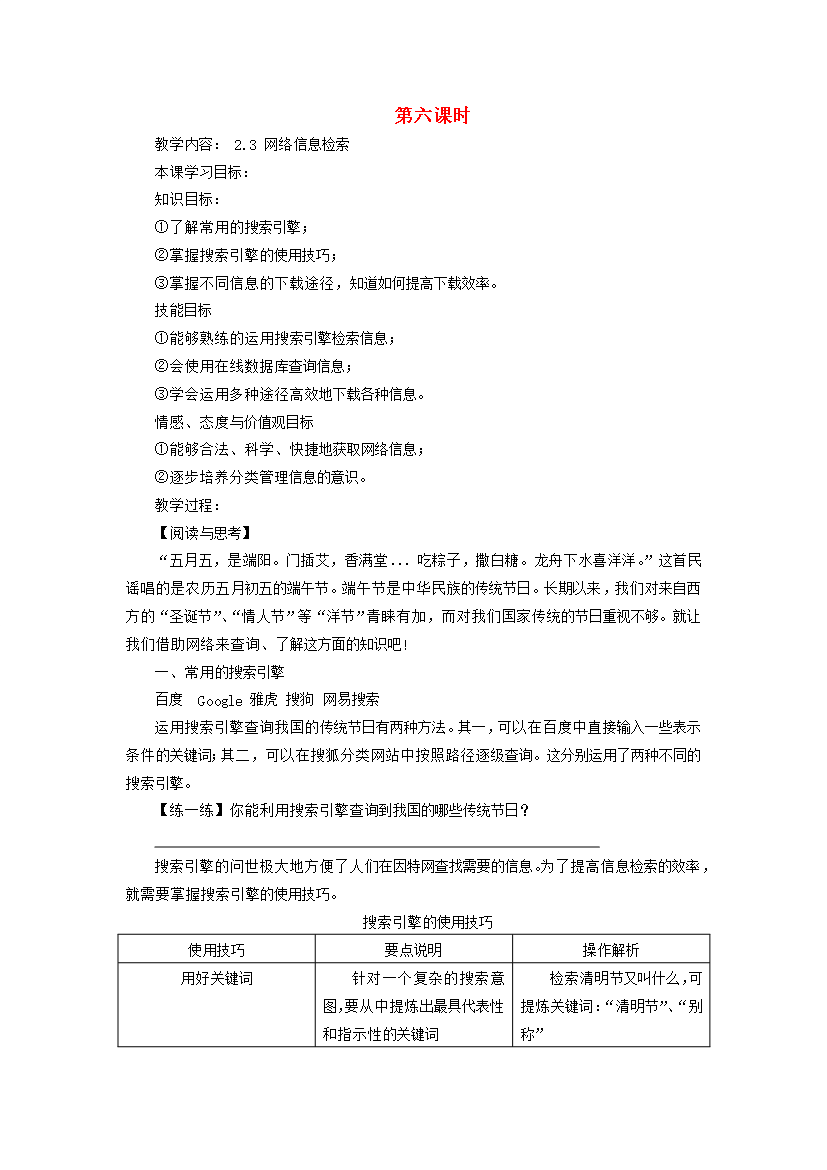 第六课时教学内容:2.3网络信息检索本课学习目标:知识目标:①了解常用的搜索引擎;②掌握搜索引擎的使用技巧;③掌握不同信息的下载途径,知道如何提高下载效率。技能目标①能够熟练的运用搜索引擎检索信息;②会使用在线数据库查询信息;③学会运用多种途径高效地下载各种信息。情感、态度与价值观目标①能够合法、科学、快捷地获取网络信息;②逐步培养分类管理信息的意识。教学过程:【阅读与思考】“五月五,是端阳。门插艾,香满堂...吃粽子,撒白糖。龙舟下水喜洋洋。”这首民谣唱的是农历五月初五的端午节。端午节是中华民族的传统节
